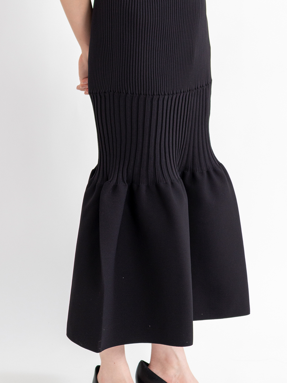 ストレッチ性の異なる2種類のリブを交互に編むことでユニークなシルエットを生み出しています。