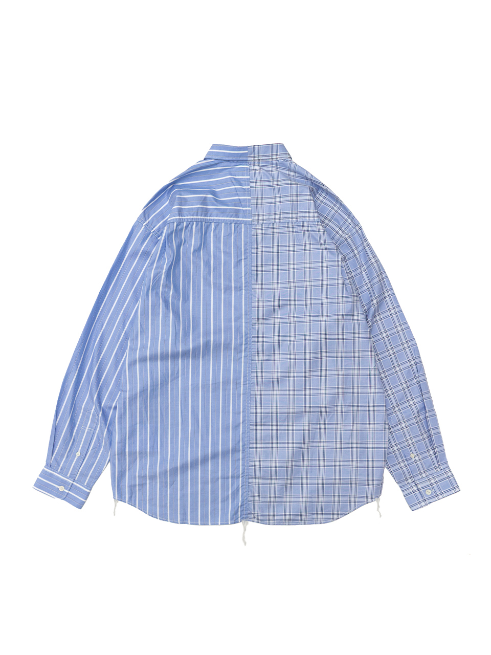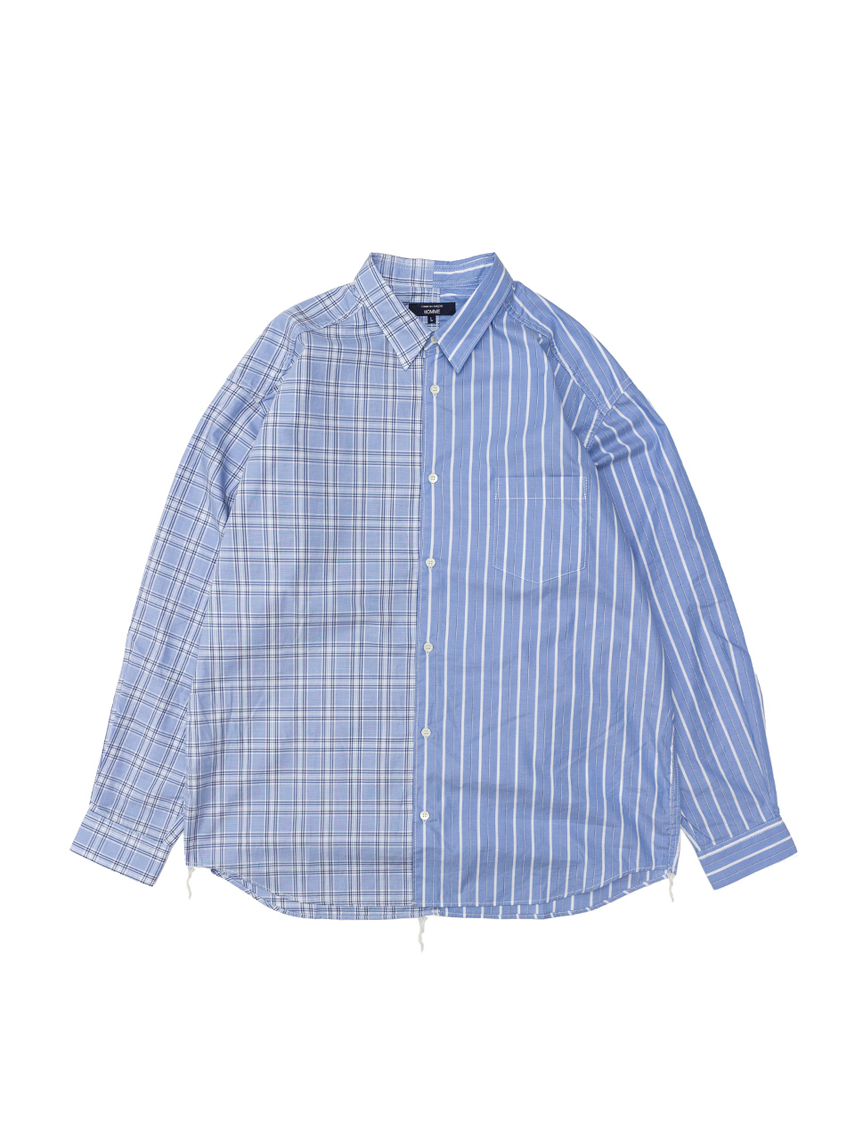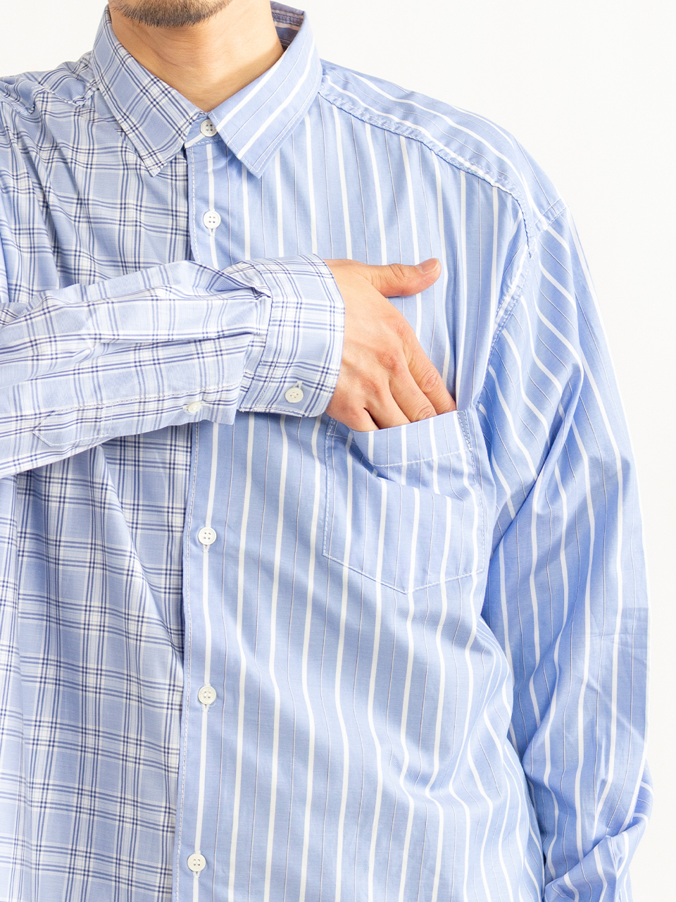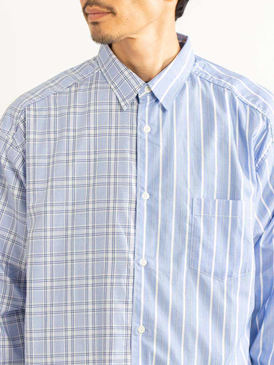左見頃のストライプ柄、右見頃のチェック柄をドッキングさせたCOMME des GARCONS HOMMEならではのデザインのレギュラーカラーシャツ。