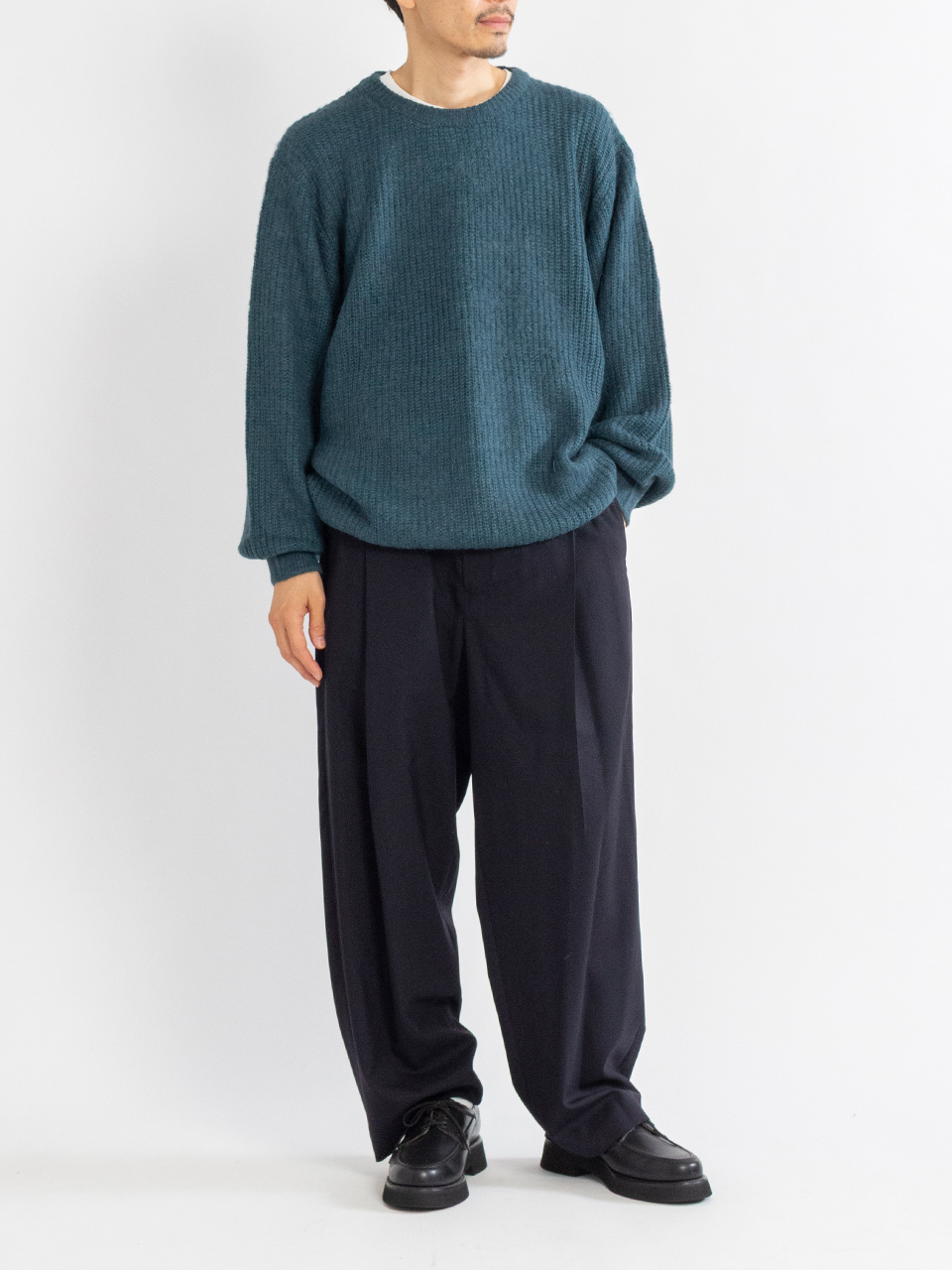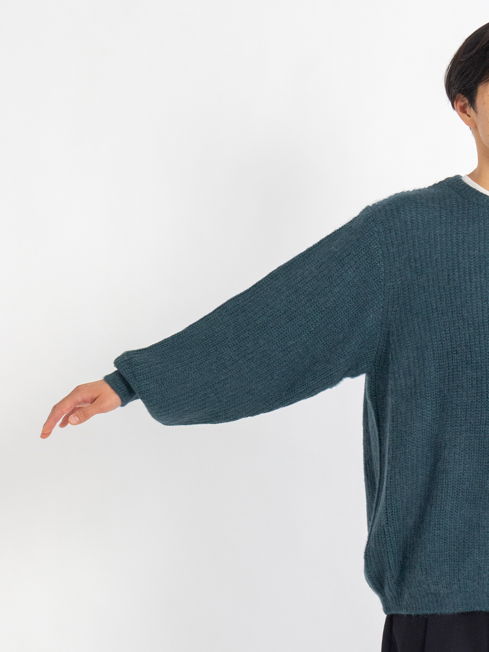 オーバーサイズのゆとりあるシルエットが特徴のクルーネックニット。