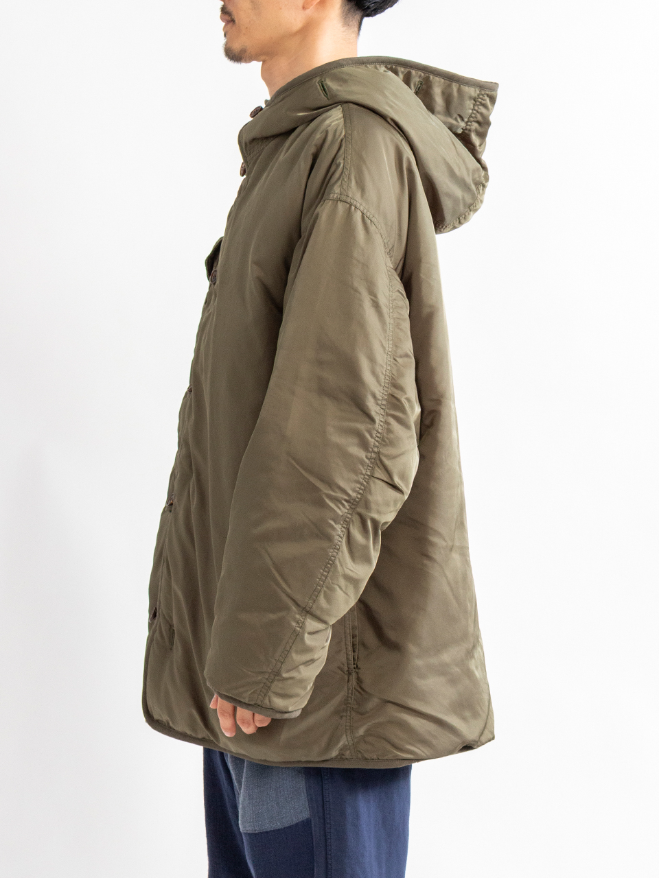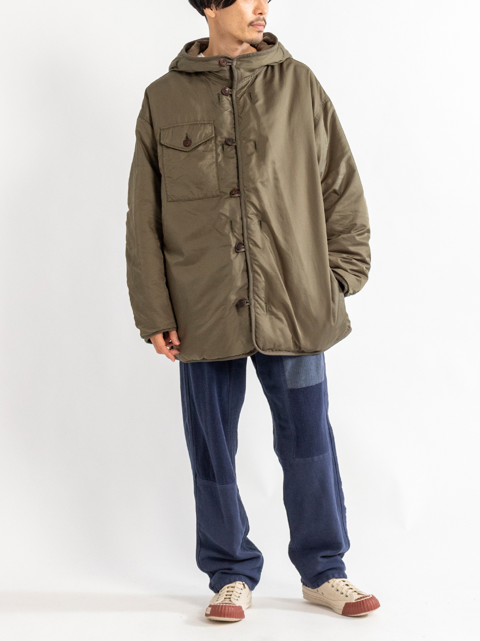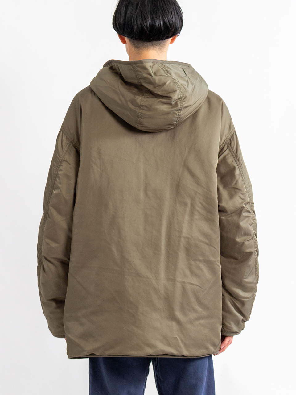 ゆったりとしたシルエットのフード付きリバーシブルダウンジャケット。