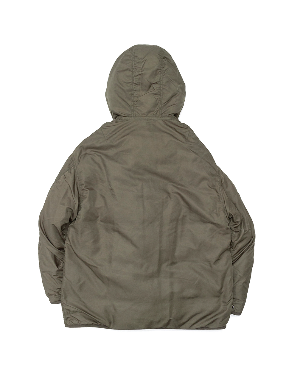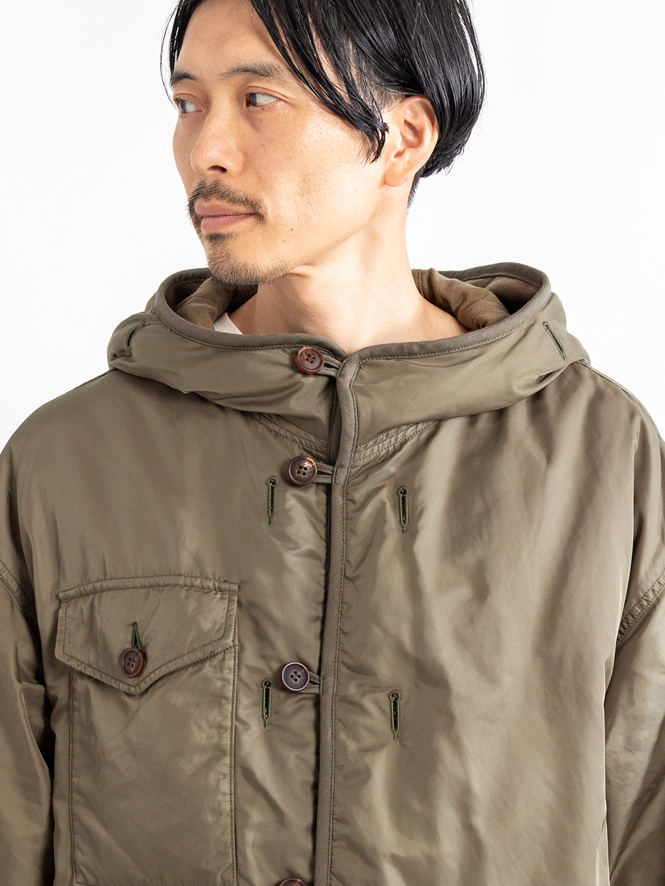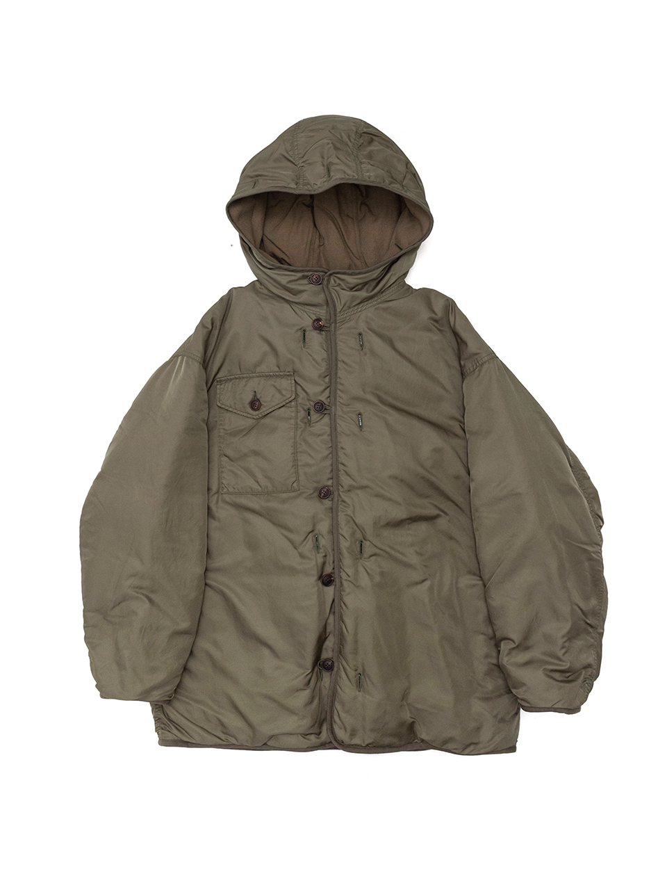 ゆったりとしたシルエットのフード付きリバーシブルダウンジャケット。