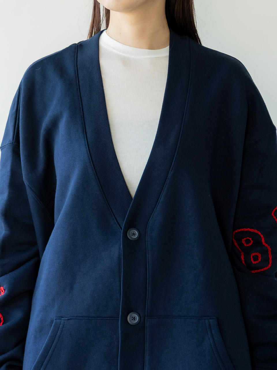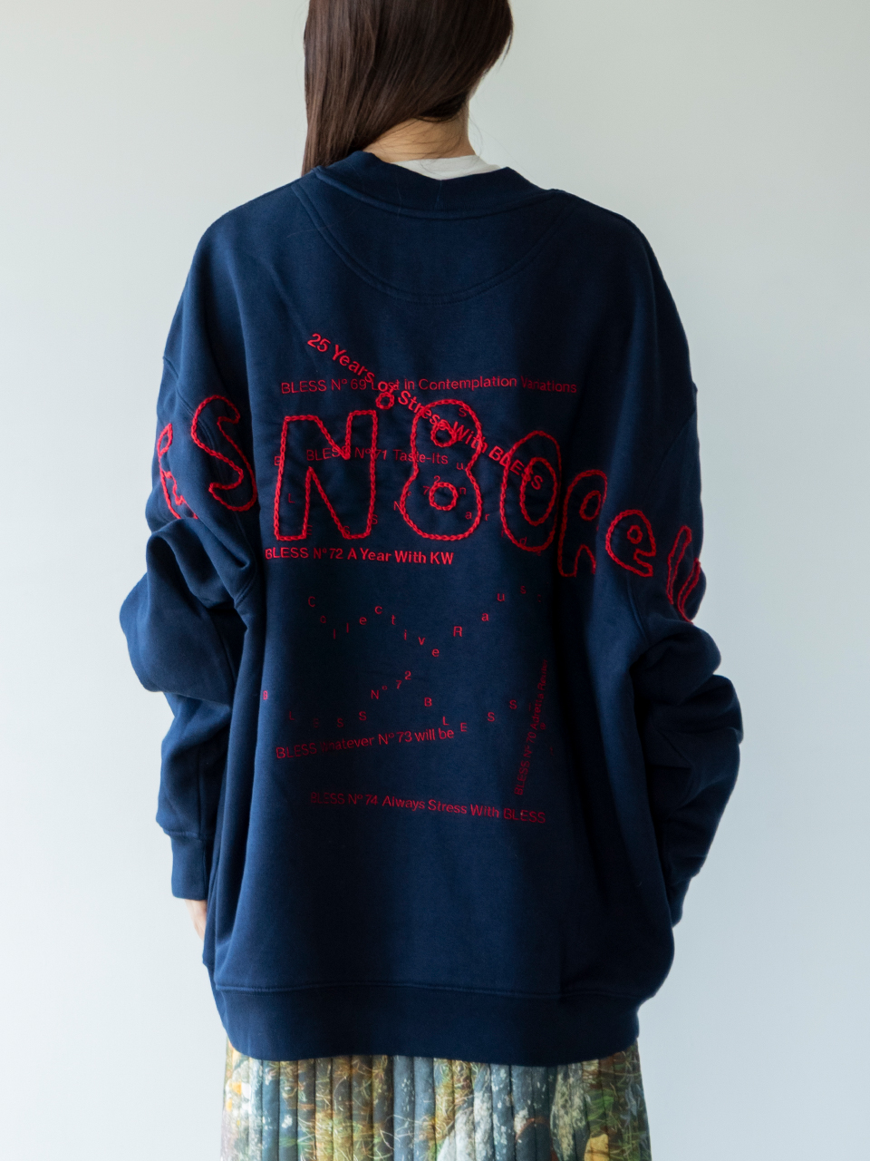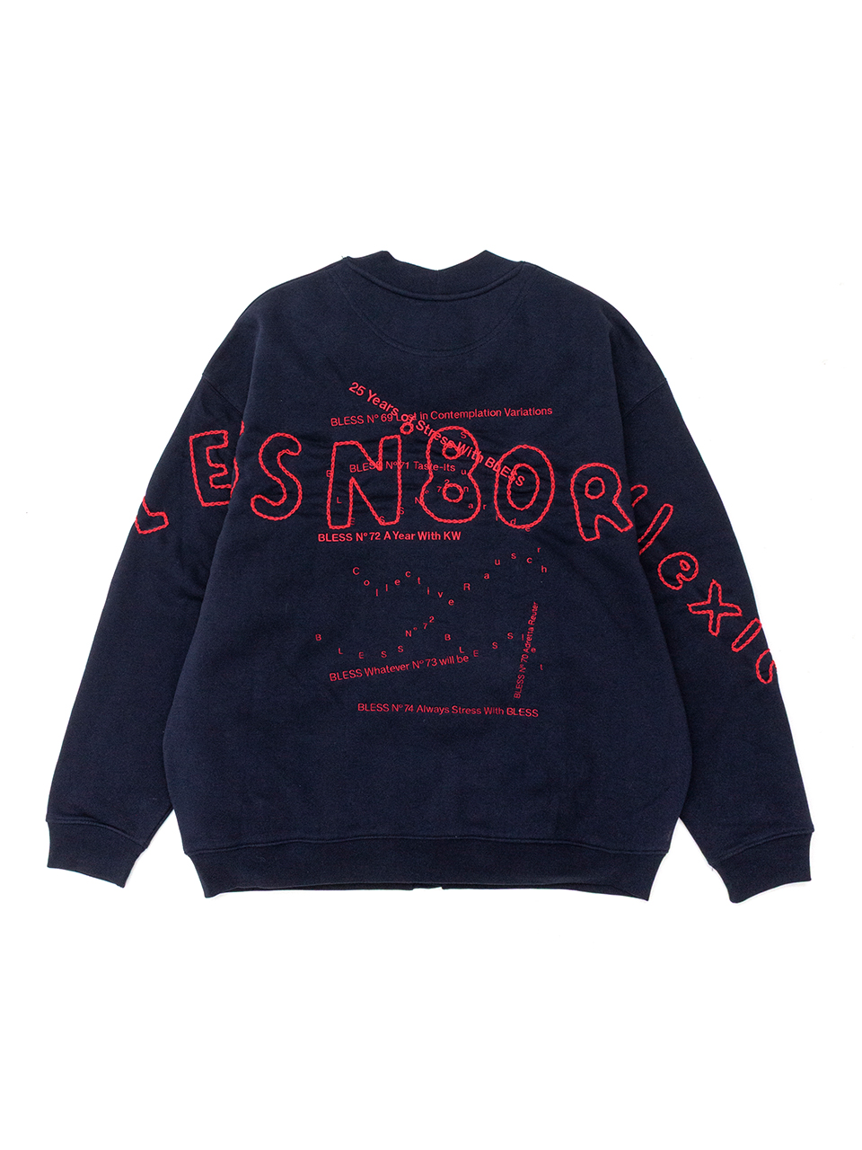 BLESSの「REFLEXIC MULTICOLLECTION SWEAT JACKET」は、ネイビーのボディに赤い刺繍ロゴがアクセントになったスウェットジャケット。