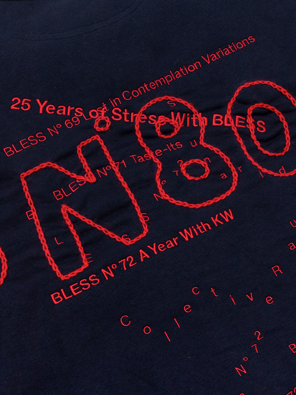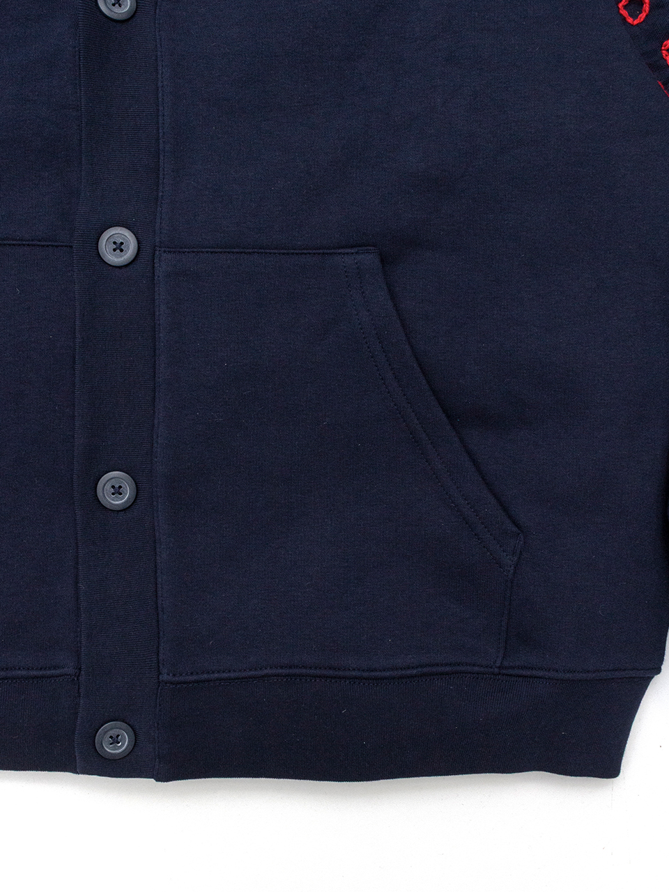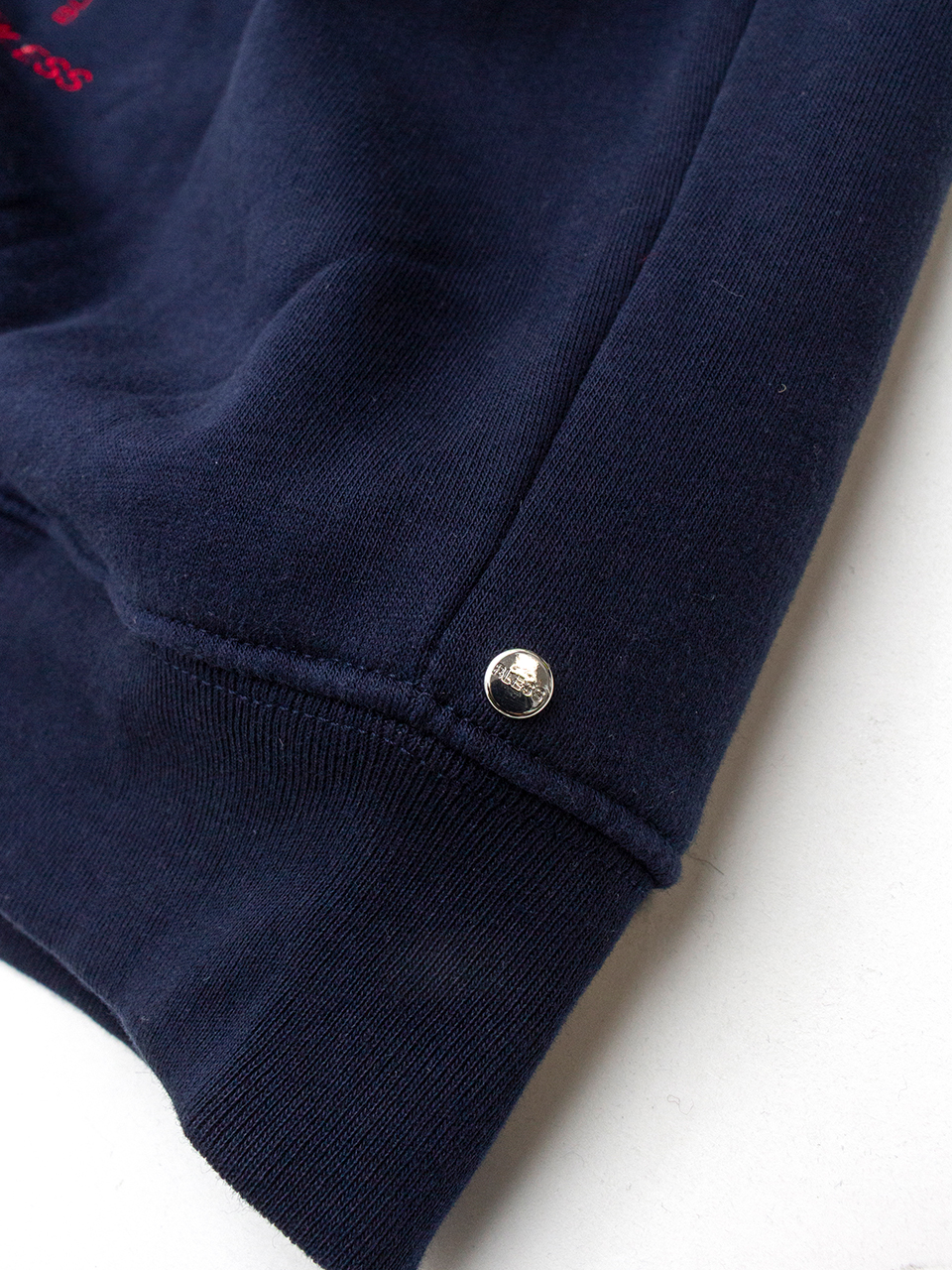 BLESSの「REFLEXIC MULTICOLLECTION SWEAT JACKET」は、ネイビーのボディに赤い刺繍ロゴがアクセントになったスウェットジャケット。
