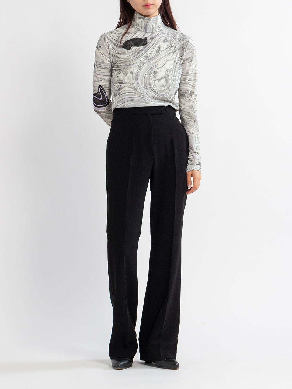 トリアセテートとポリエステルの特殊加工糸によってシルキーで滑らかなタッチの豊かな厚みが印象的な生地を使用したトラウザーズ。