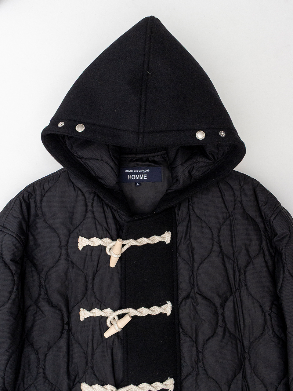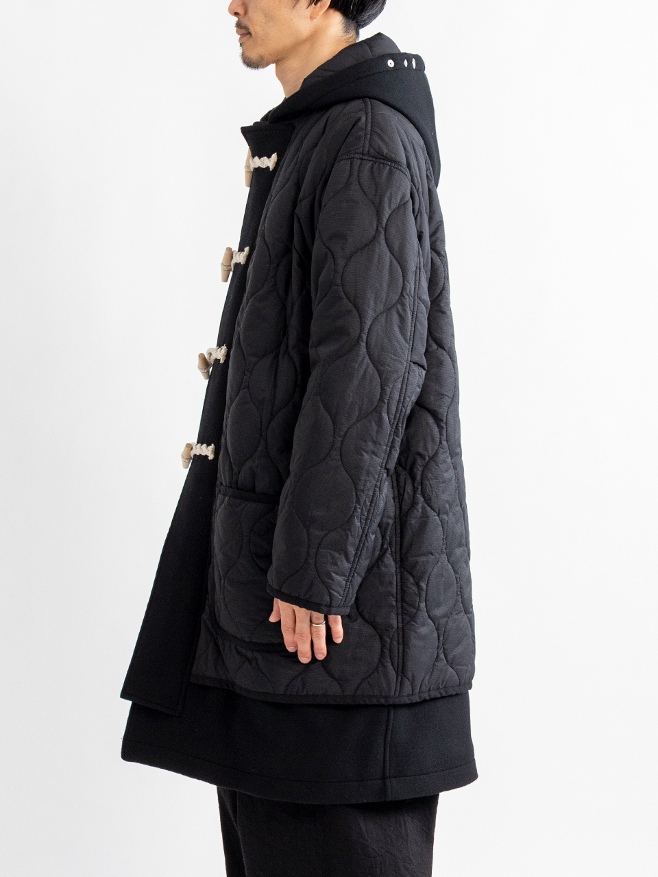 ウールメルトンとナイロンリップキルト素材のコンビネーションが特徴のダッフルコート。