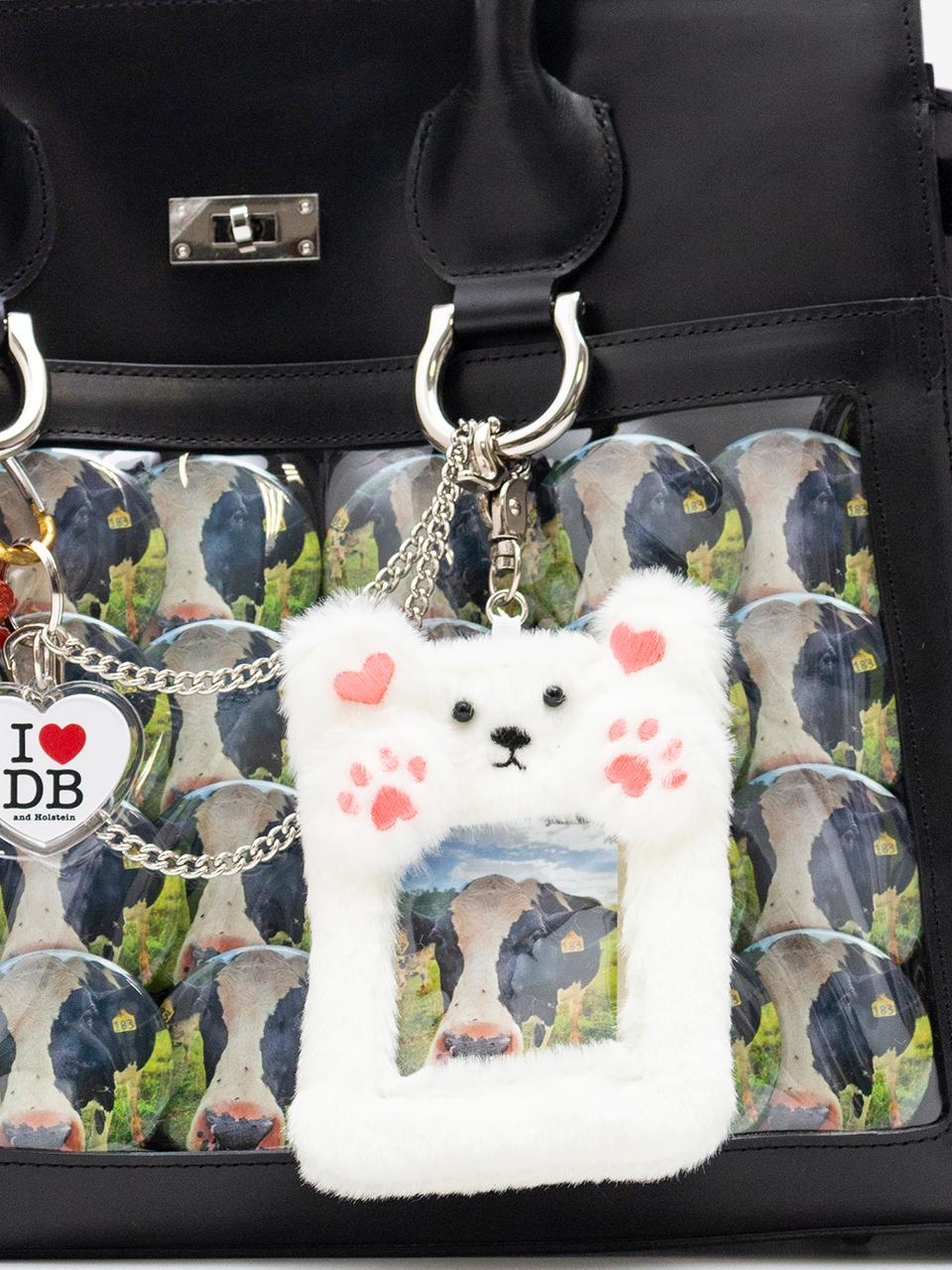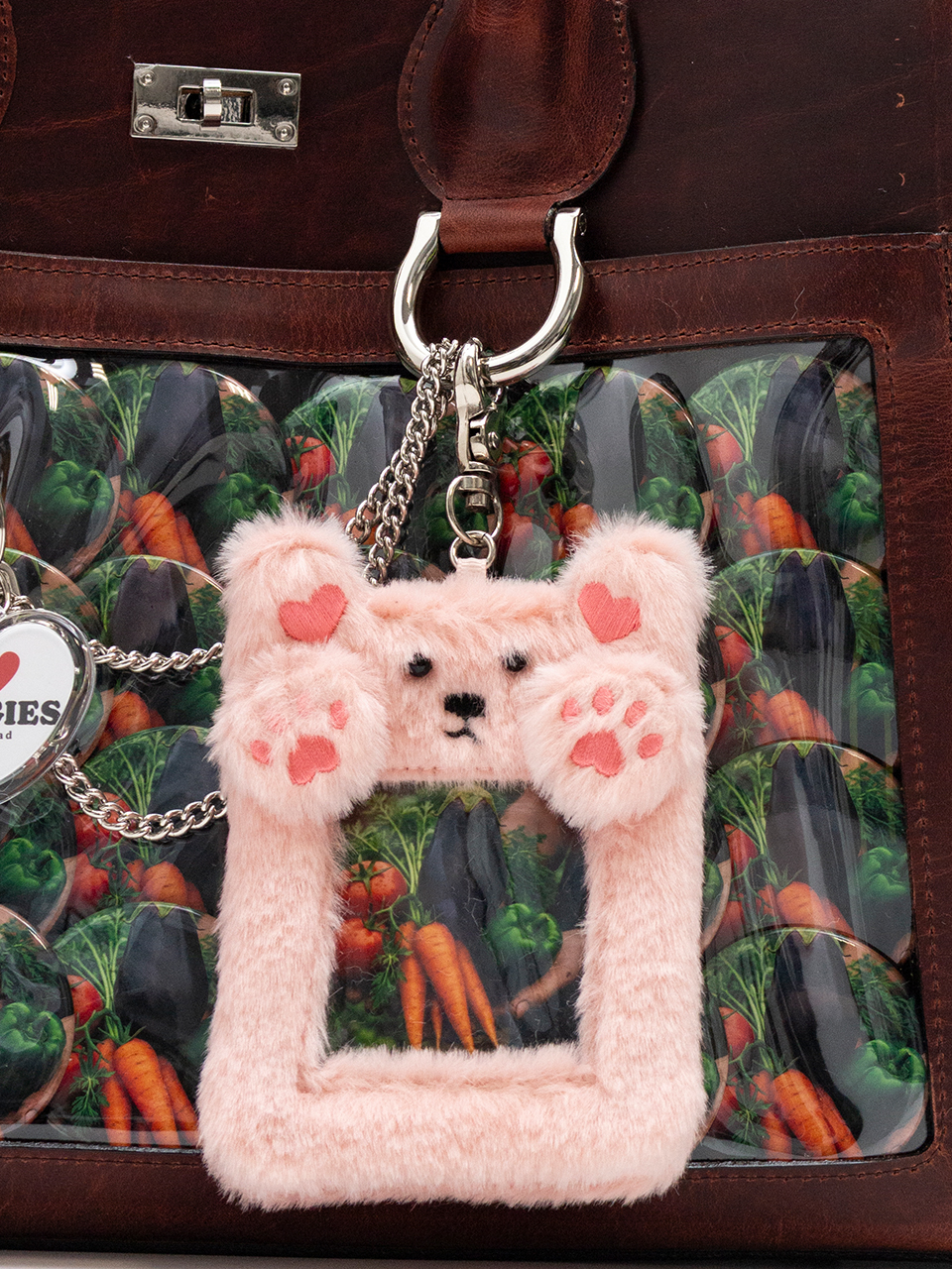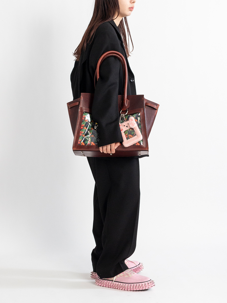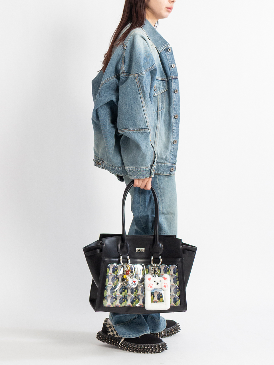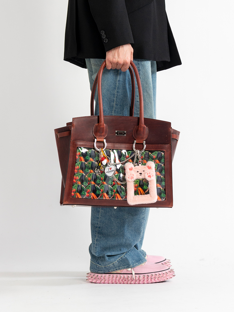 キーホルダーや缶バッジをたくさん飾り付けた「痛い」バッグ、通称“痛バッグ”をモチーフにしているレザーバッグ。