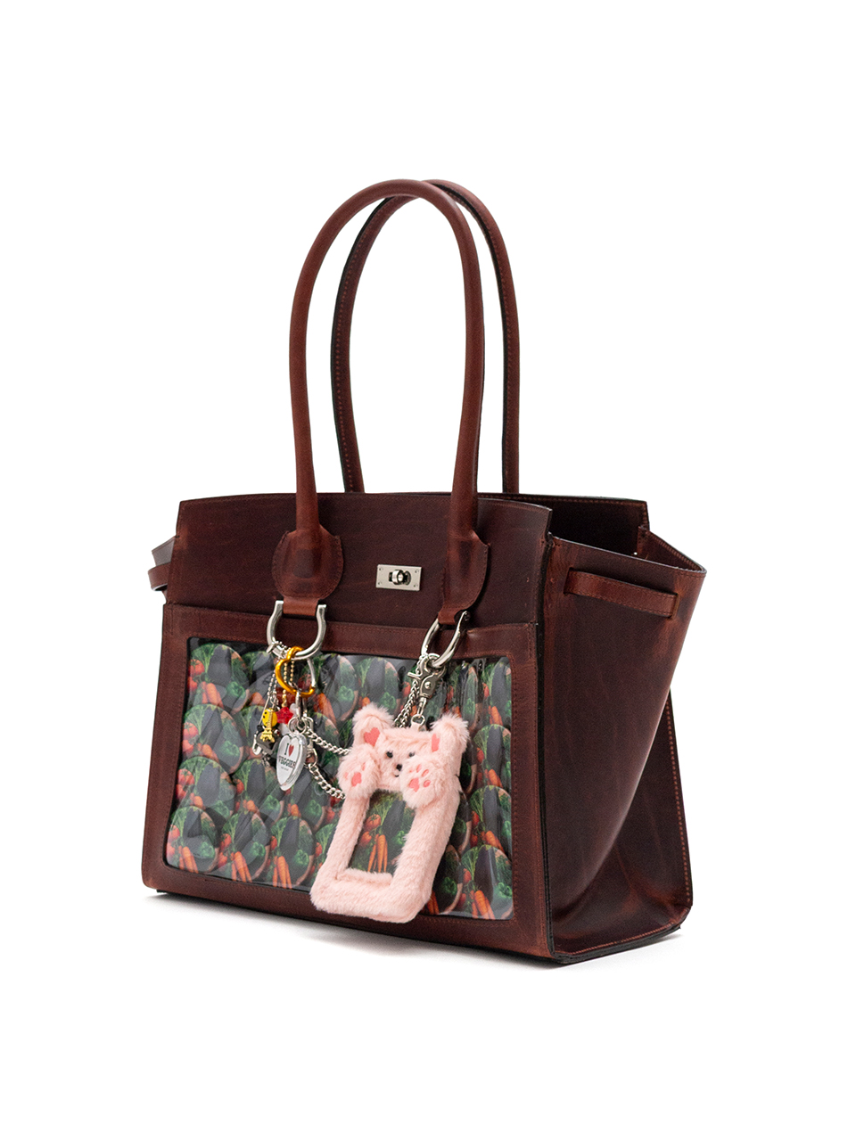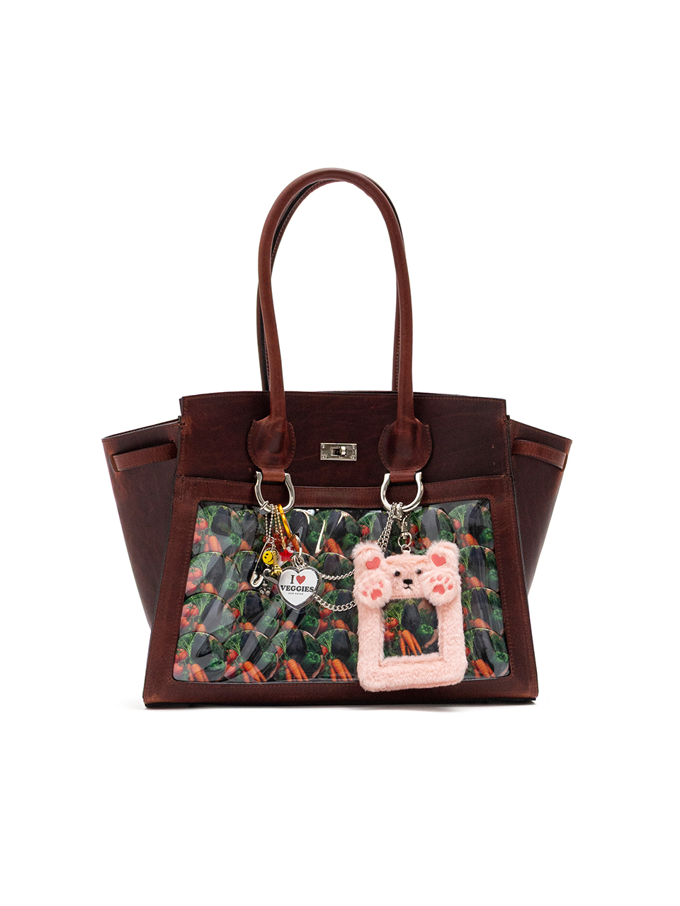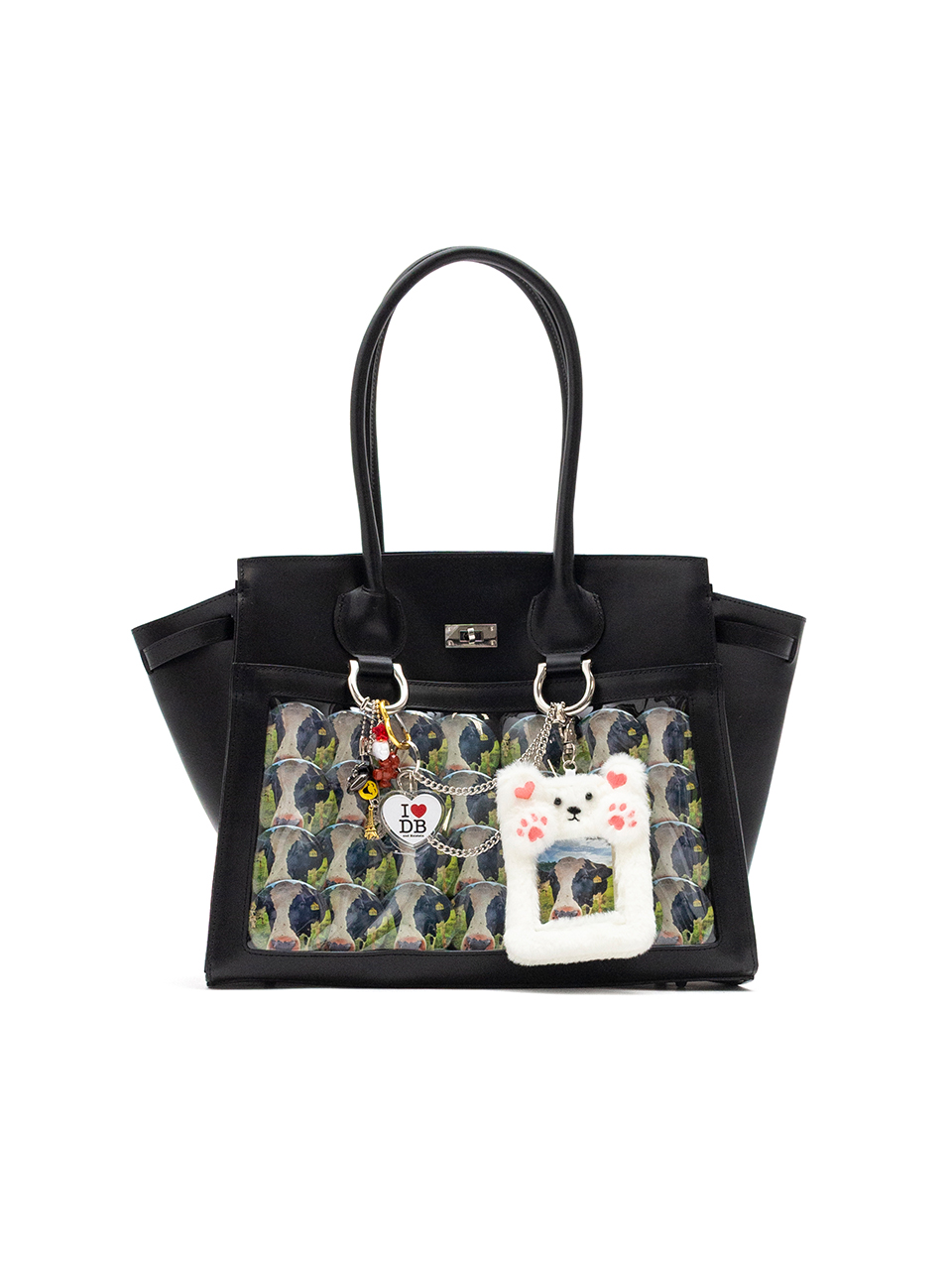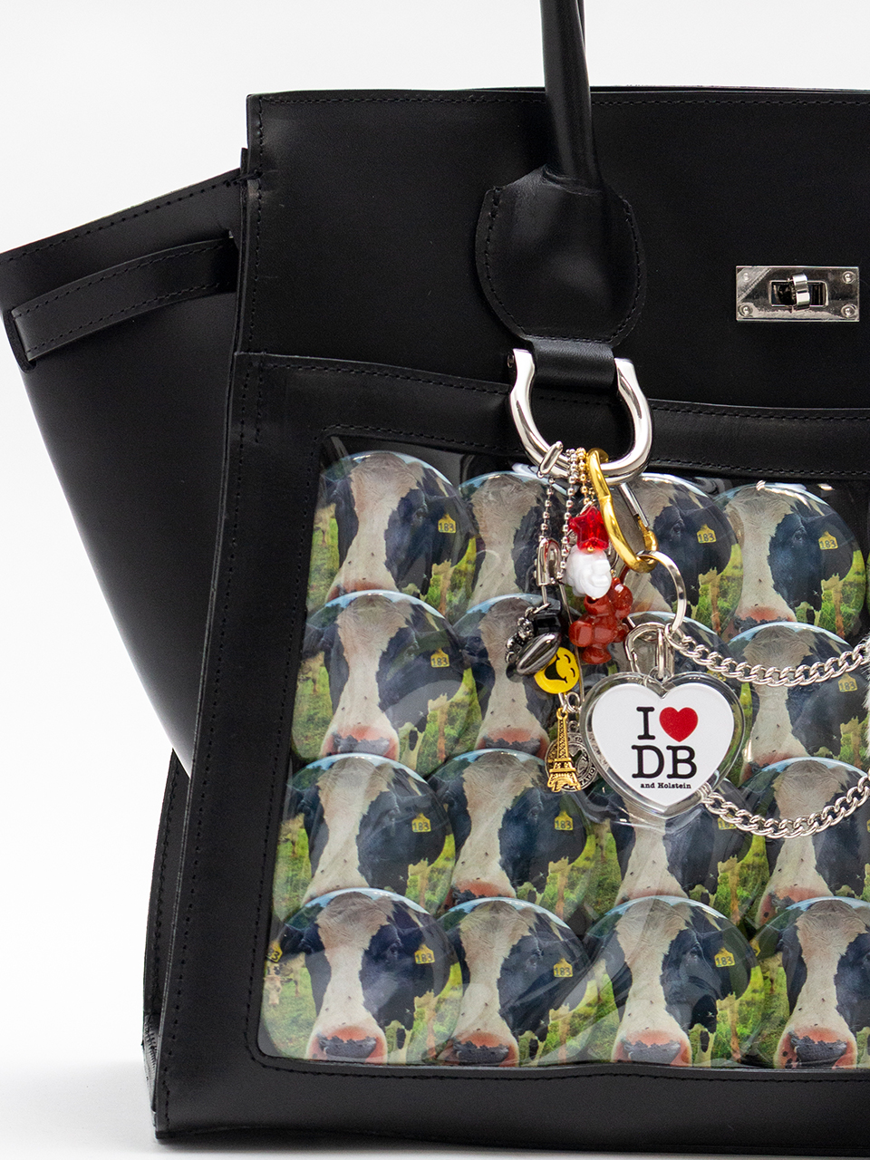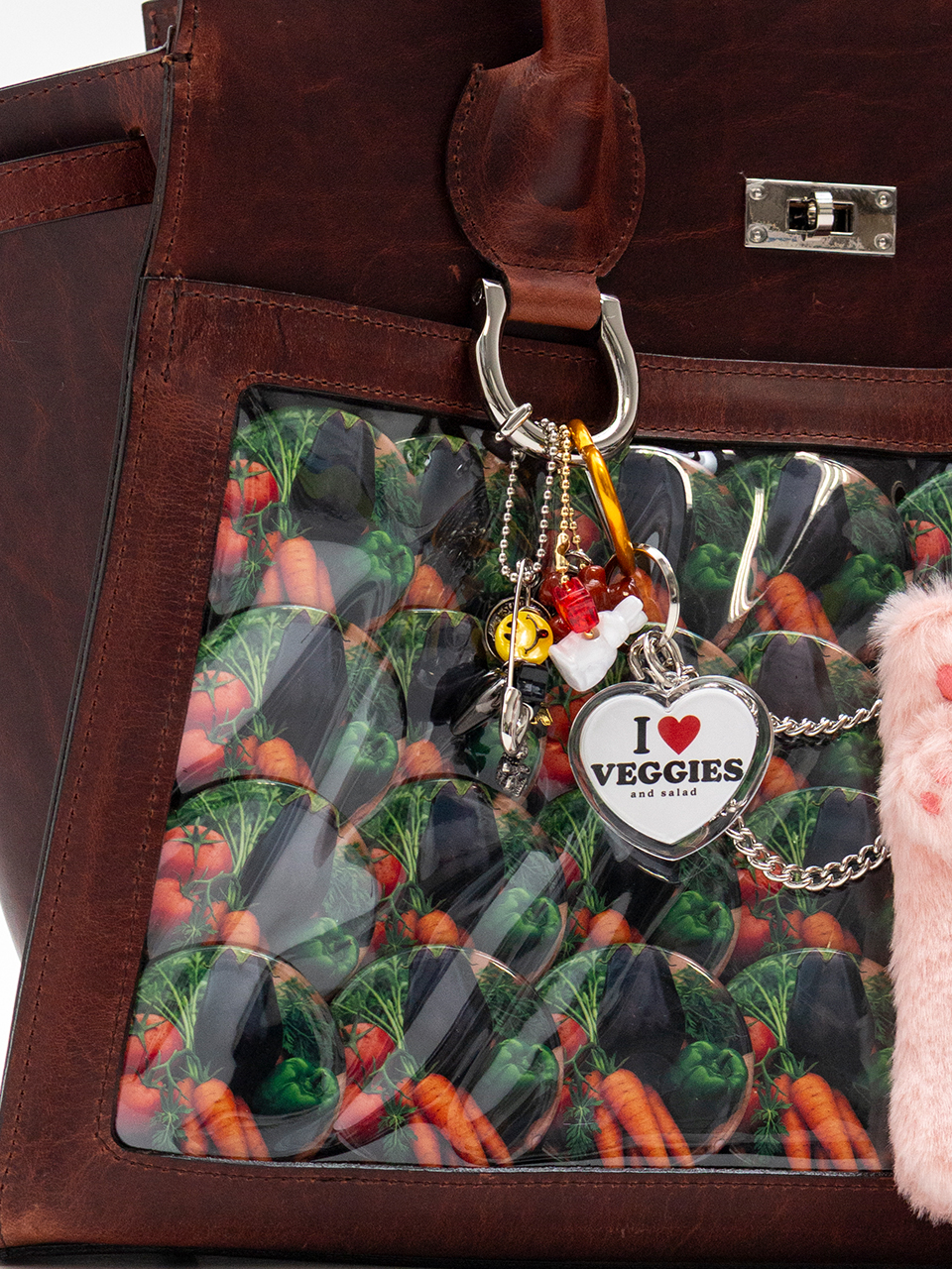 キーホルダーや缶バッジをたくさん飾り付けた「痛い」バッグ、通称“痛バッグ”をモチーフにしているレザーバッグ。