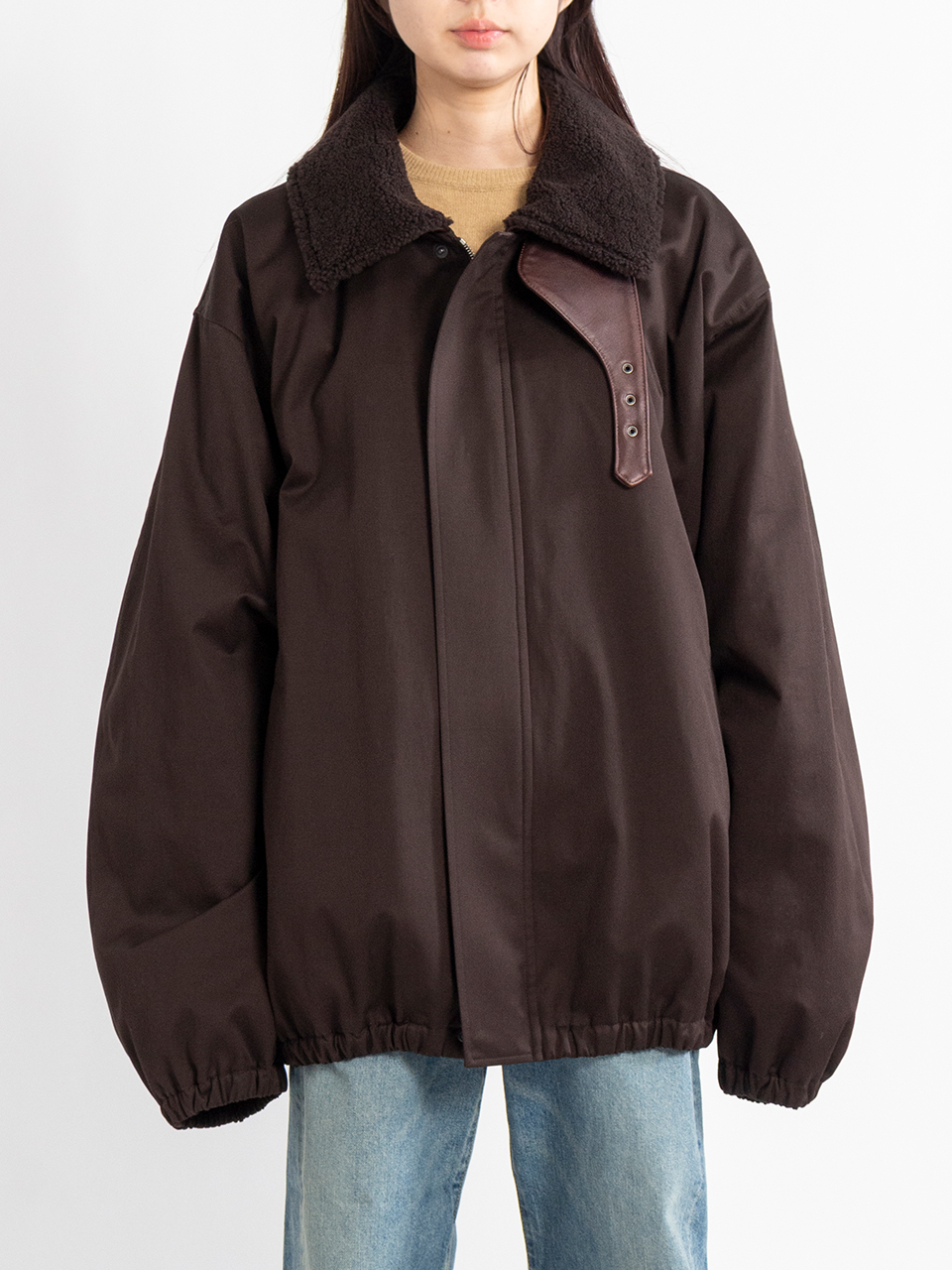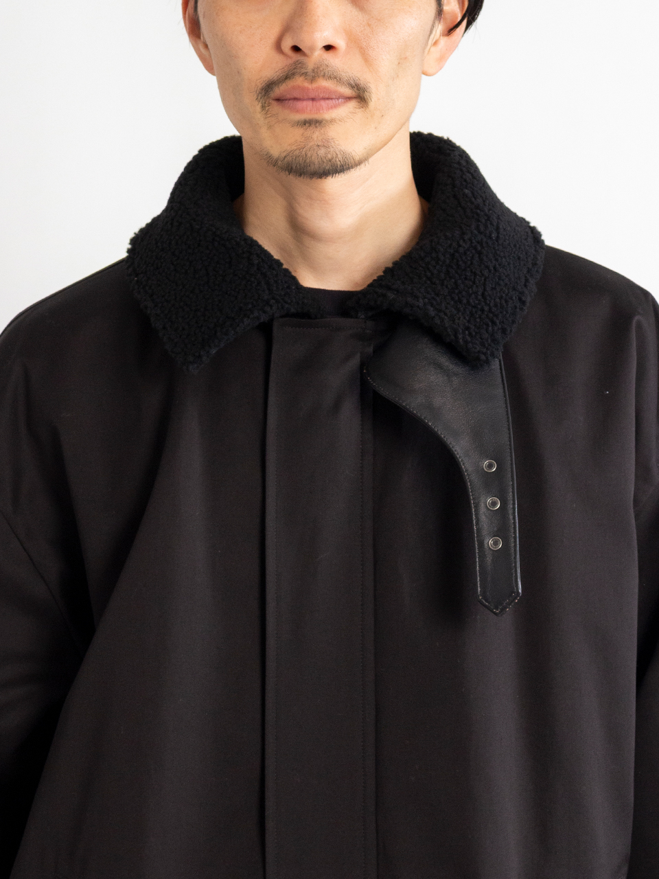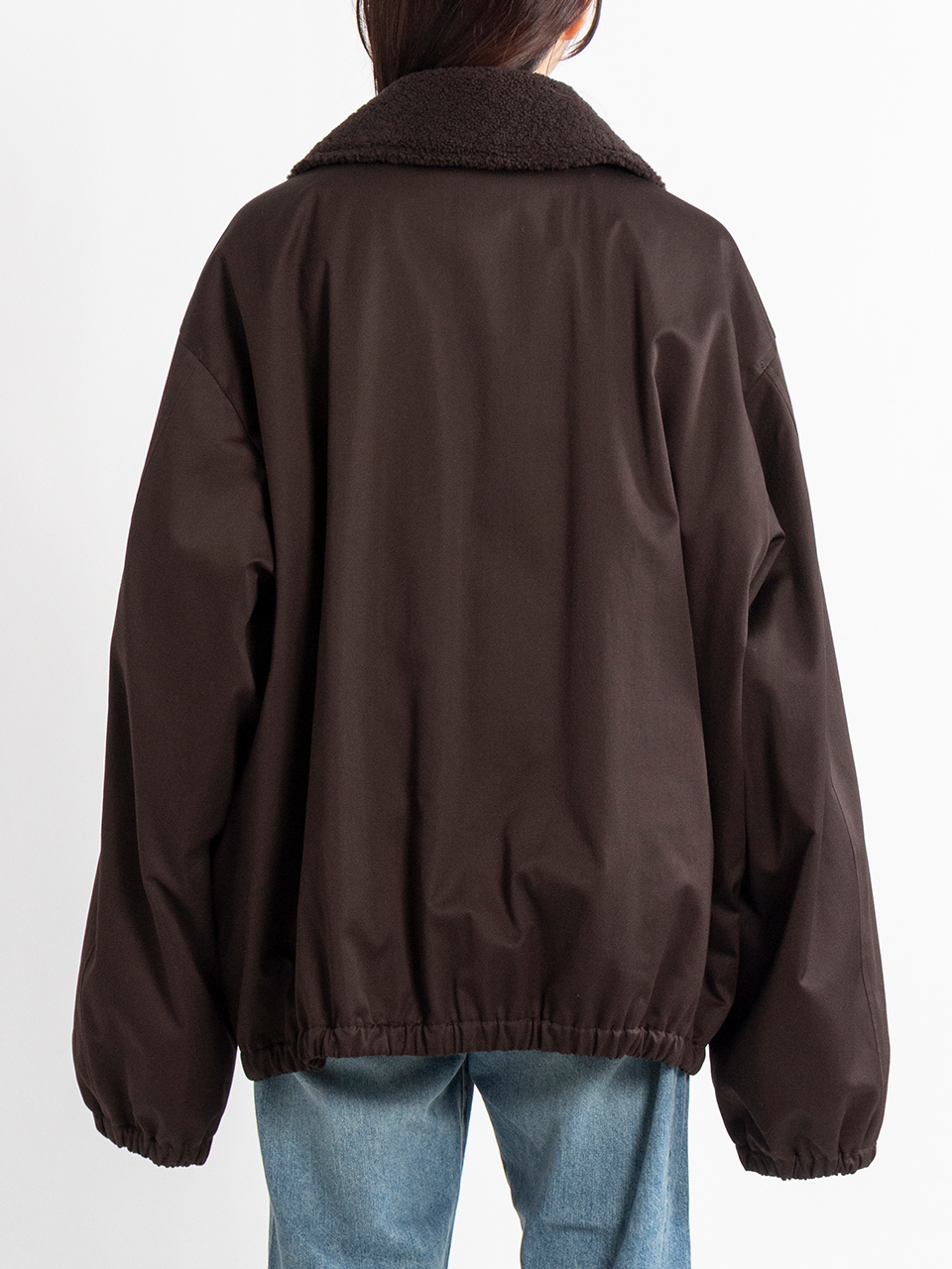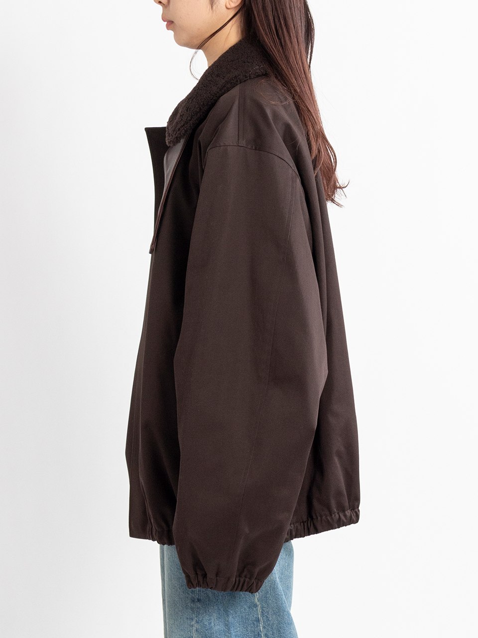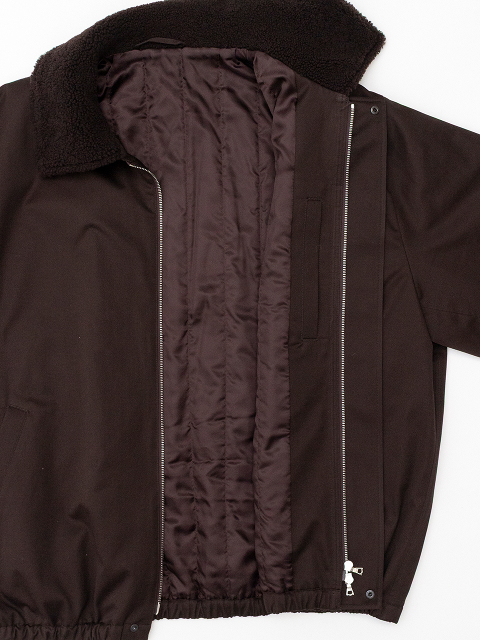 コットンダブルサテンの表地にシープムートンの襟を組み合わせたライト中綿ジャケット。