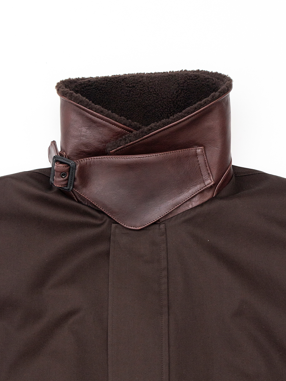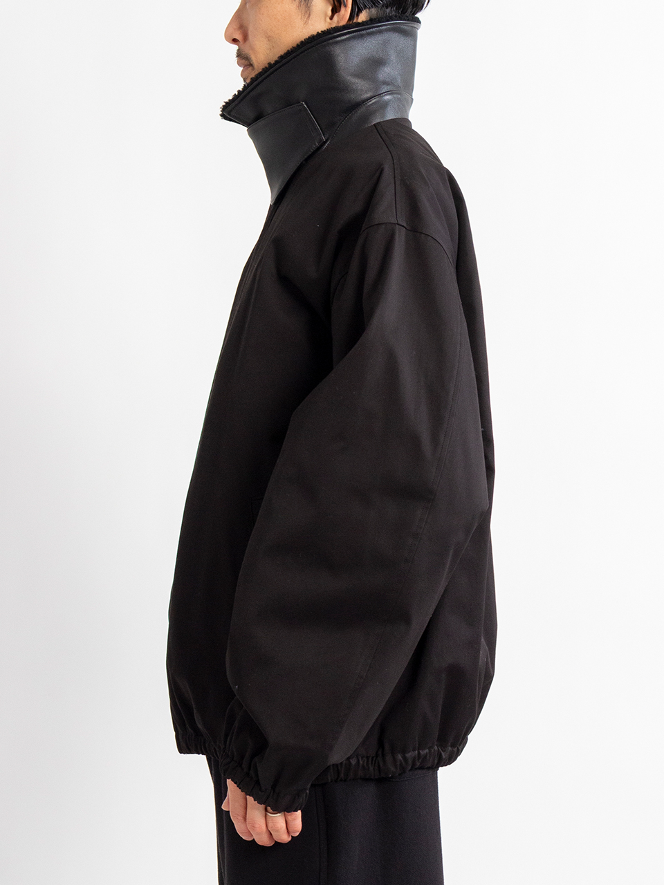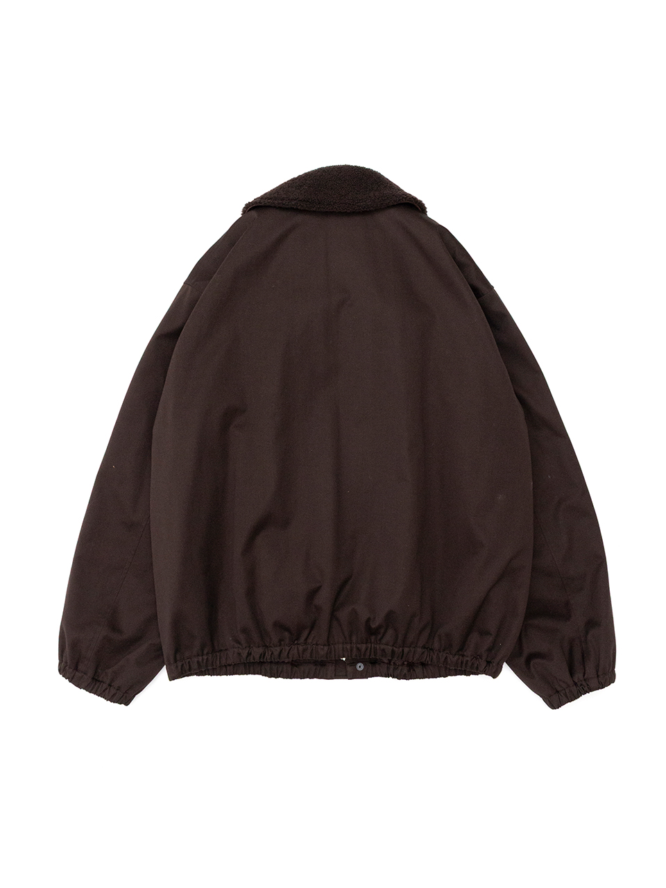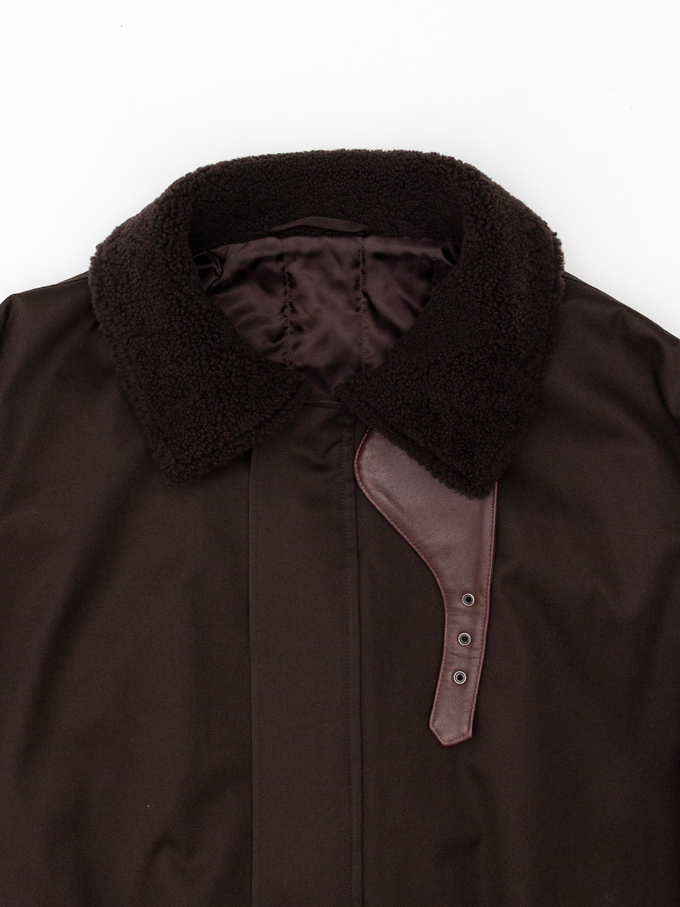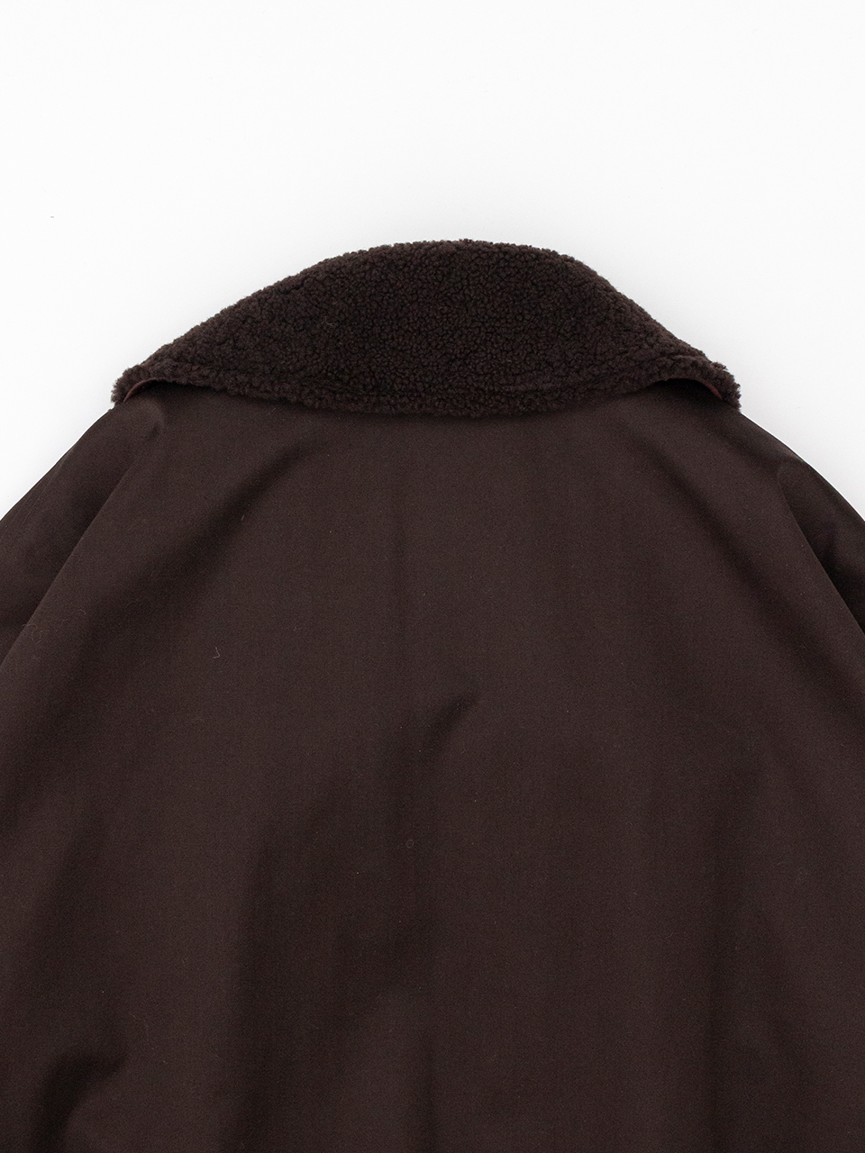 コットンダブルサテンの表地にシープムートンの襟を組み合わせたライト中綿ジャケット。
