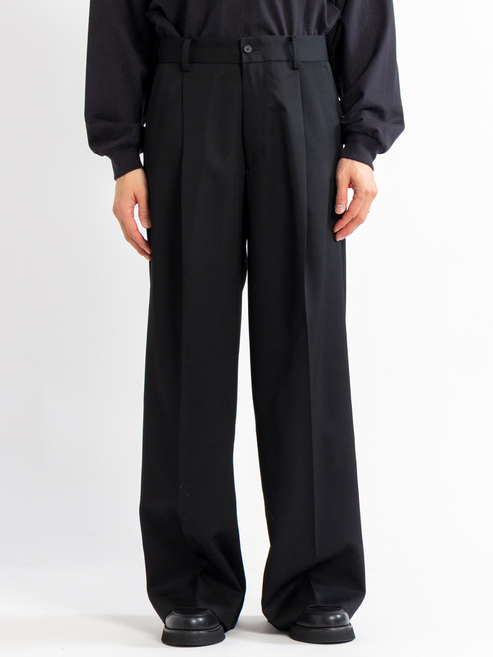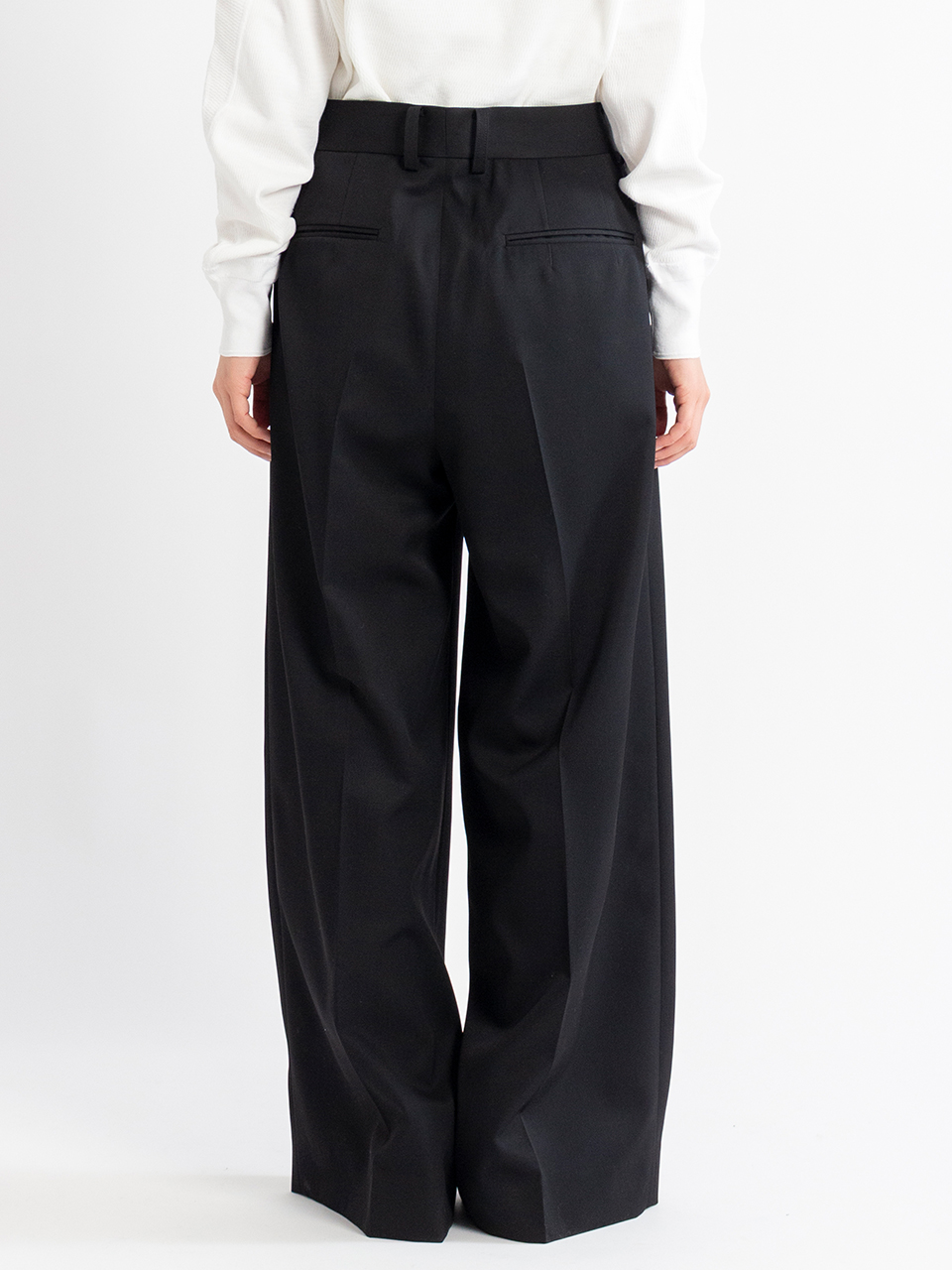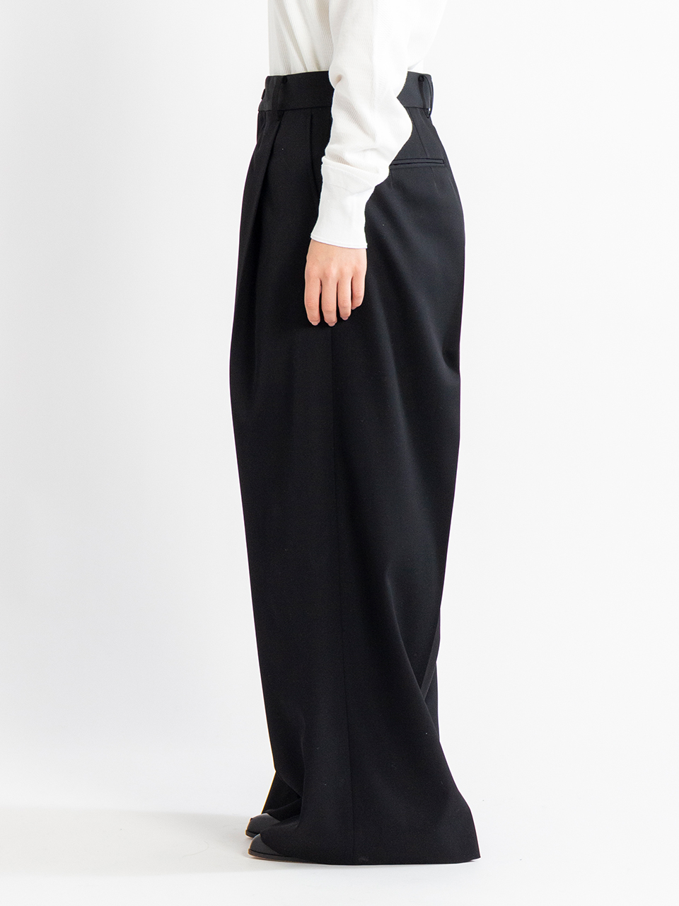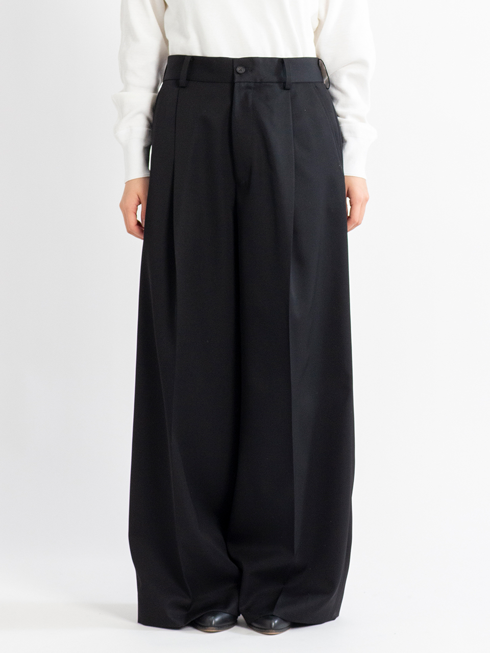 わたりから裾までを大胆に広げたスーパーワイドのワンタックトラウザーズ。