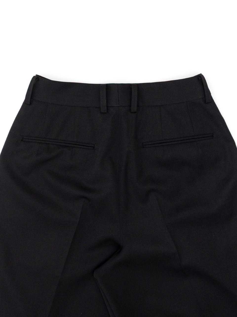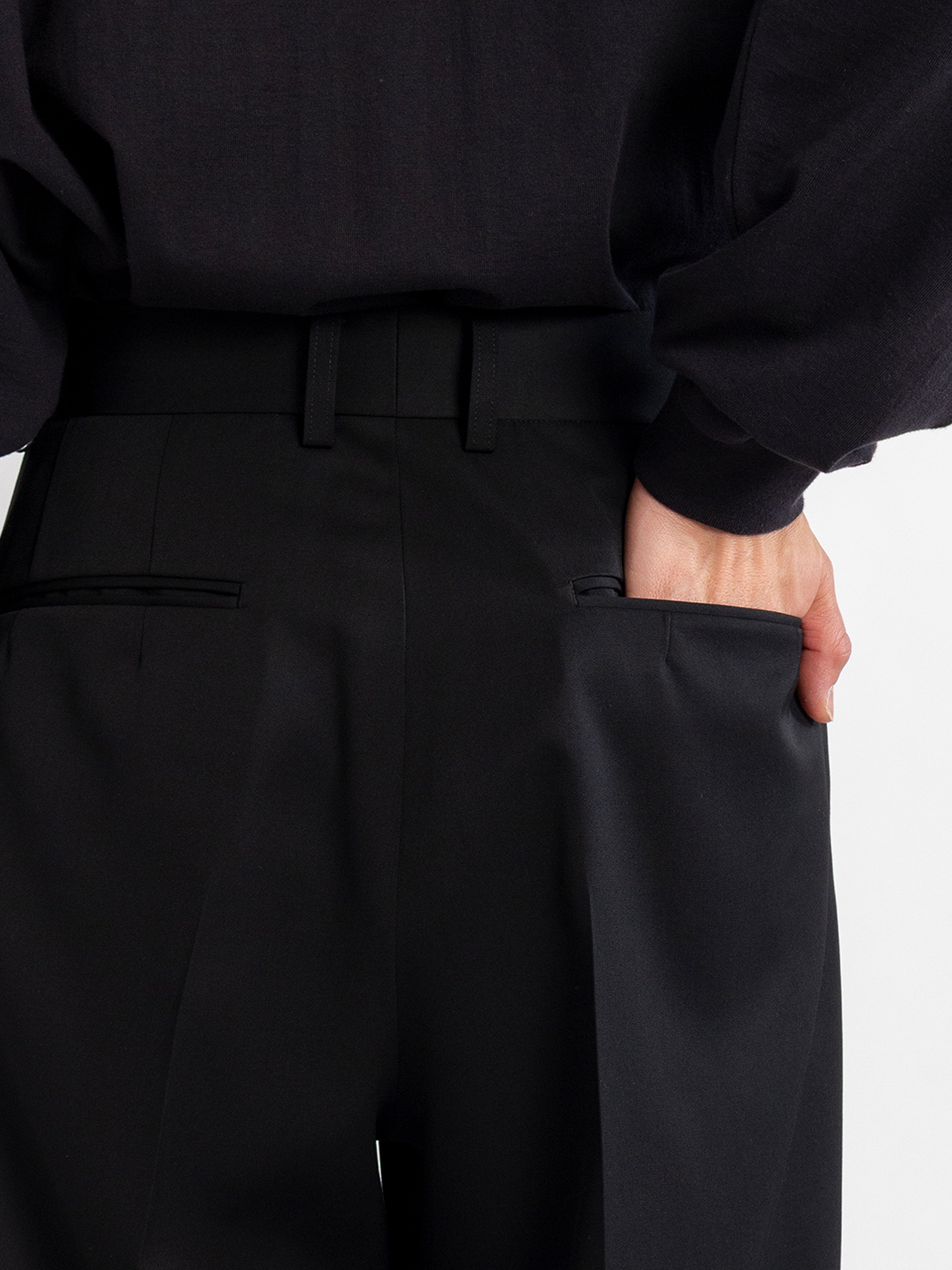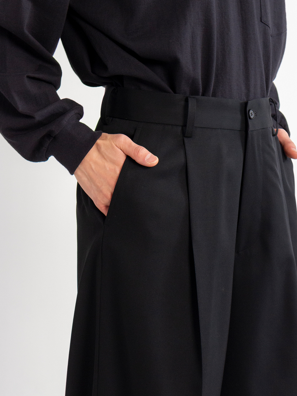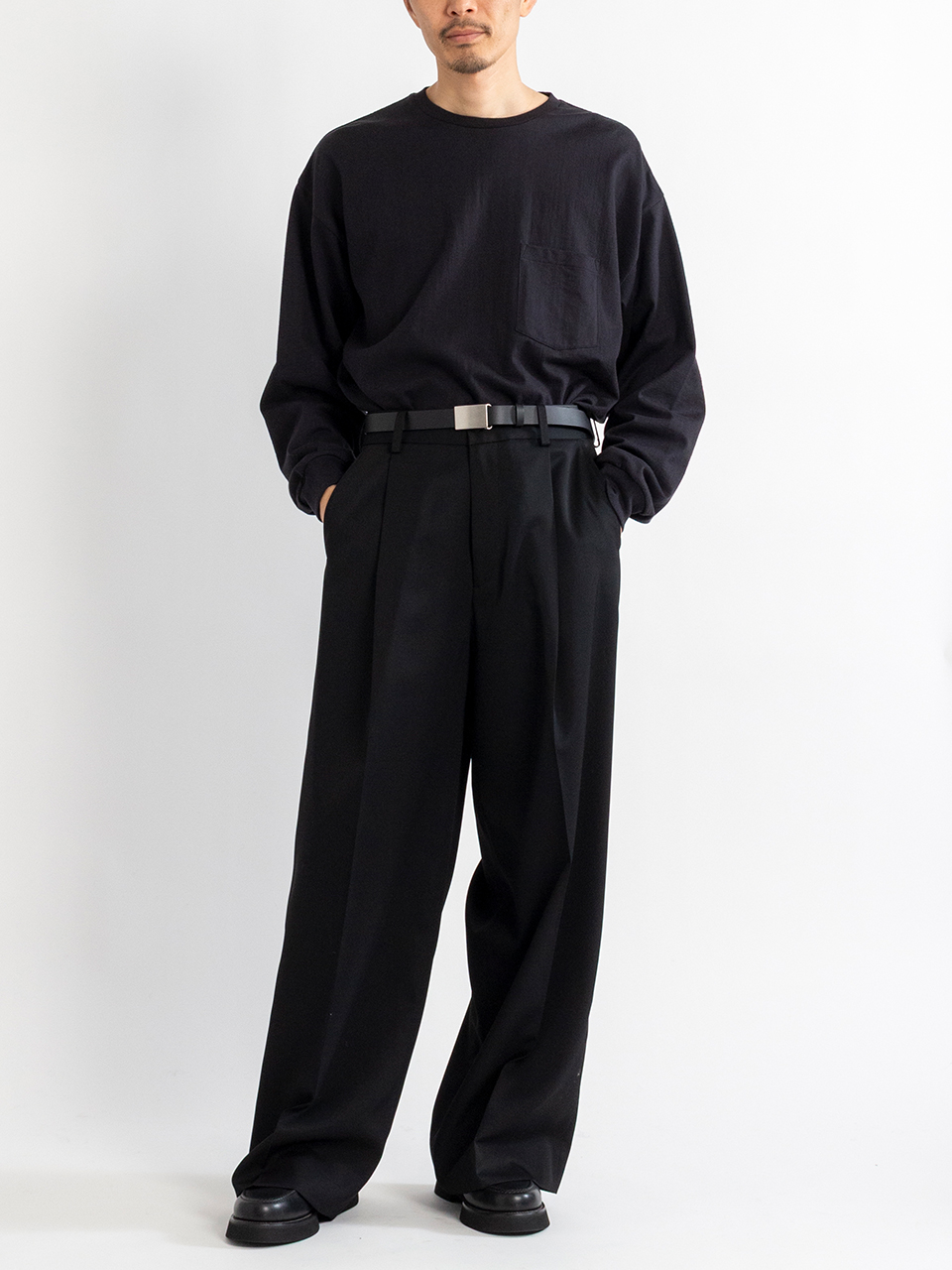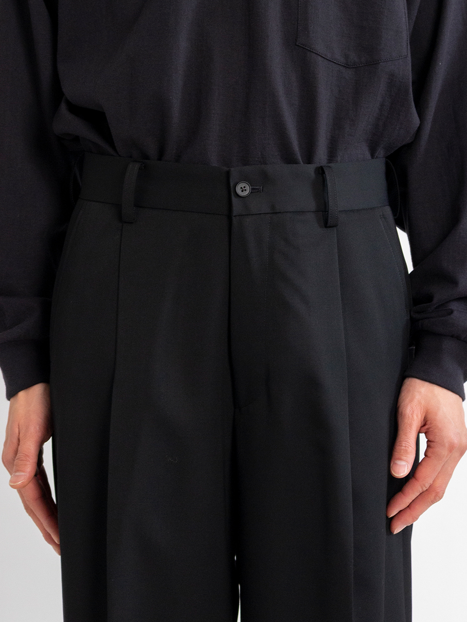 わたりから裾までを大胆に広げたスーパーワイドのワンタックトラウザーズ。