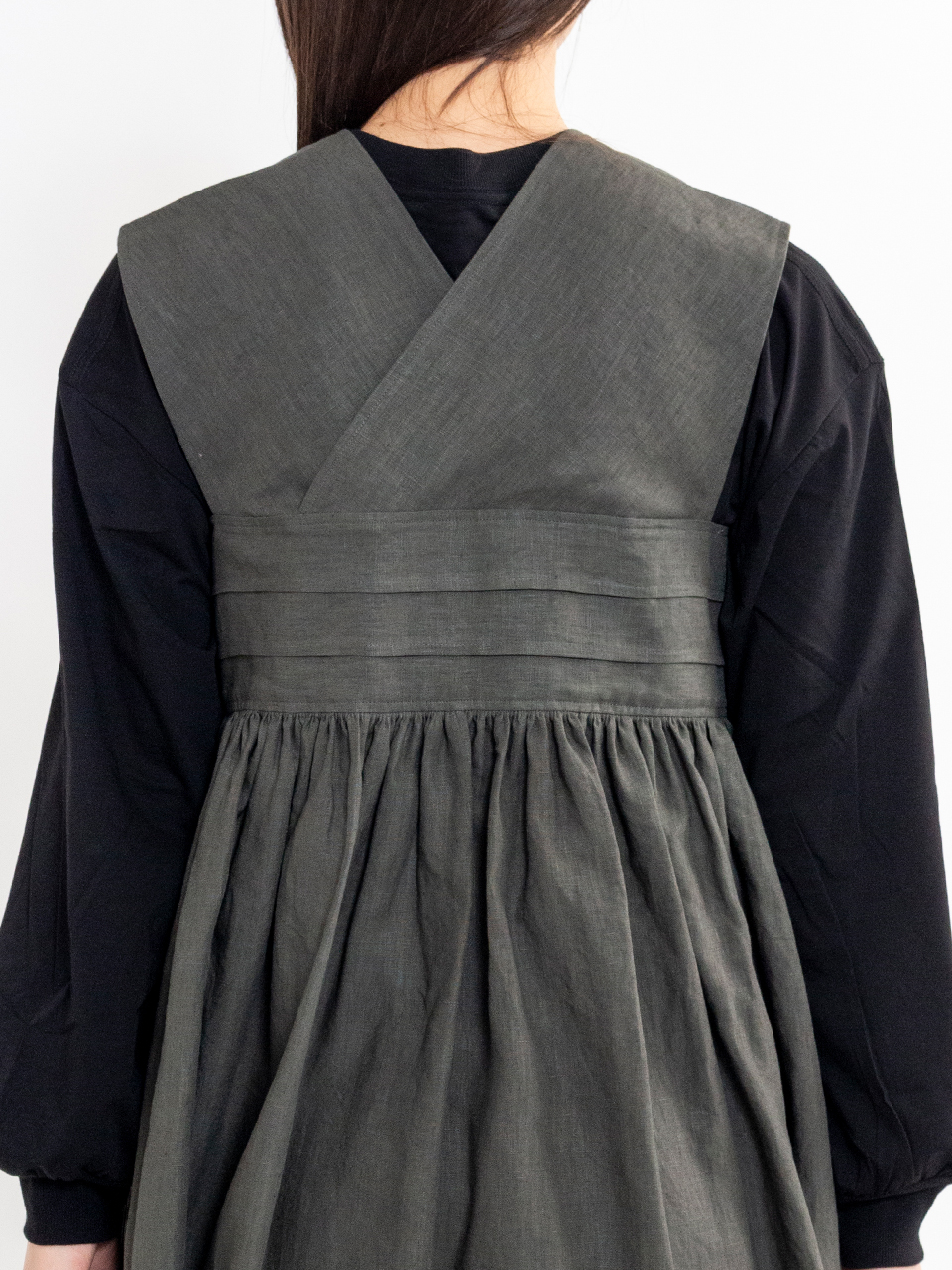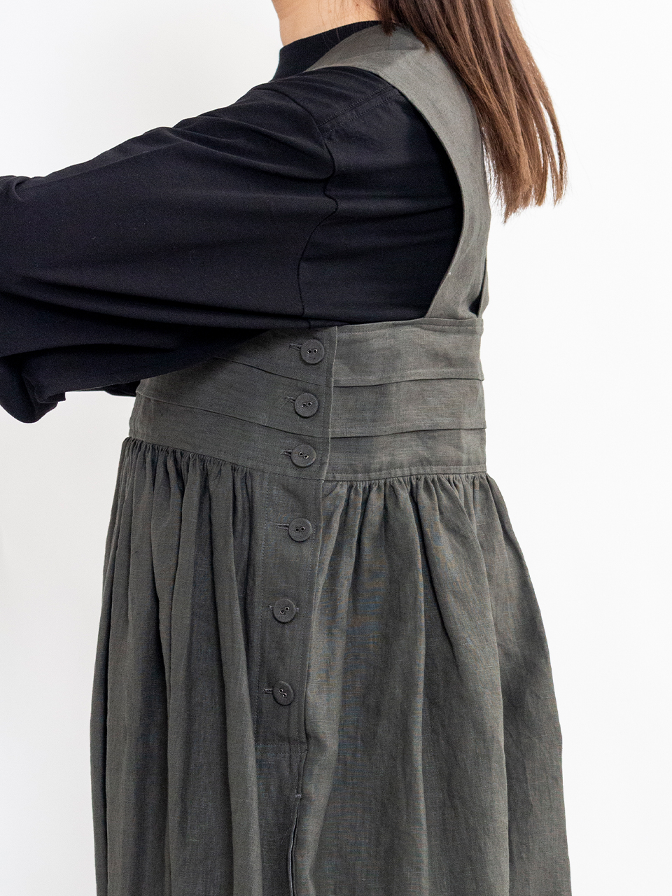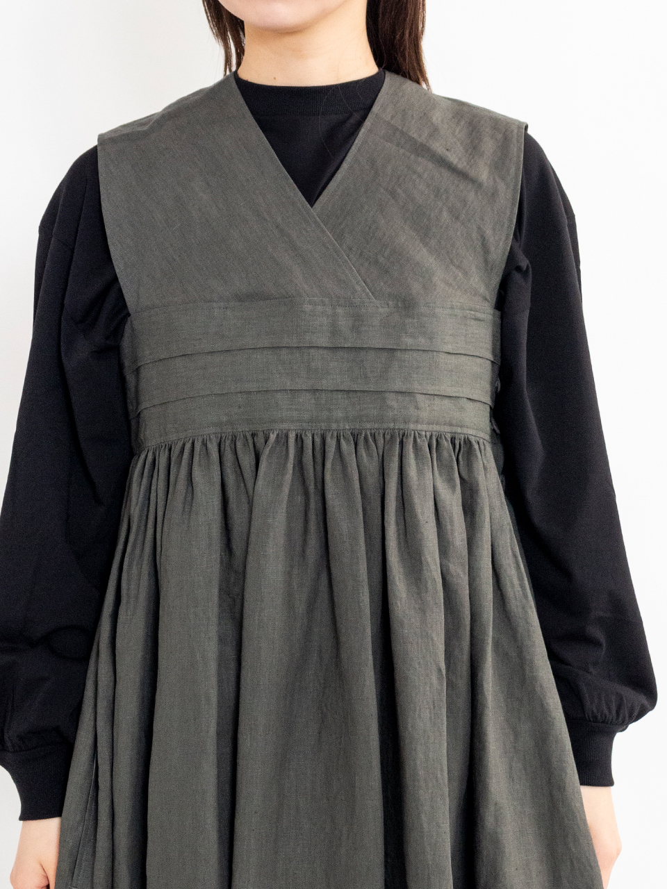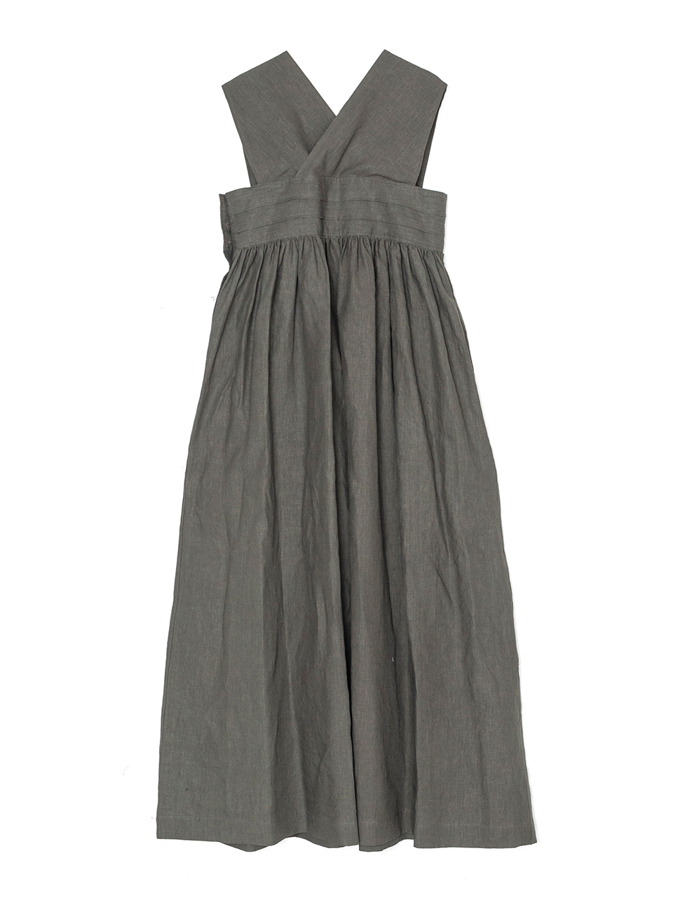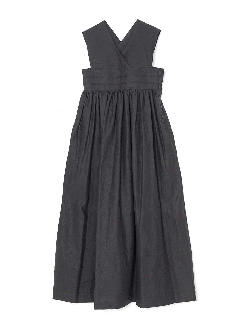 太めのショルダーと高めの位置からギャザーを寄せたマキシドレスは、落ち着いた雰囲気で着ていただけます。