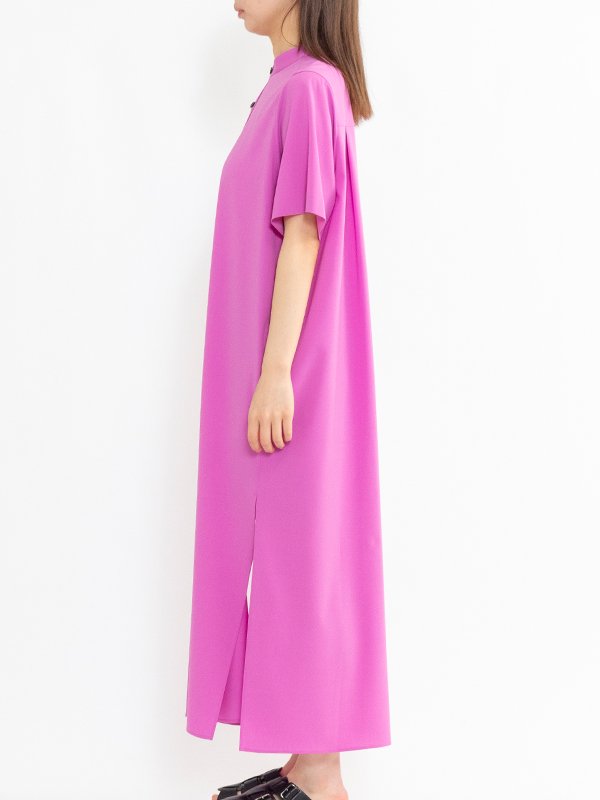 上品でドレープ性が特徴のポリエステルプレイン生地が使用されたマキシシャツドレス。