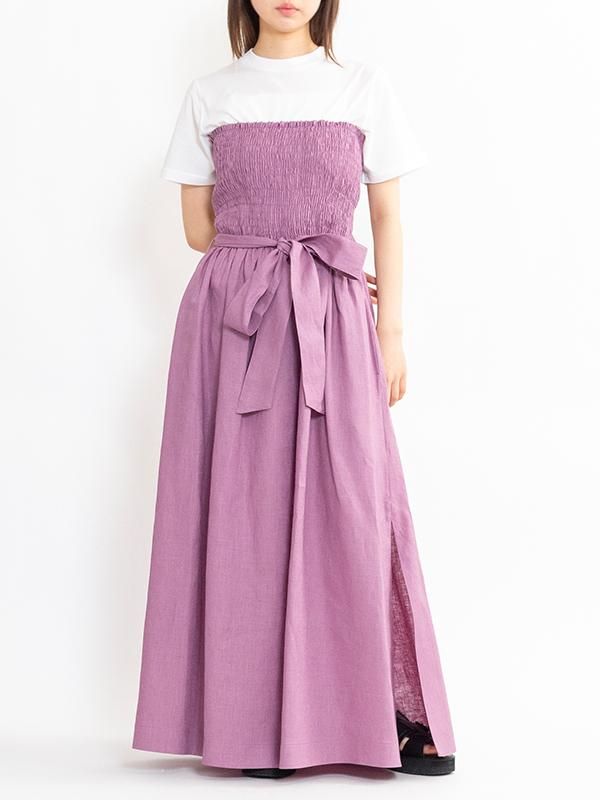サイドに配置された共布ベルトは垂らしたままでも、フロントやバックで結んで頂いてもお好みのバランスでお使いいただけます。
