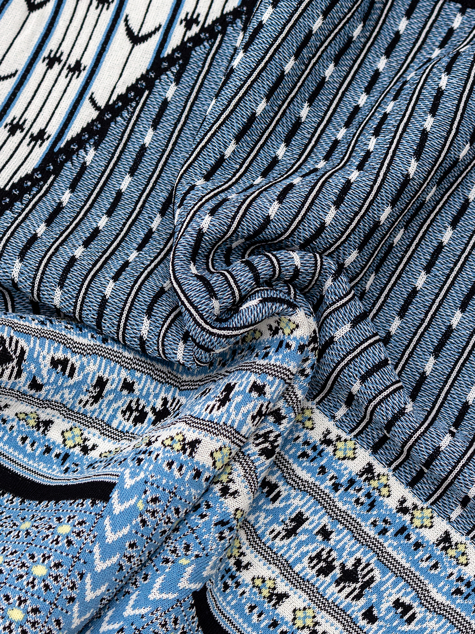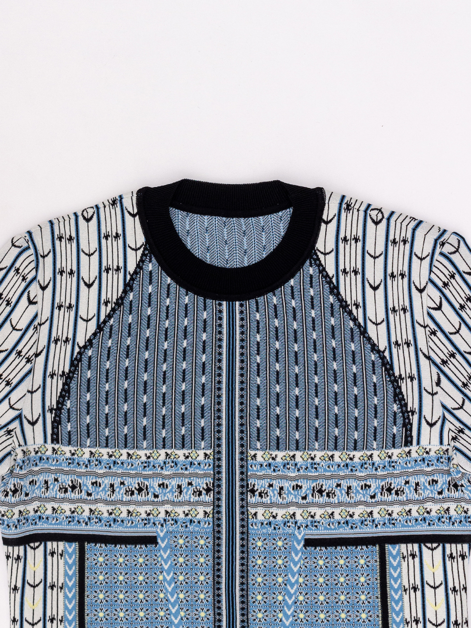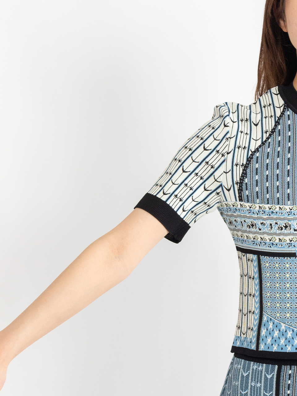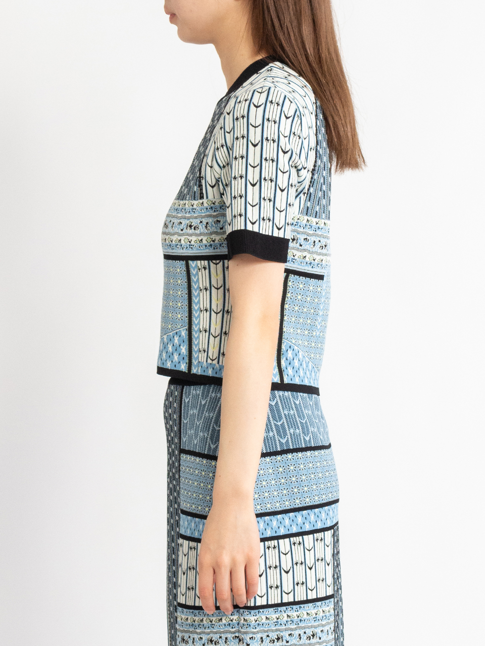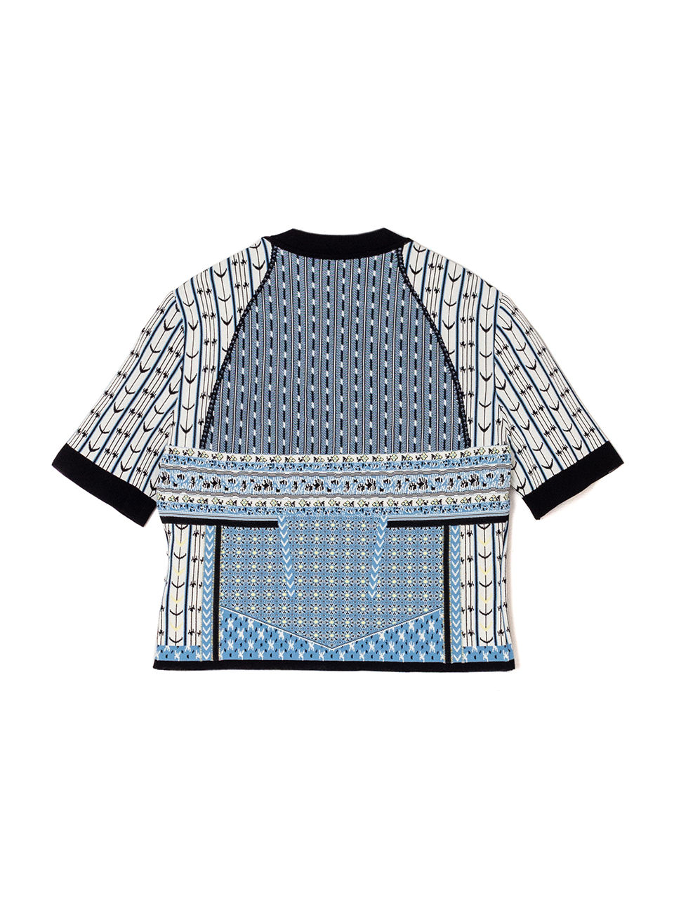 様々な沖縄の風景を描いた沖縄の織物をインスピレーション源にデザインされた絣柄ニットトップス。
