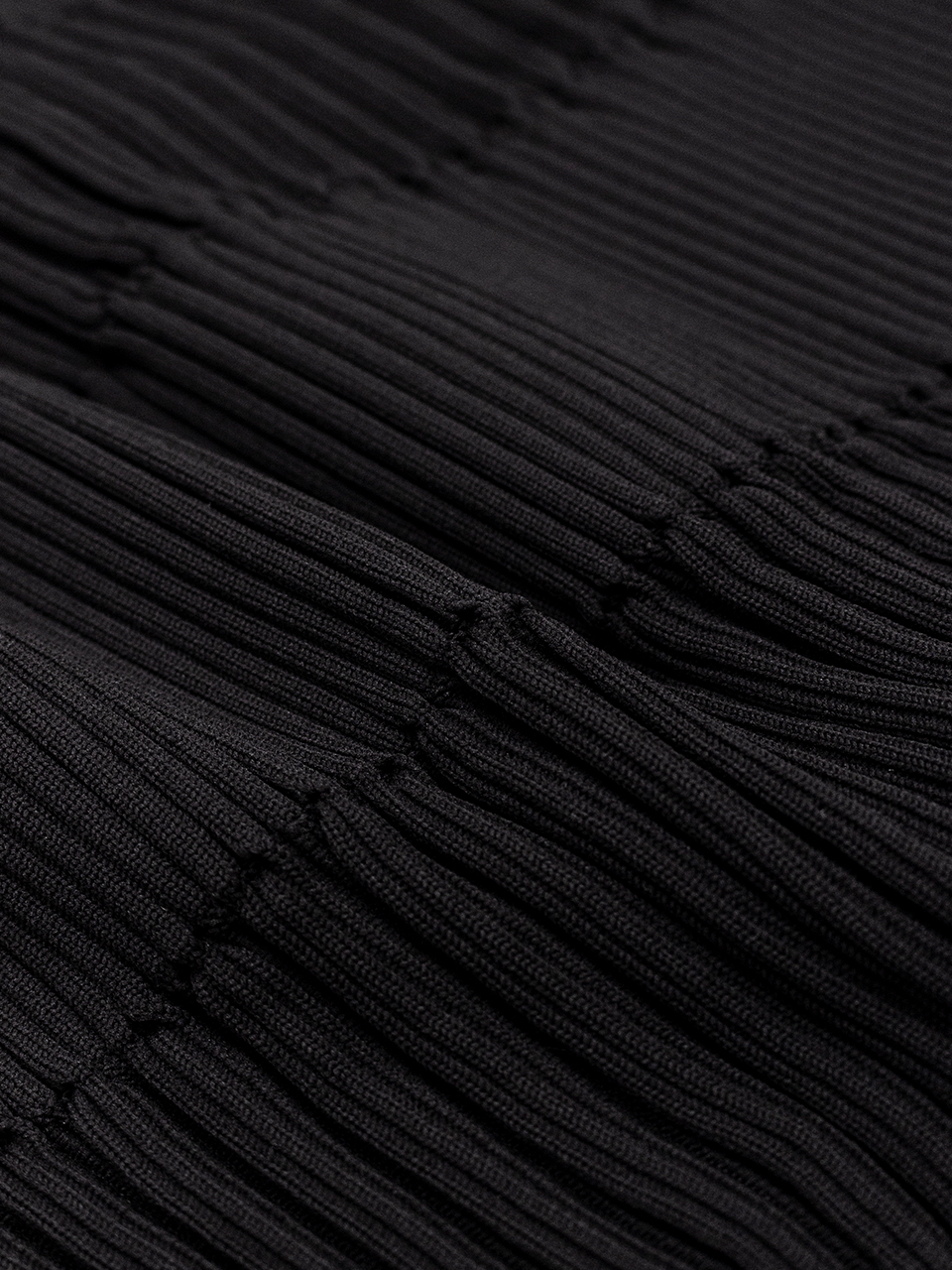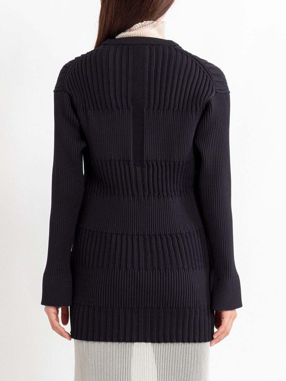 ストレッチ性の異なる2種類のリブを交互に編むことでユニークなシルエットを生み出しています。