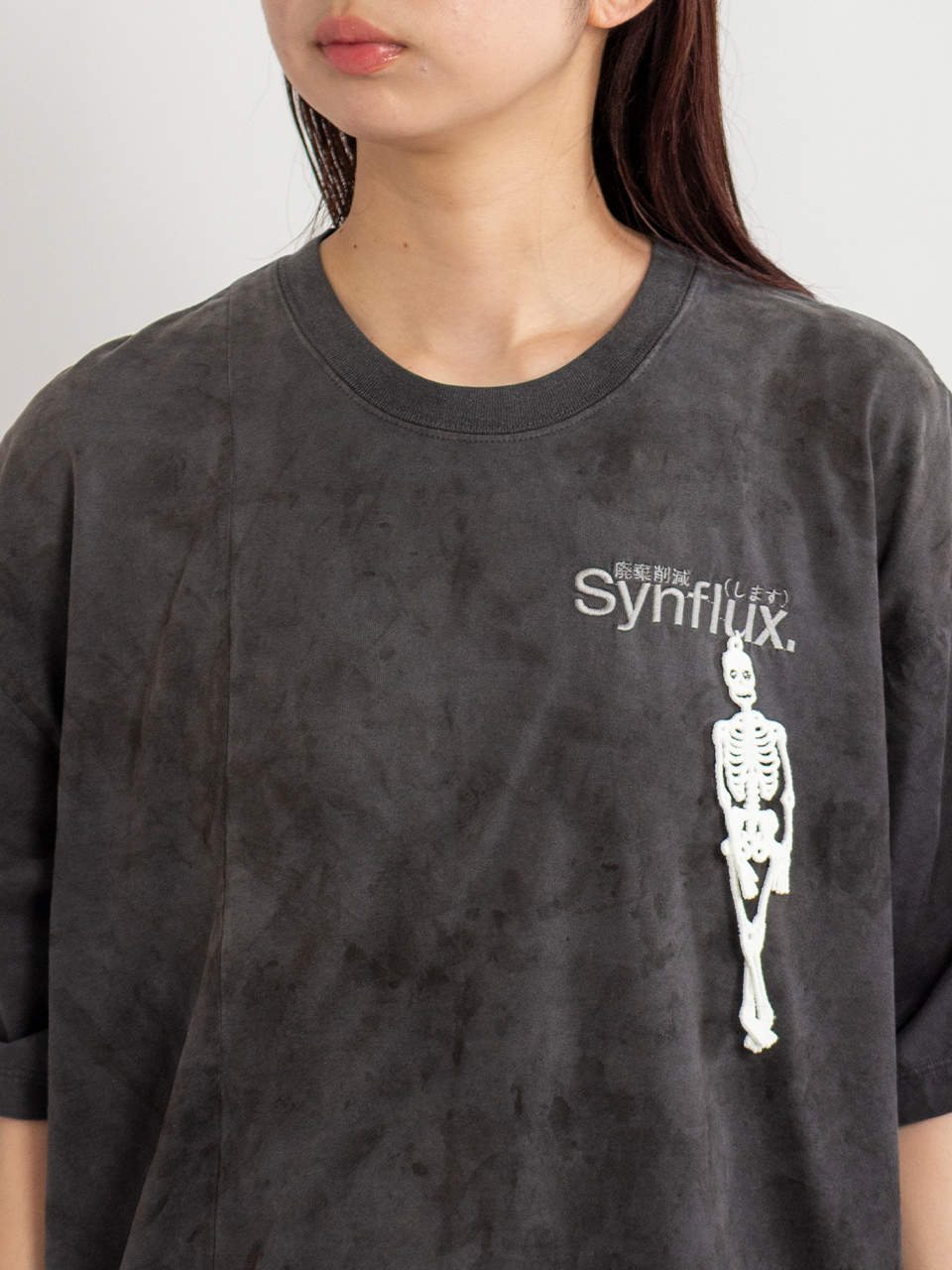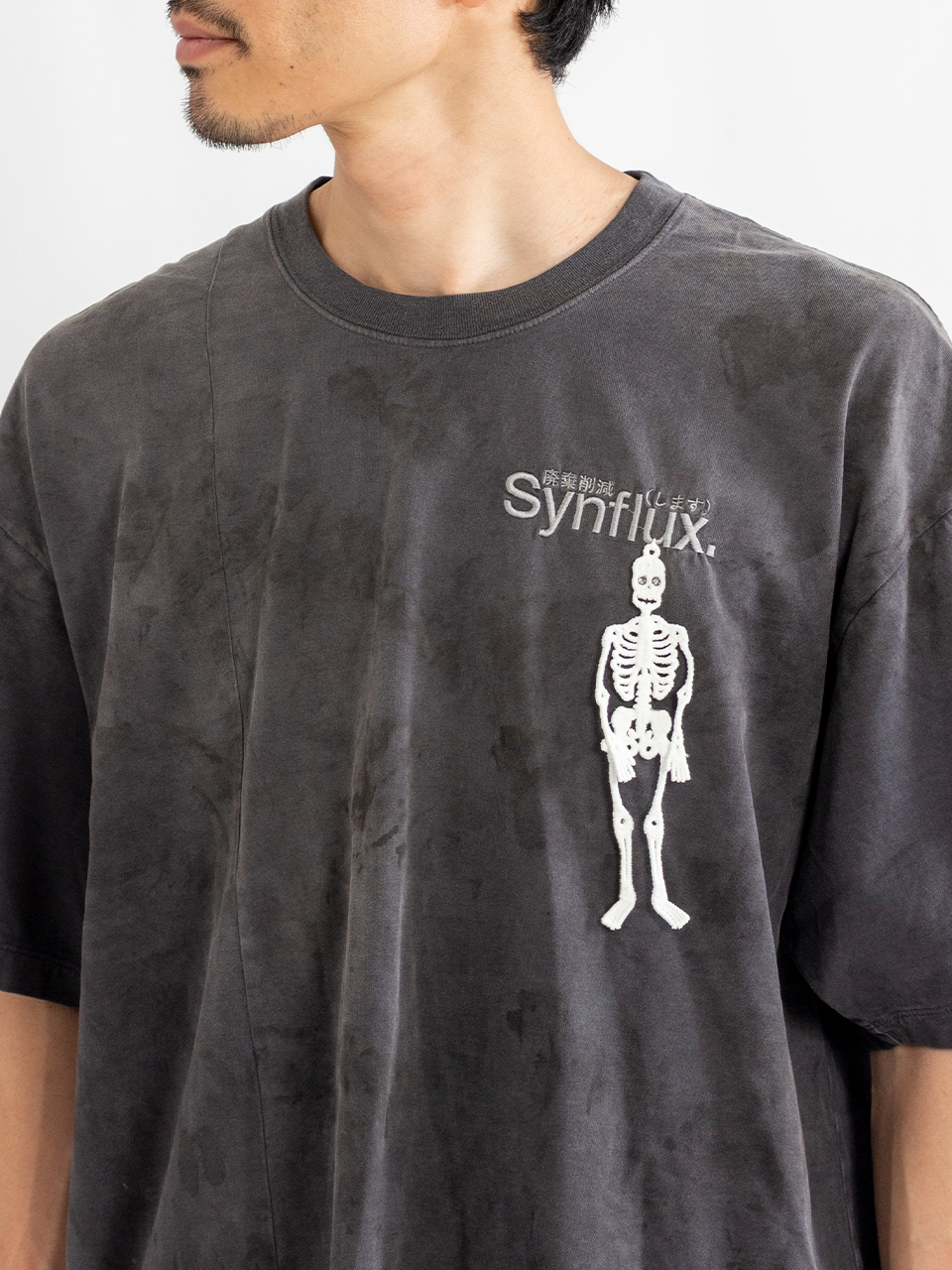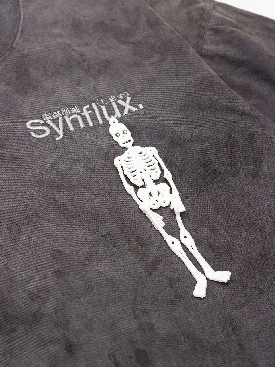 胸元には、‘‘怖い‘‘と敬遠されがちな骸骨を暗闇で光る糸を使用し刺繍で表現しています。