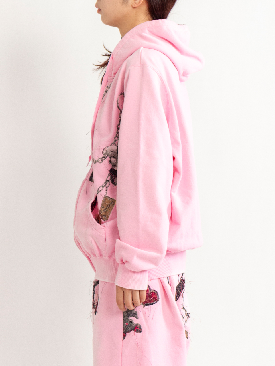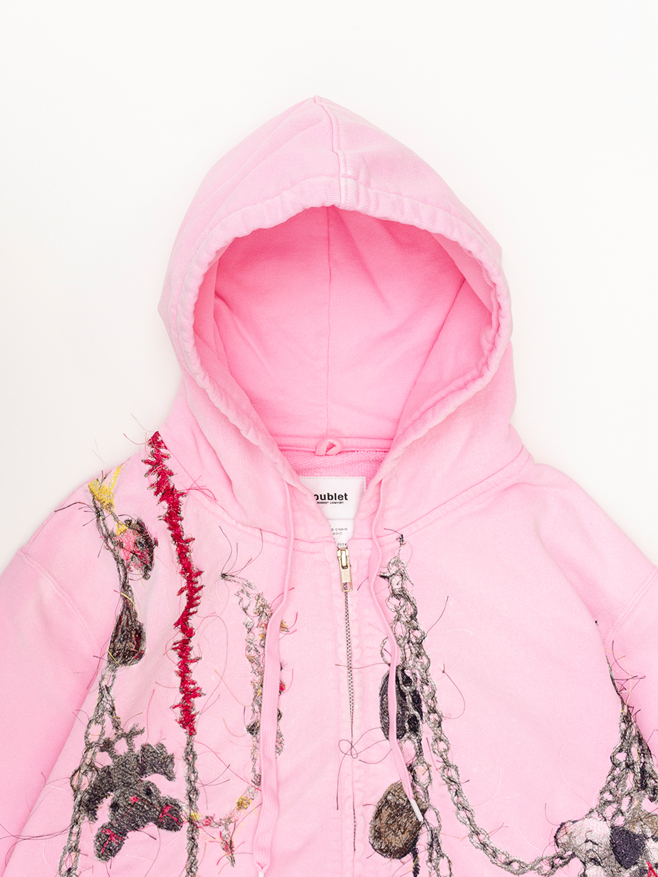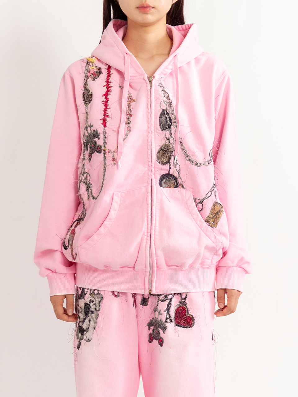 まるでチェーンアクセサリーをまとったかのうようなジップアップフーディー。