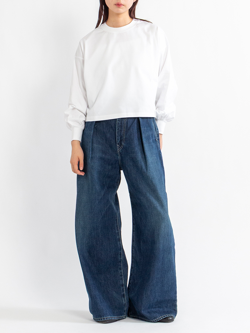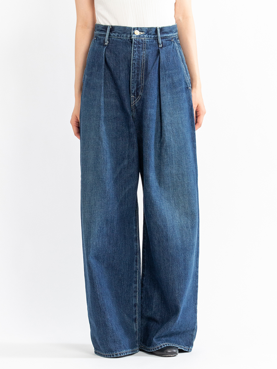 腰周りをスッキリと見せるハイウエストに、裾に向かってまっすぐ落ちる深めのタックが上品な印象を与えるハイウエスト設計のワイドストレートデニム。