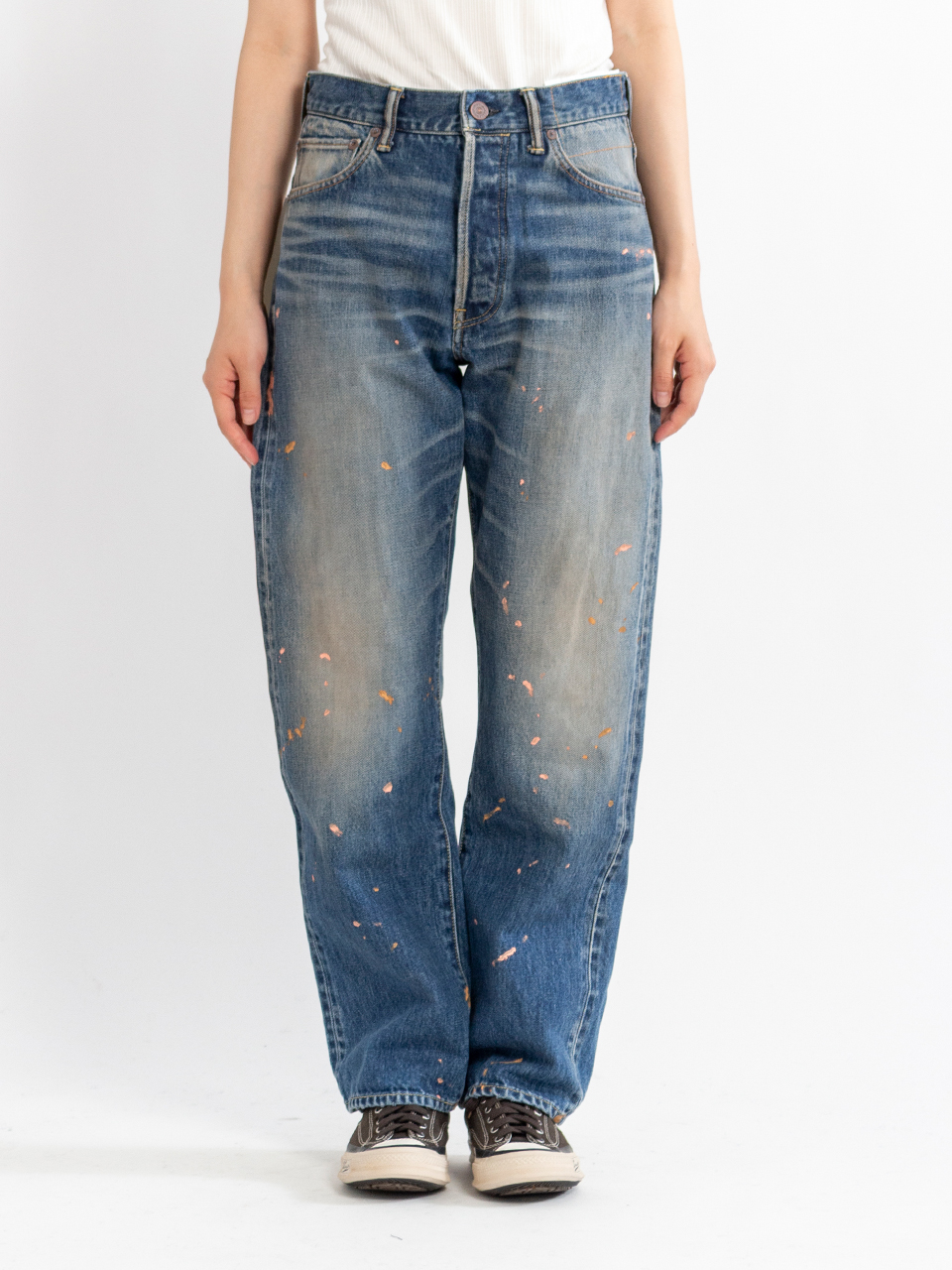 ダメージ加工、ブルーセルビッジ、サイドポケットジップディテール、オリジナルファスナースライダー、鉄製ネオバボタン、リベット、天然染色加工を施したディアスキンパッチ。