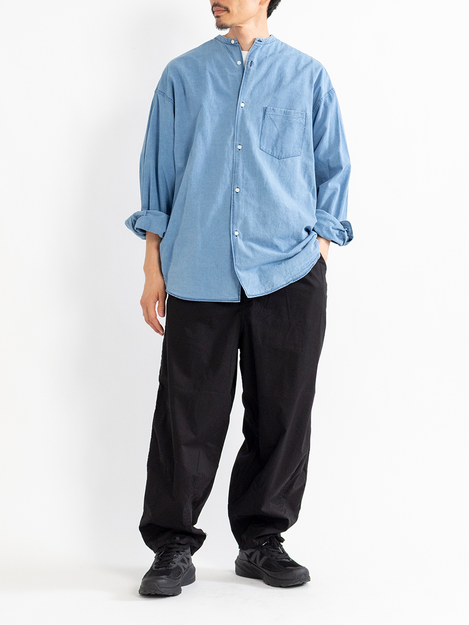 製品での洗いを入れることでデニムのような色落ちやアタリ感のある表情で仕上げたオーバーサイズのバンドカラーシャツ。