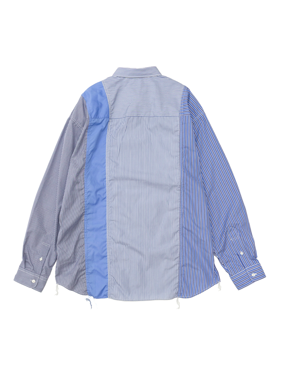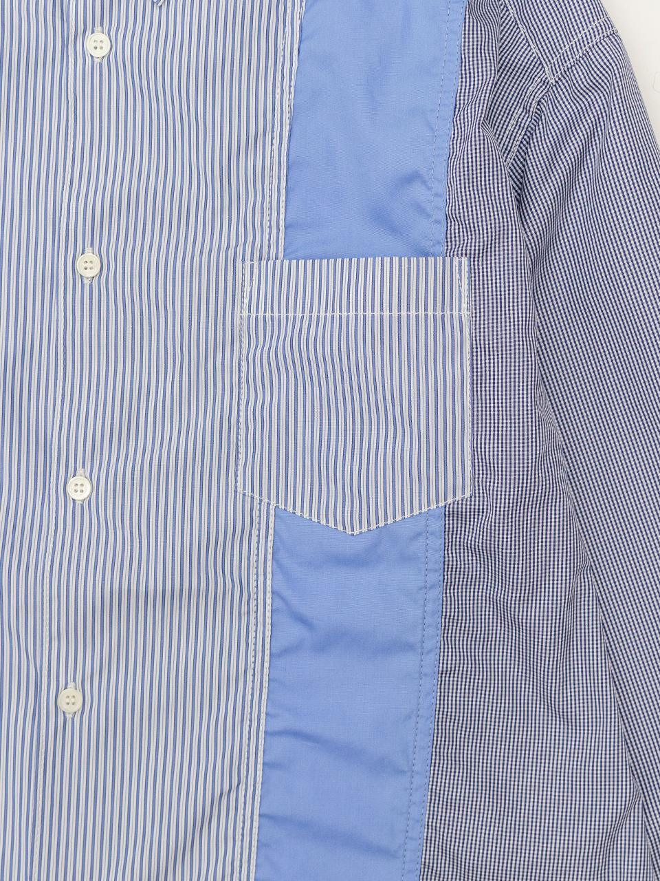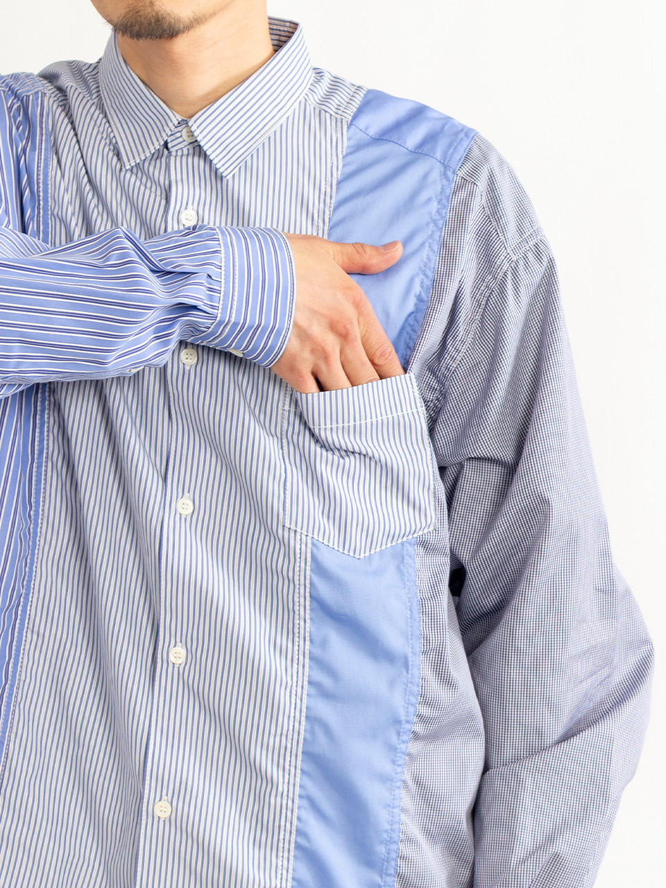 ギンガムチェックと無地サックス、2種類のストライプの4つの素材をドッキングさせたCOMME des GARCONS HOMMEならではのデザインのレギュラーカラーシャツ。