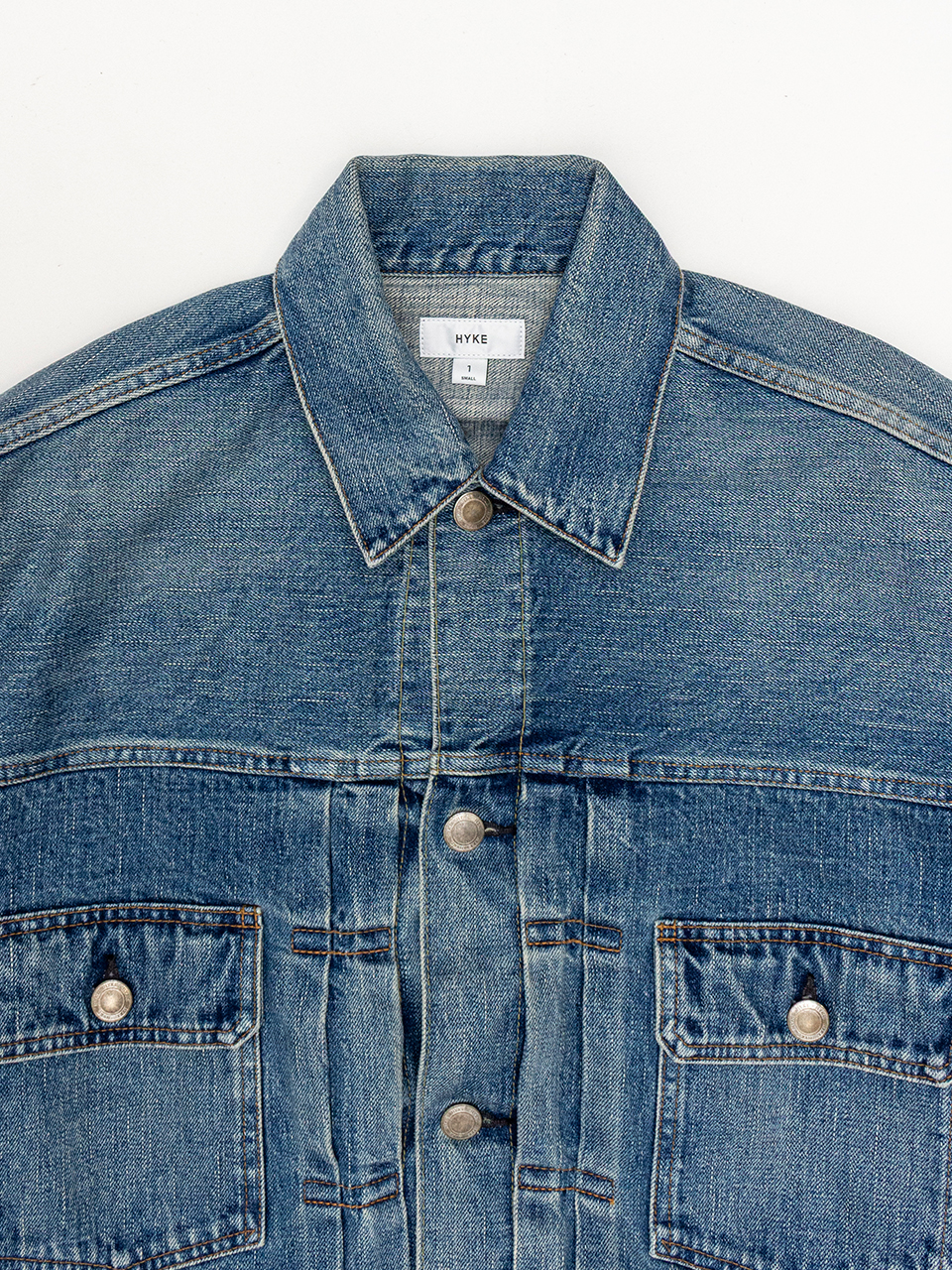 大きなデザインの特徴は袖と後身頃に通常のデニムジャケットよりも大きなタックが入っており立体的な女性らしいフォルムが魅力的な一点です。