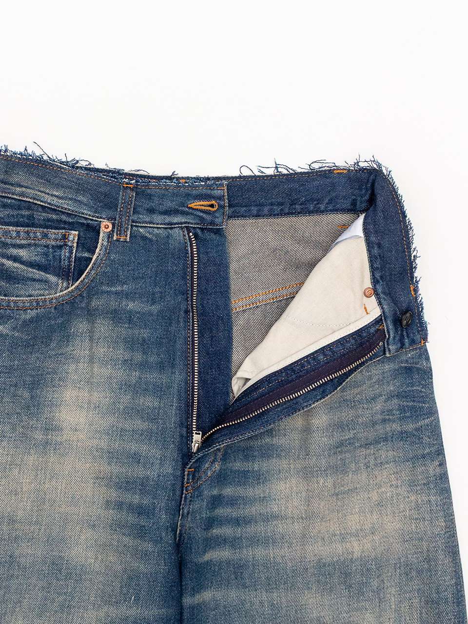 ワイドレッグのデニムジーンズで、ミッドウォッシュデニムに重めのフェードやウィスカリング加工が施されています。