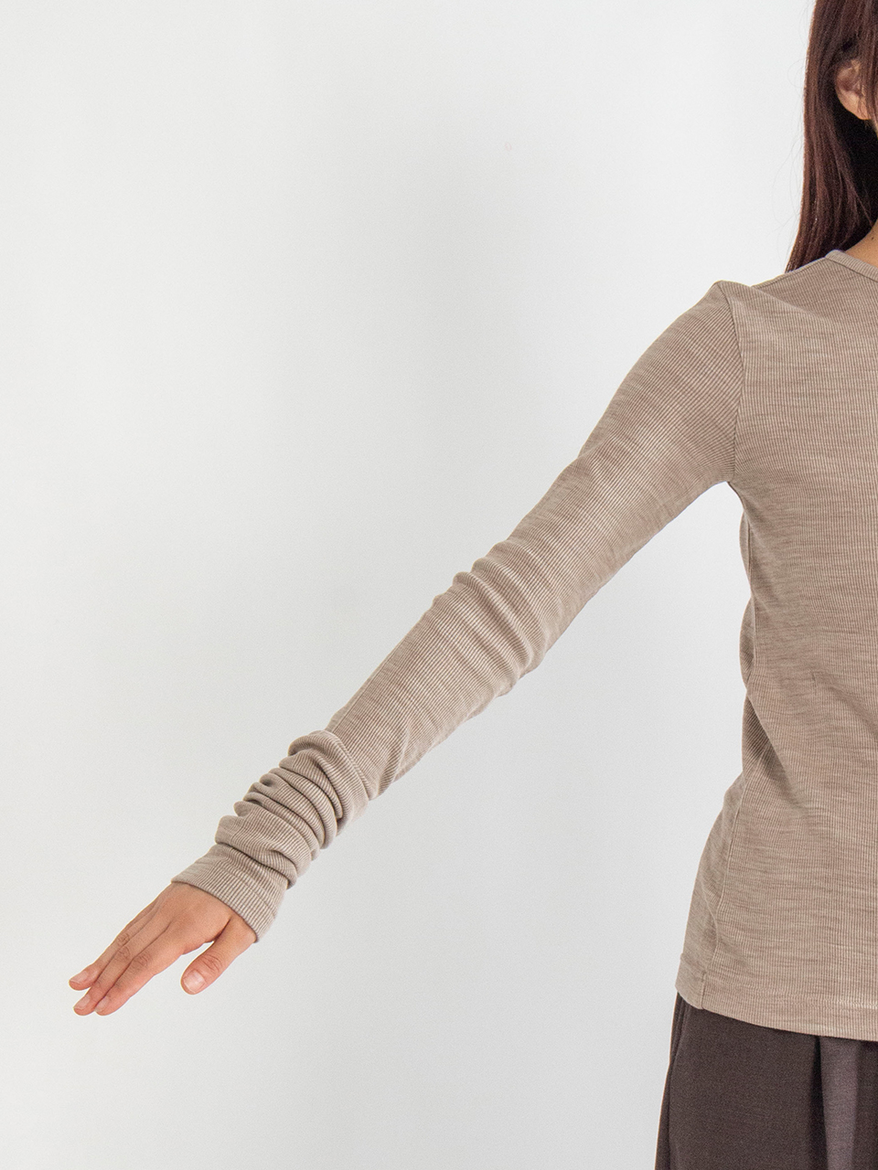 長めのアームとゆとりのあるフィット感が程よいタイトさを感じさせる一枚。