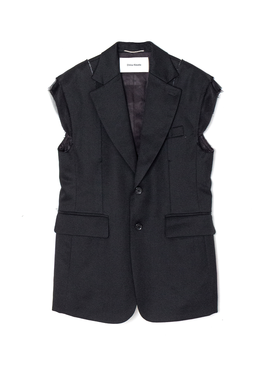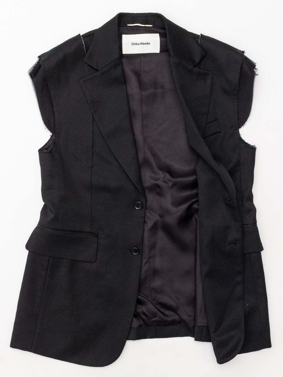 2つボタン仕様のクラシカルなスタイルに、粗く切り落としたようなカットオフデザインを組み合わせ、モダンな印象に。