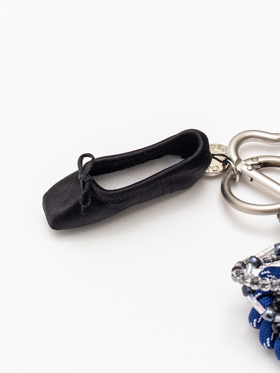 ハートを模ったカラビナ、ビーズで作られたリボン、華奢なトゥシューズといったメルヘンチックなモチーフのキーリング。