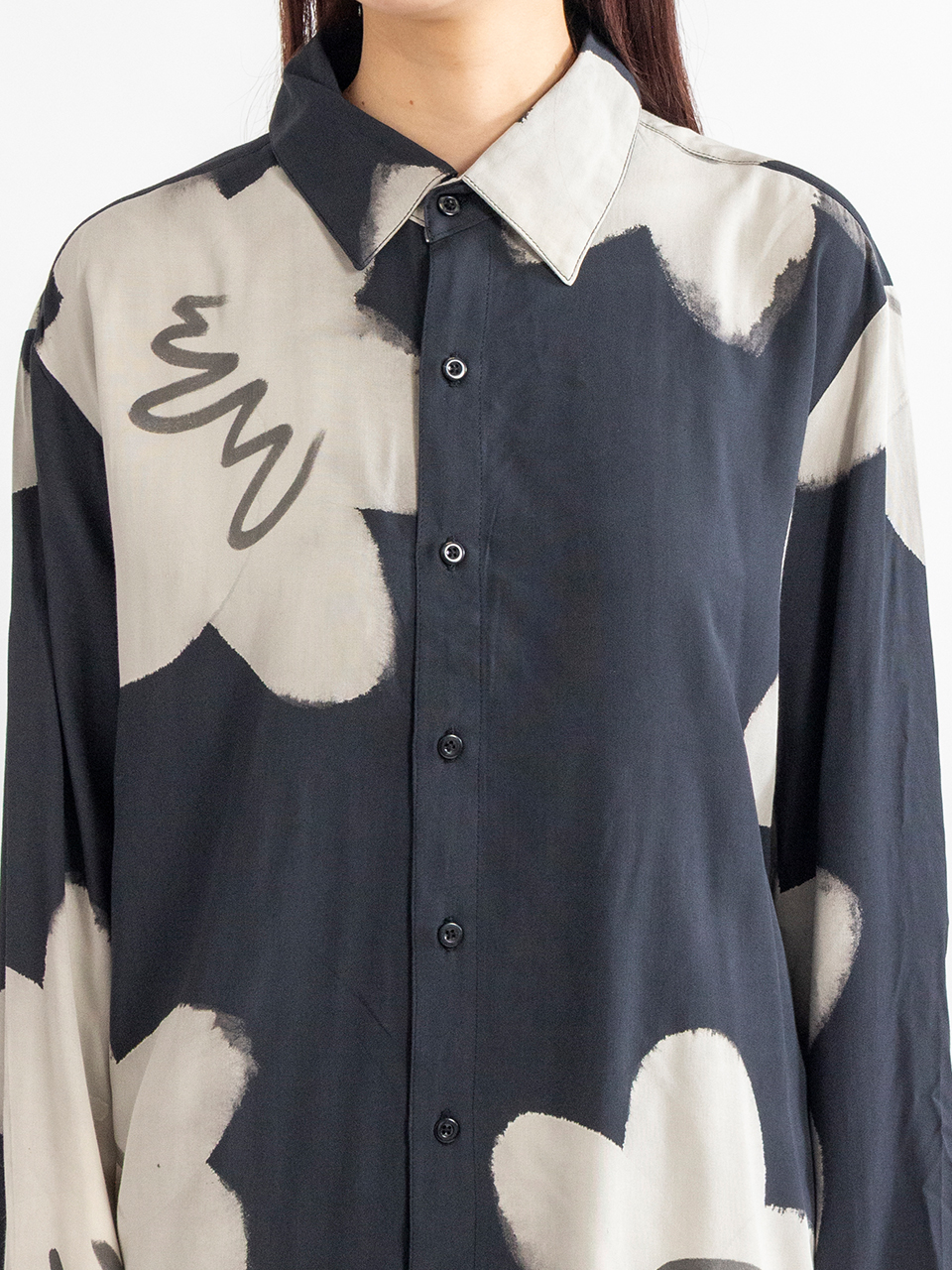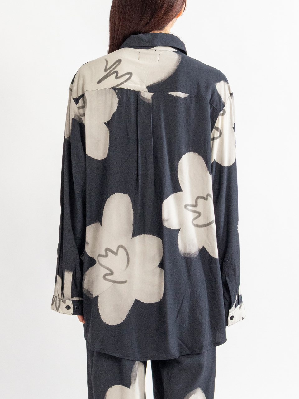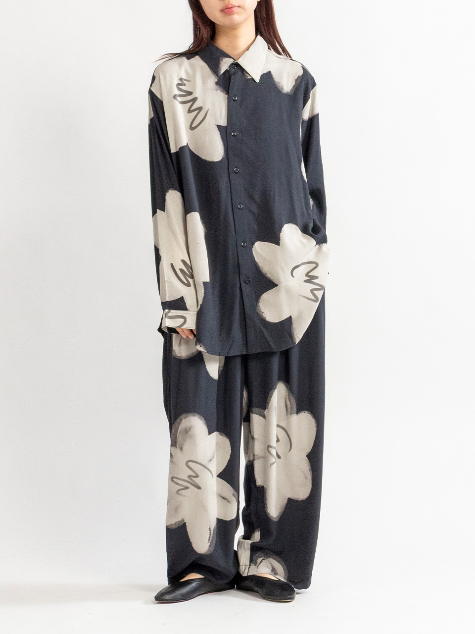ポケット付きのワイドレッグパンツと胸パッチポケット付きの長袖シャツが特徴です。