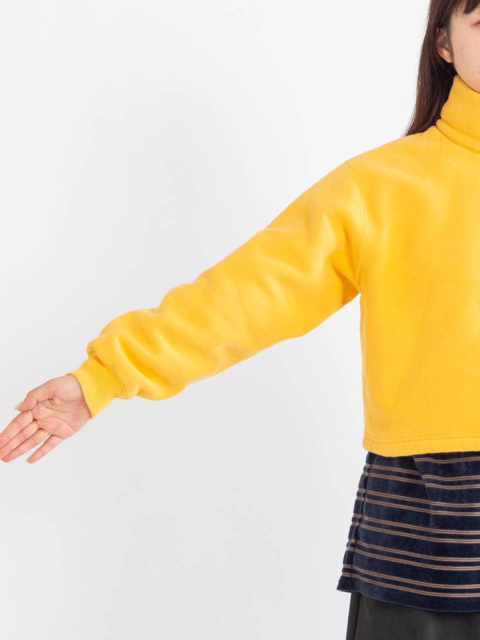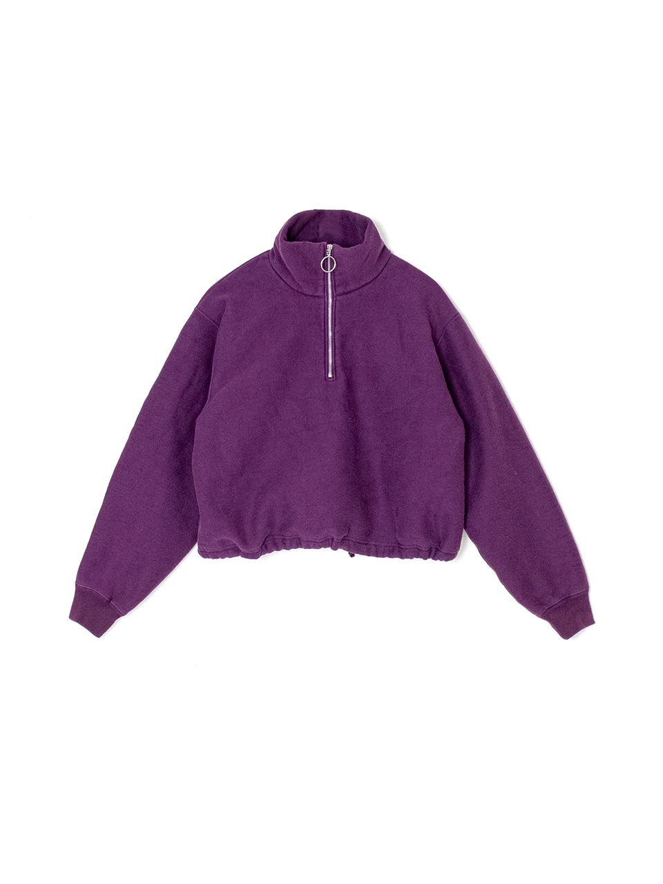 定番のハイネックフロントジッププルオーバーをショート丈にアップデートした一着。