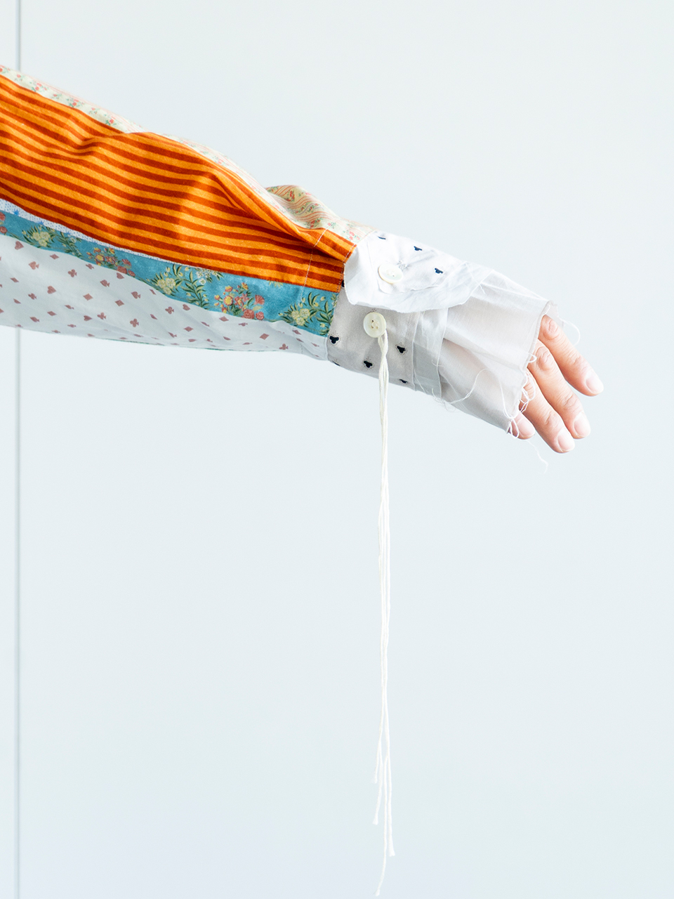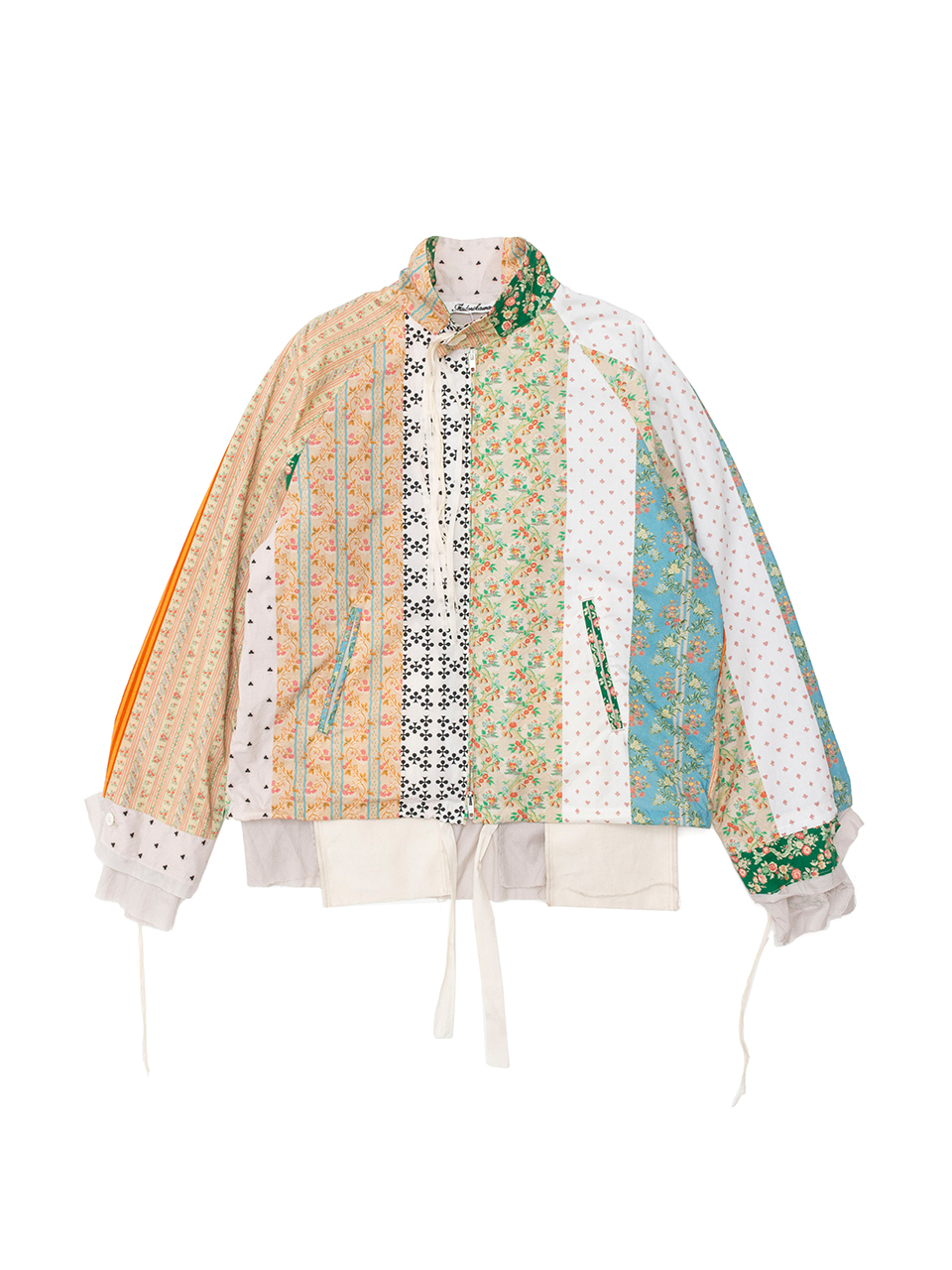 風に踊るシルクテープやヒモ、裾、袖のカットオフのライナーが独自の表情を醸し出します。