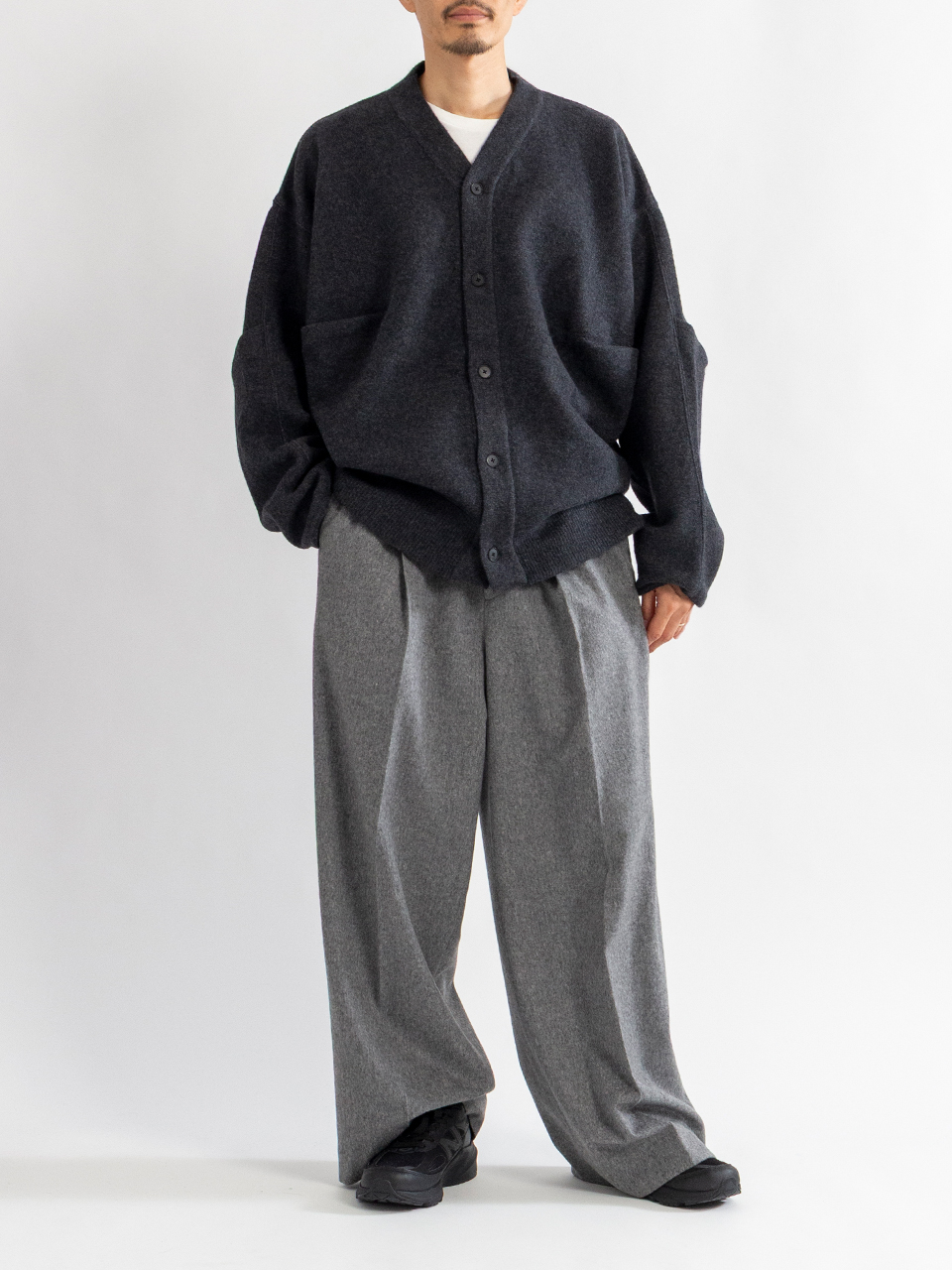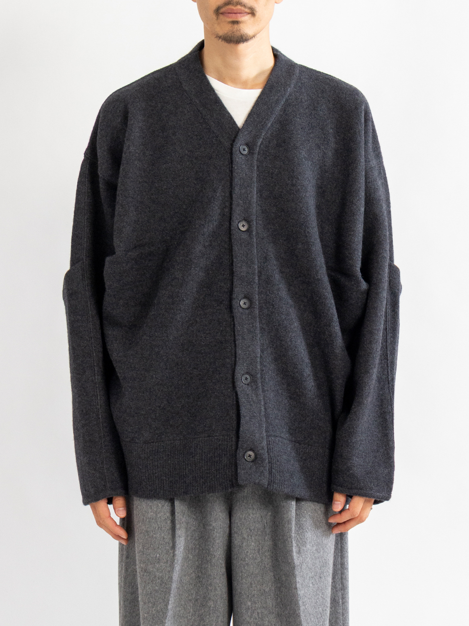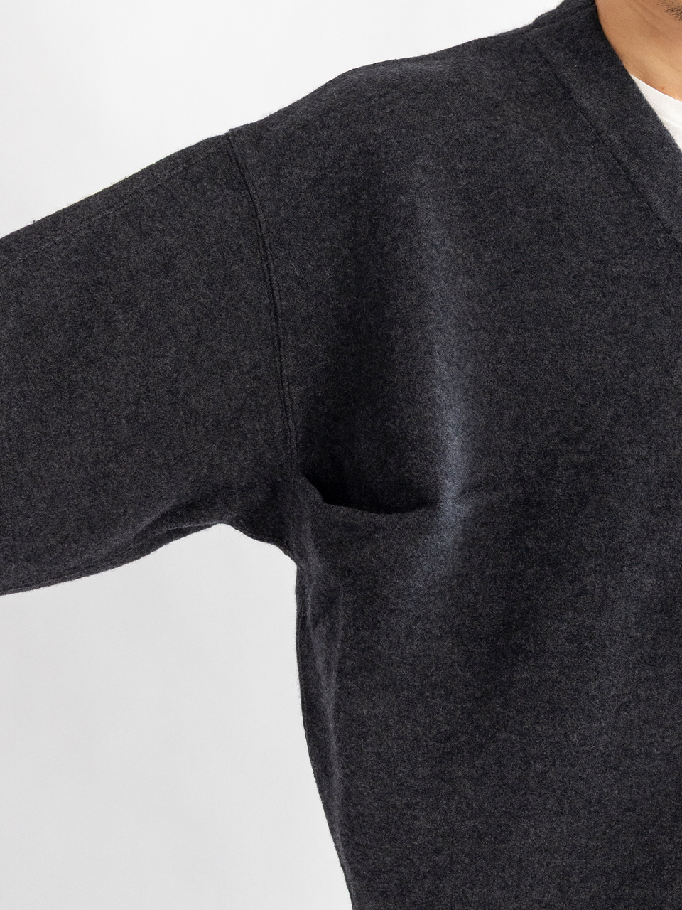16.5μの特に風合いも柔らかで保温性、保湿性に優れた上質なウールを強縮絨をかけて仕上げた素材のカーディガン。