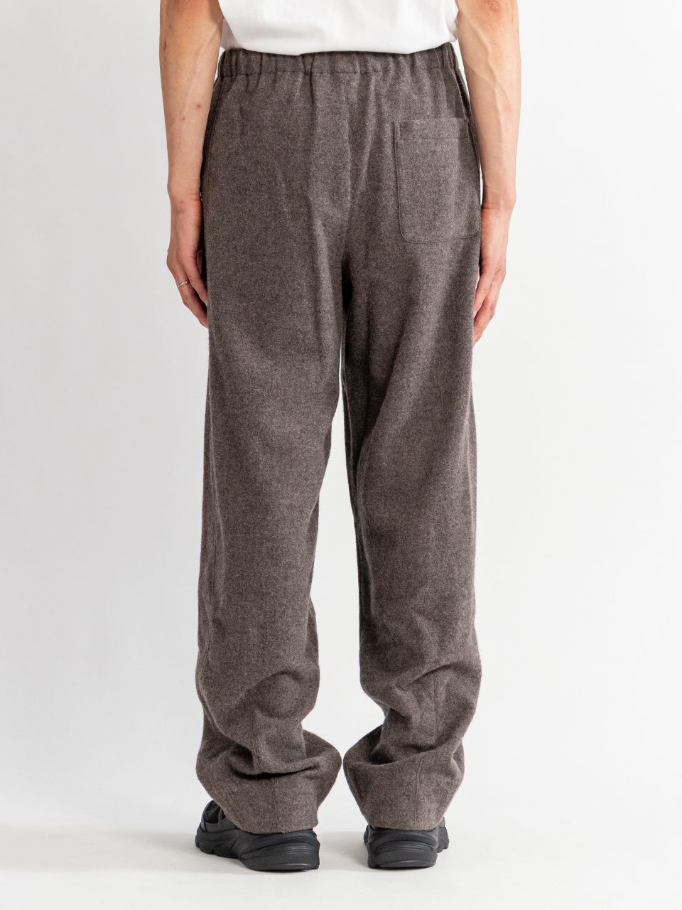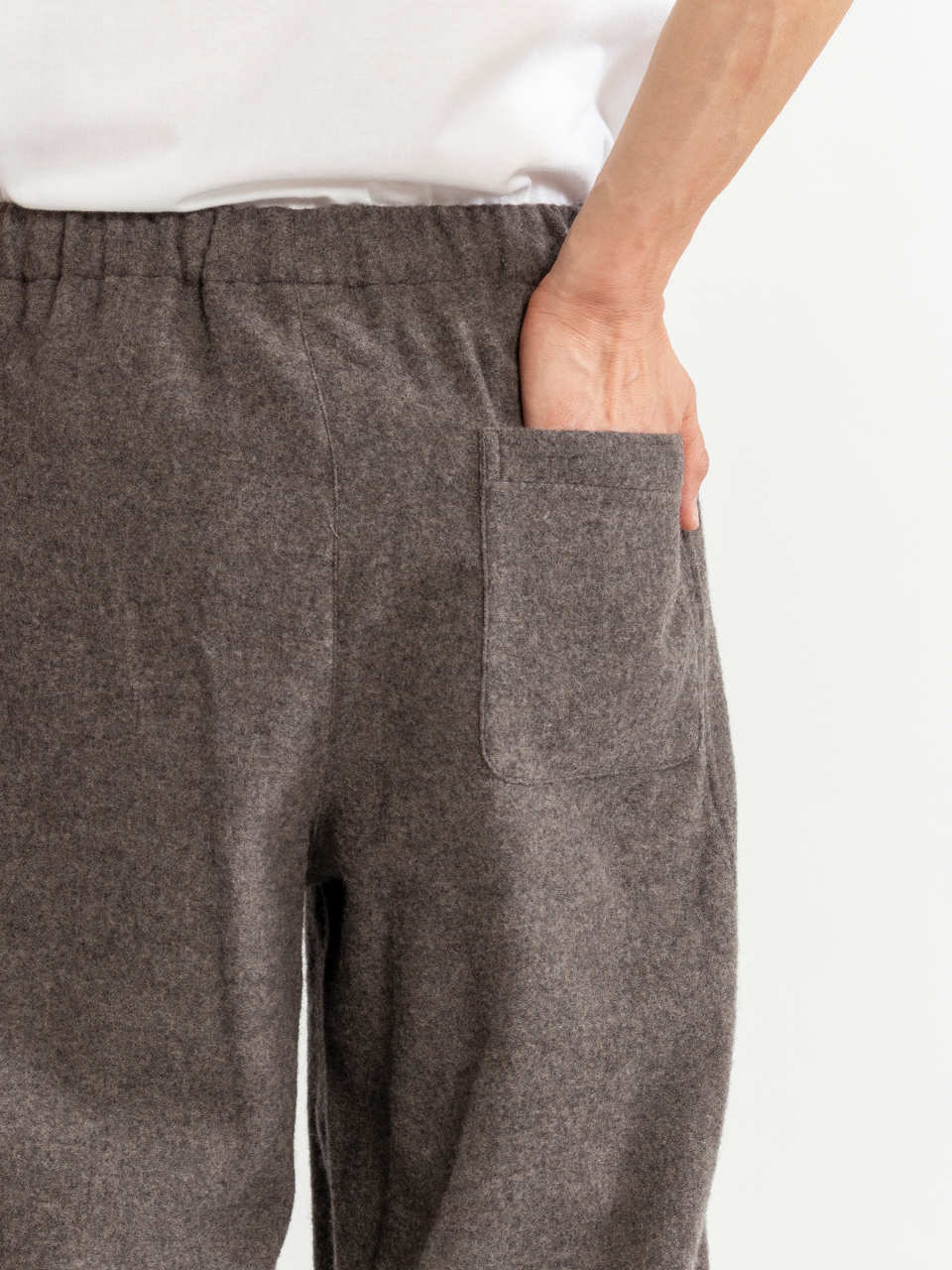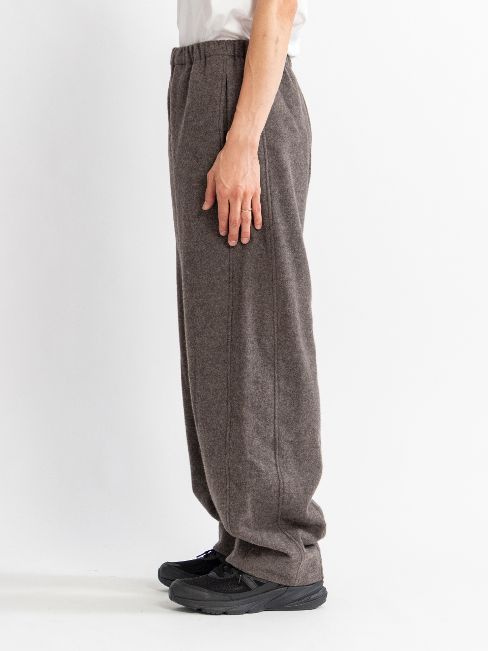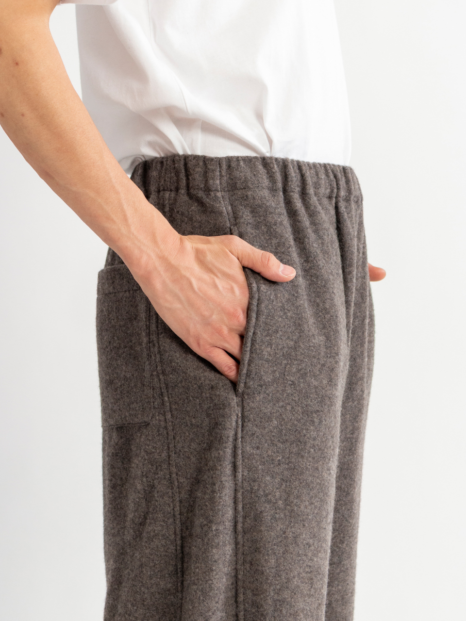 カシミヤの美しい表情と、ウール特有の膨らみ、弾力性を備えた暖かく優しい風合いが特徴のウールカシミヤフリースで製作したイージートラウザーズ。