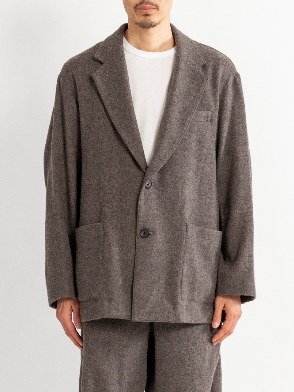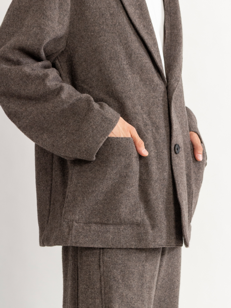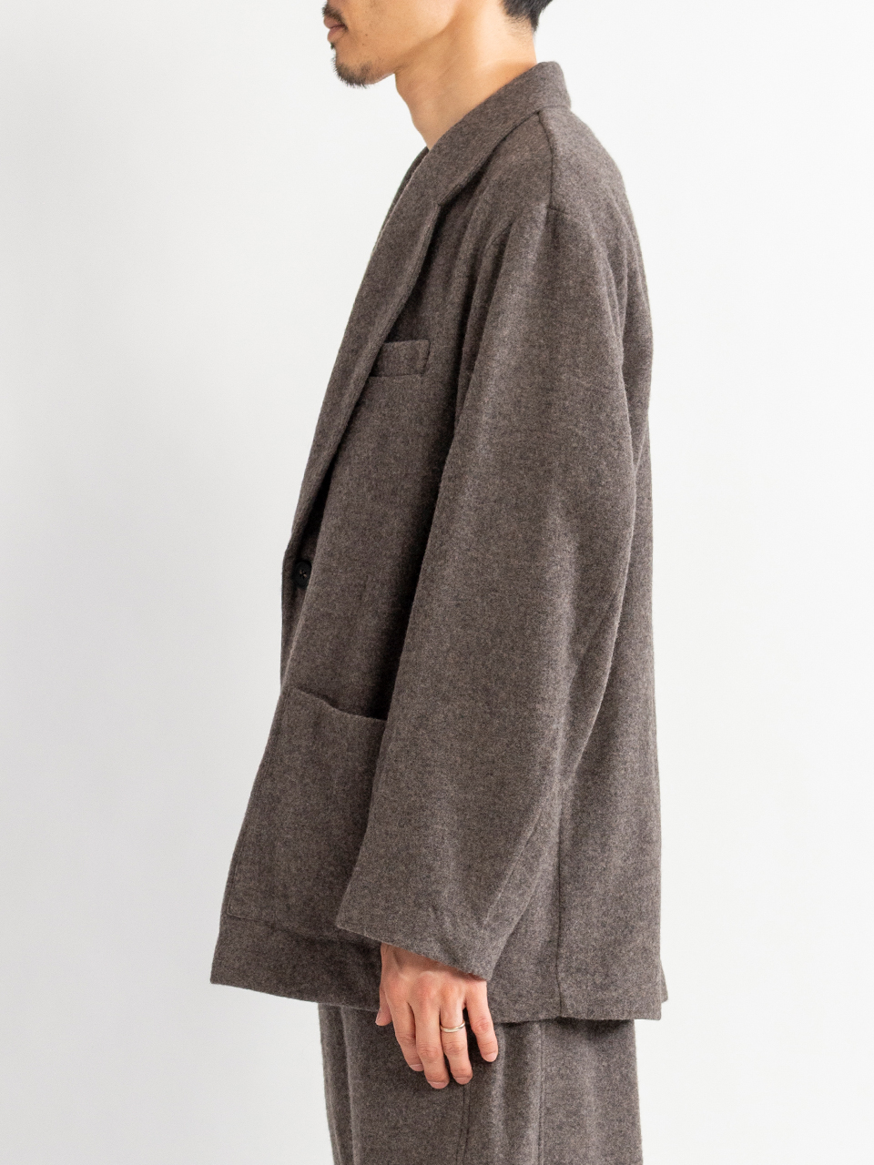 カシミヤの美しい表情と、ウール特有の膨らみ、弾力性を備えた暖かく優しい風合いが特徴のウールカシミヤフリースで製作したシングルジャケット。