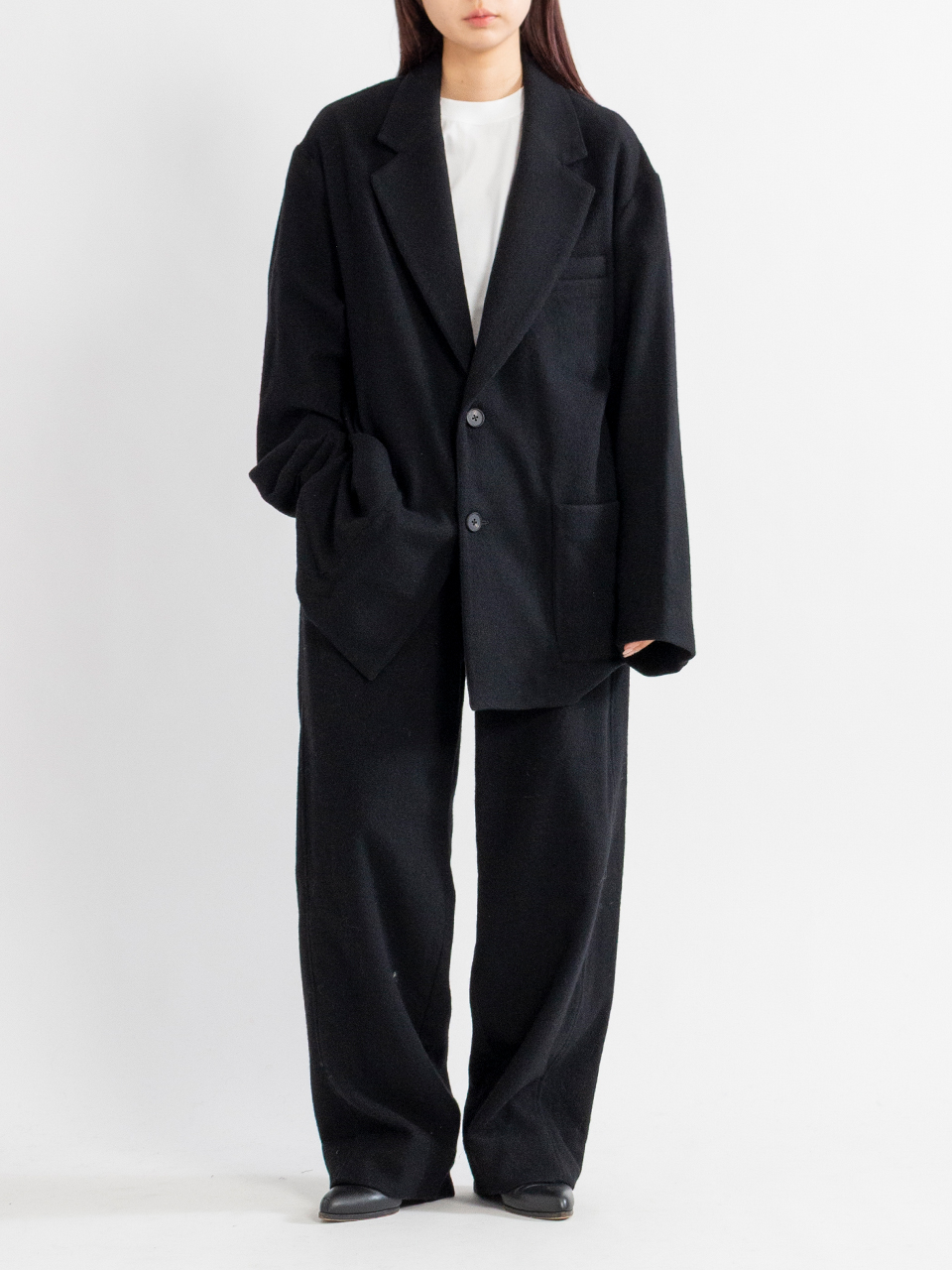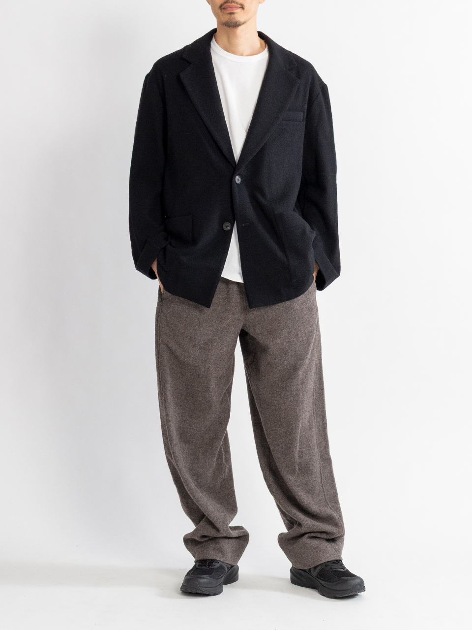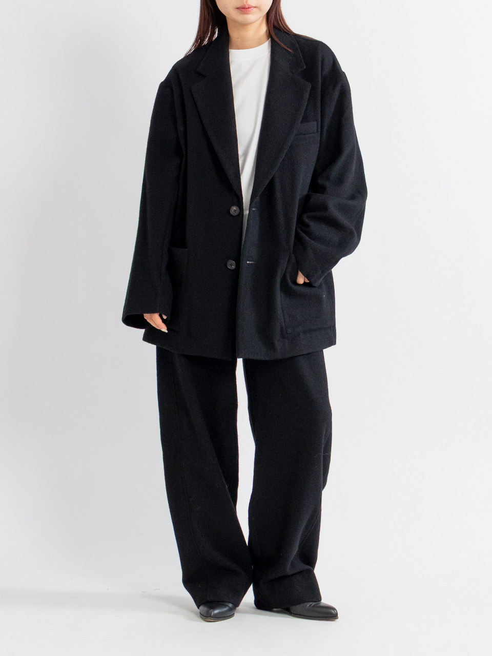カシミヤの美しい表情と、ウール特有の膨らみ、弾力性を備えた暖かく優しい風合いが特徴のウールカシミヤフリースで製作したシングルジャケット。