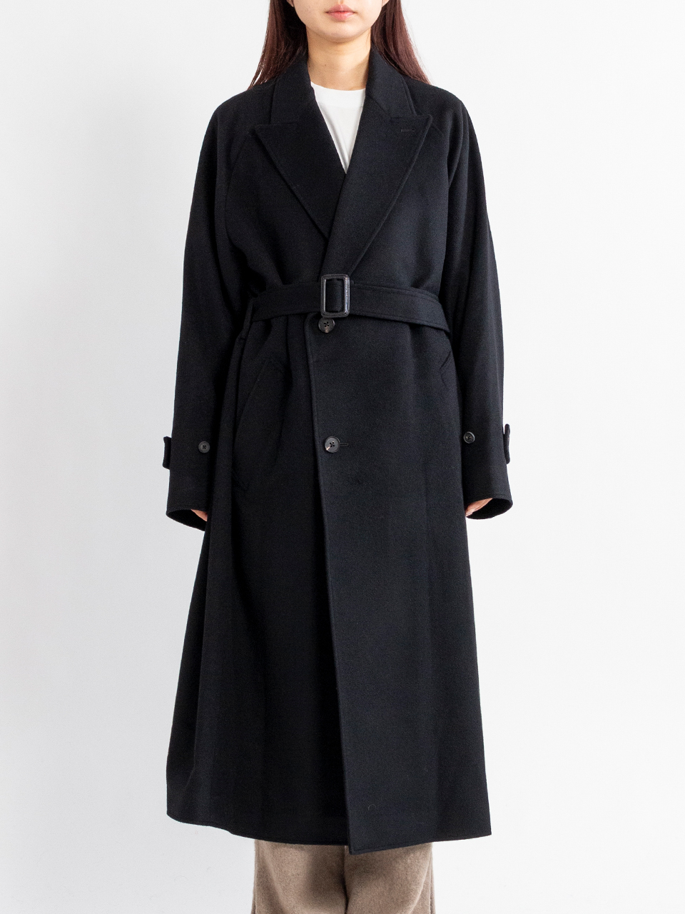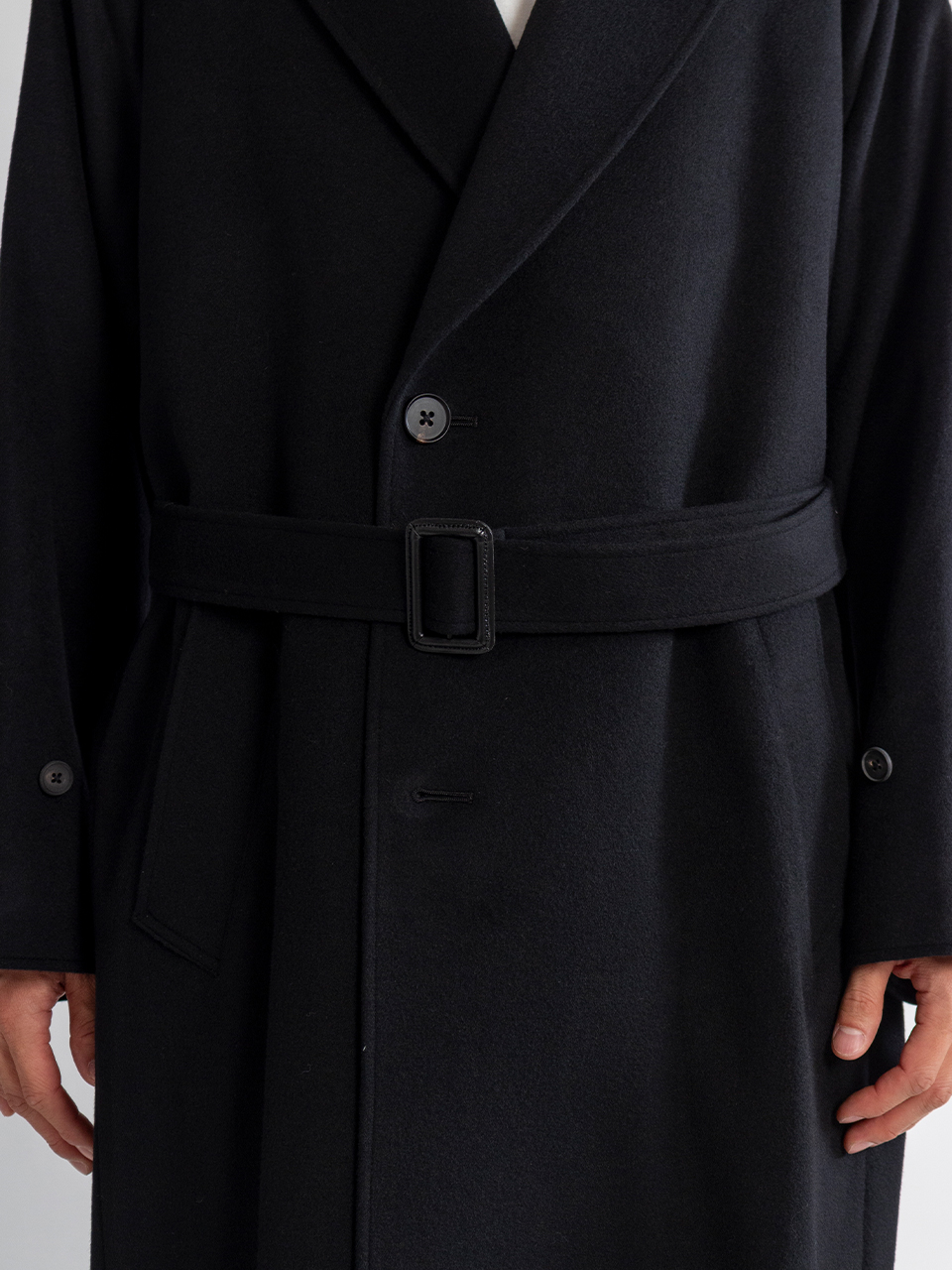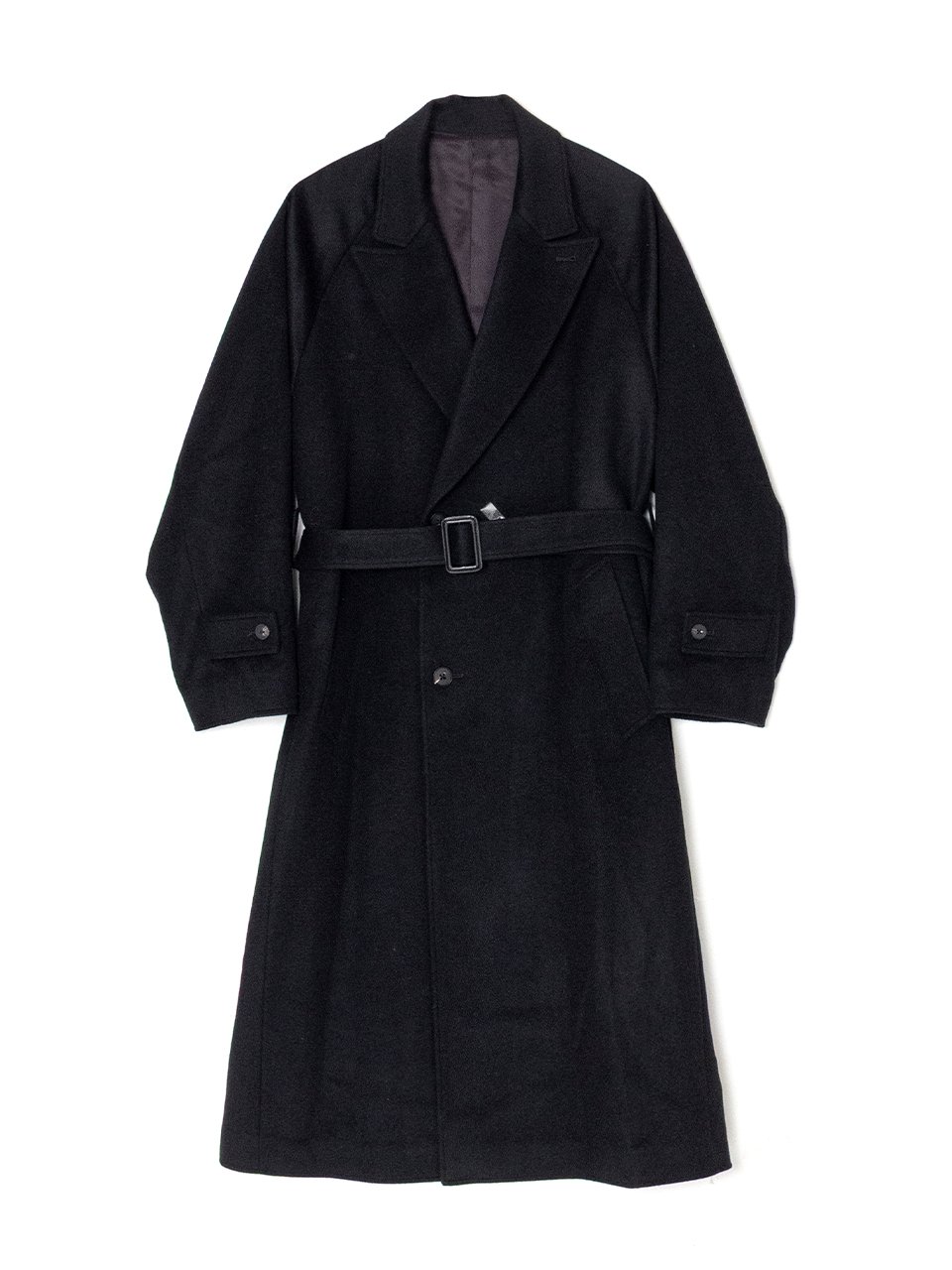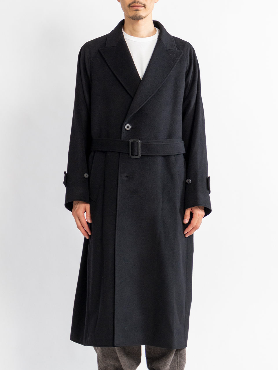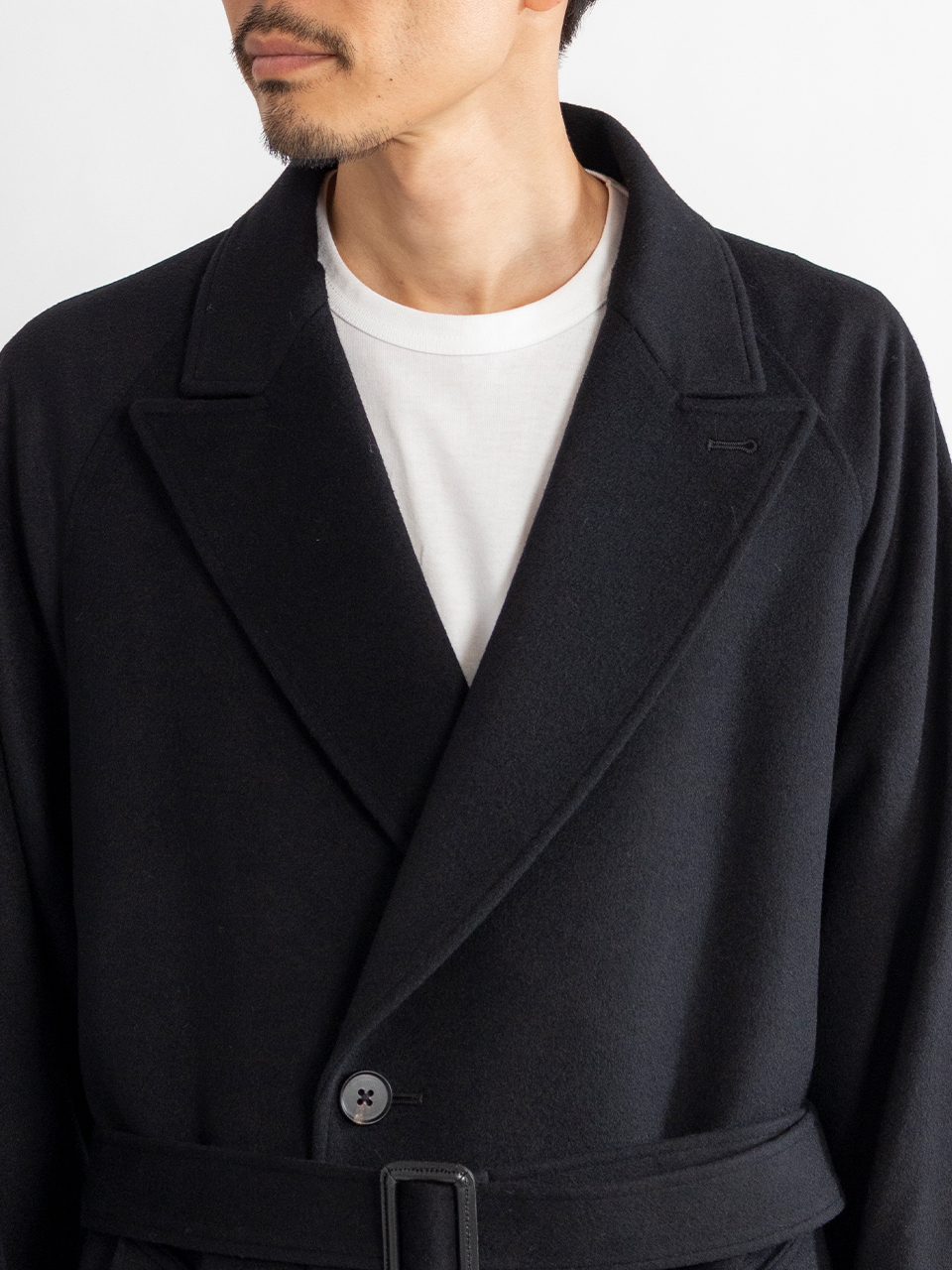 非常に柔らかく、膨らみのある内蒙古産のカシミヤをブレンドしたウールカシミヤビーバーを使用したピークトラペルコート。