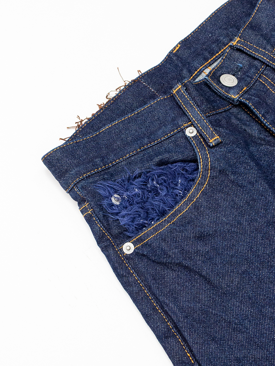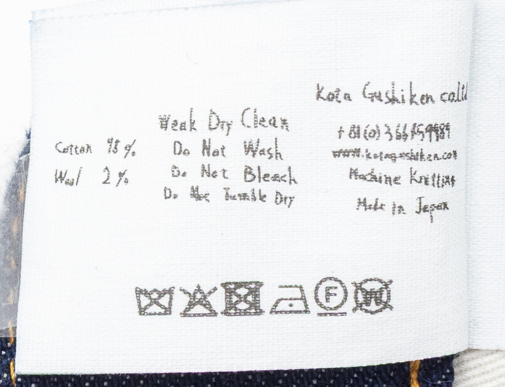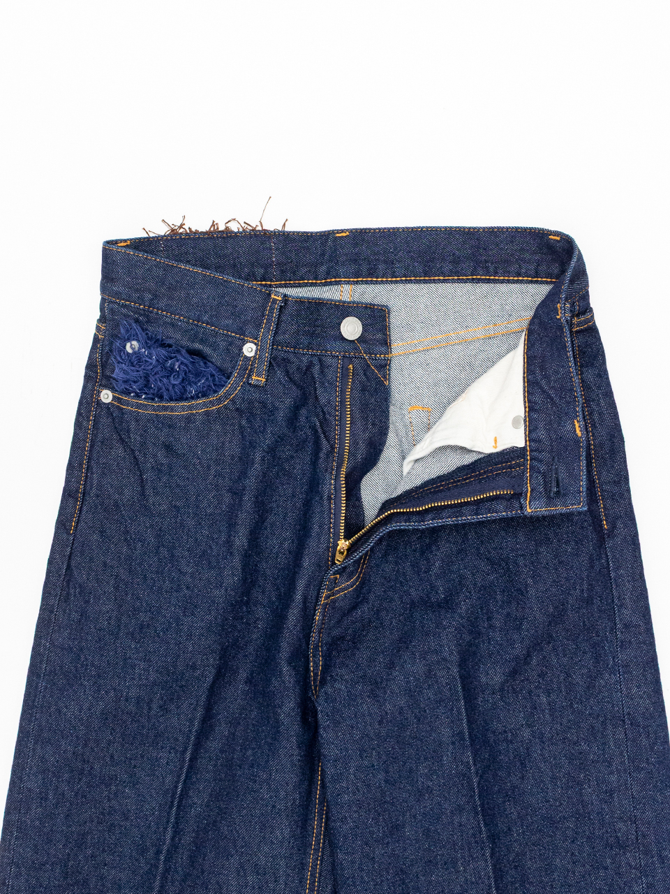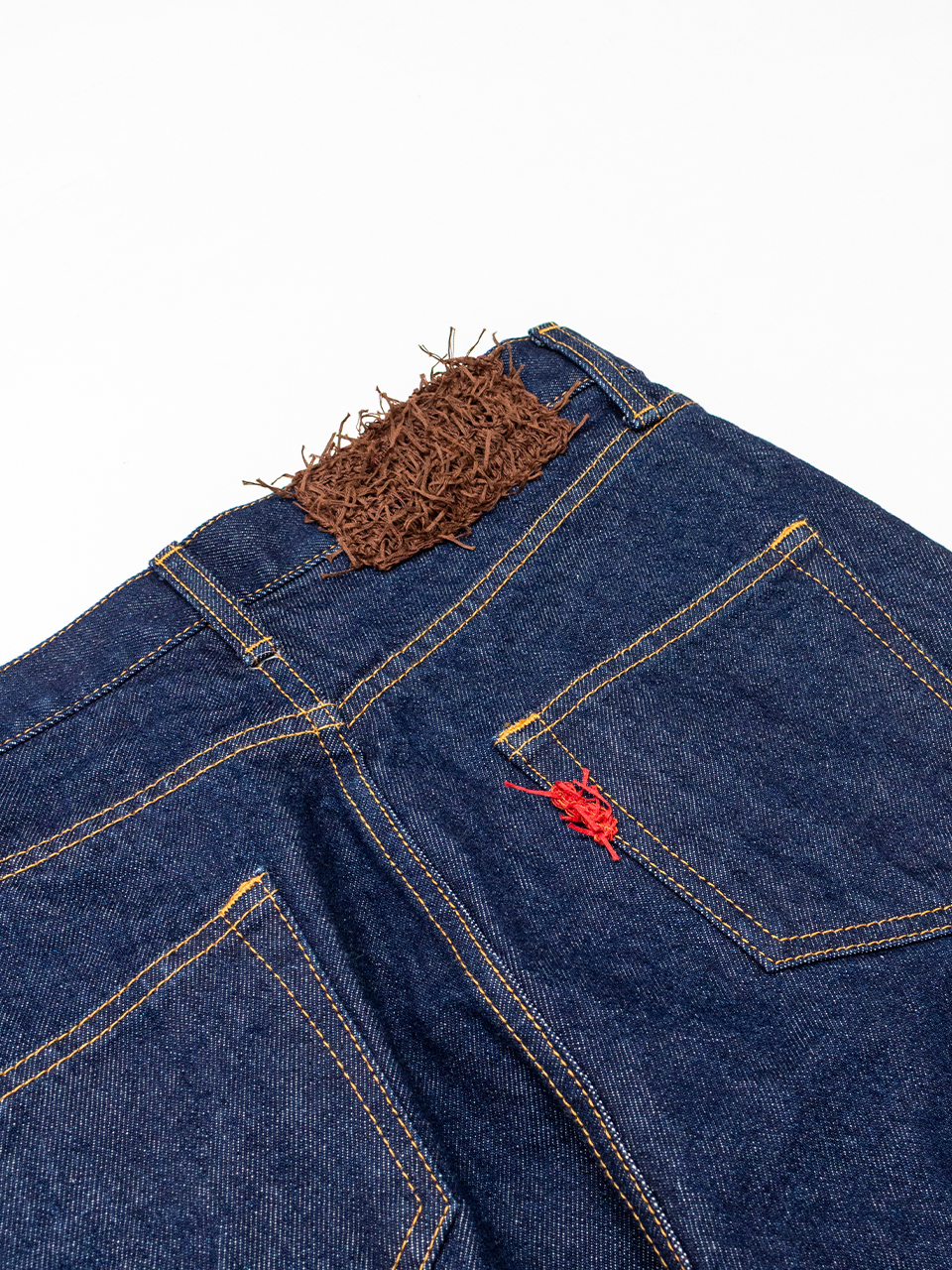 右腰のコインポケット、バックウエストのラベルやセルビッチ部分に至るまでが、クラフト感たっぷりなニット素材で表現されています。