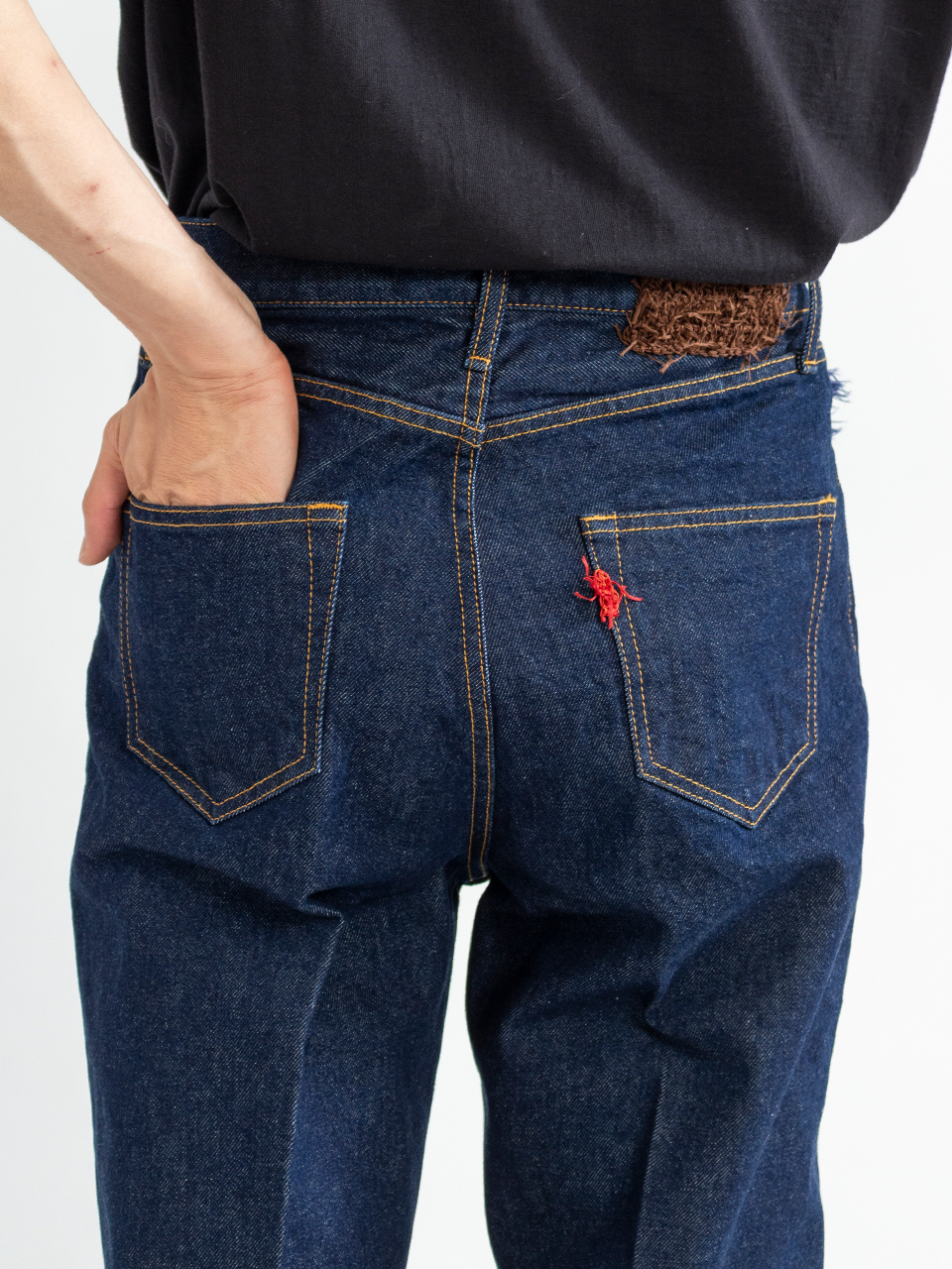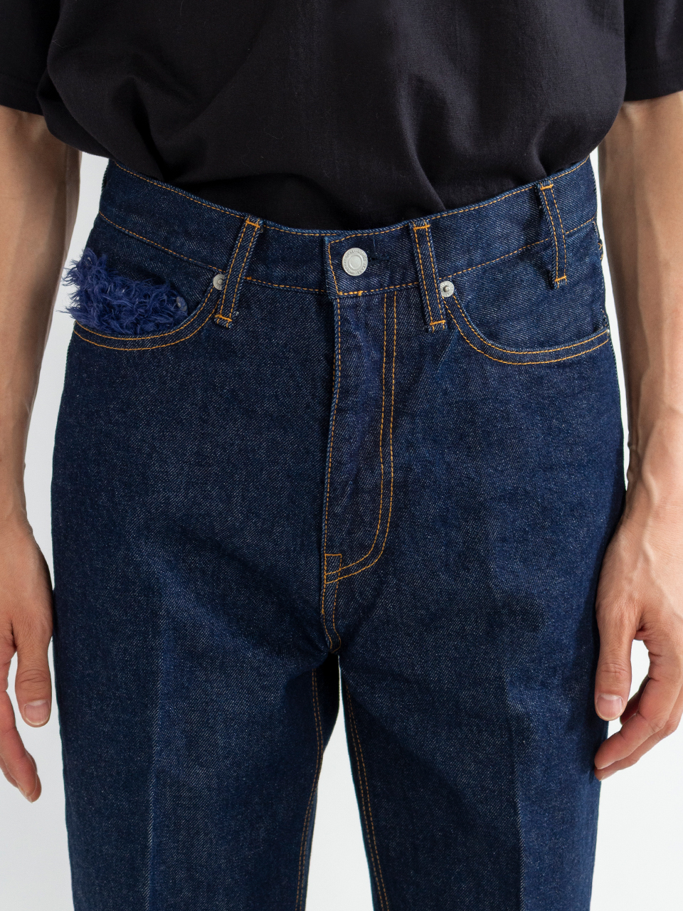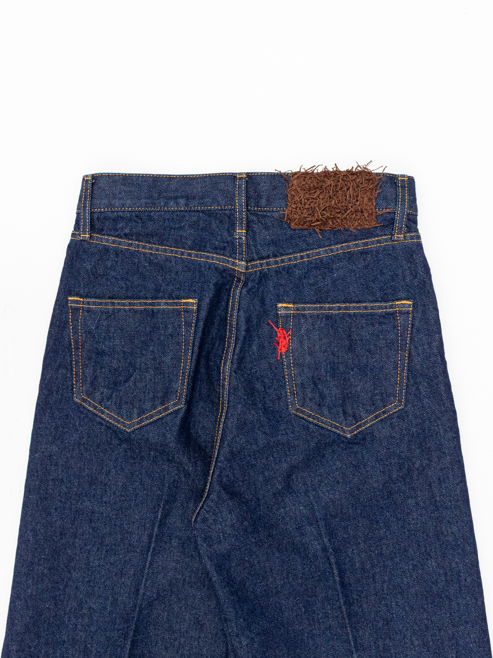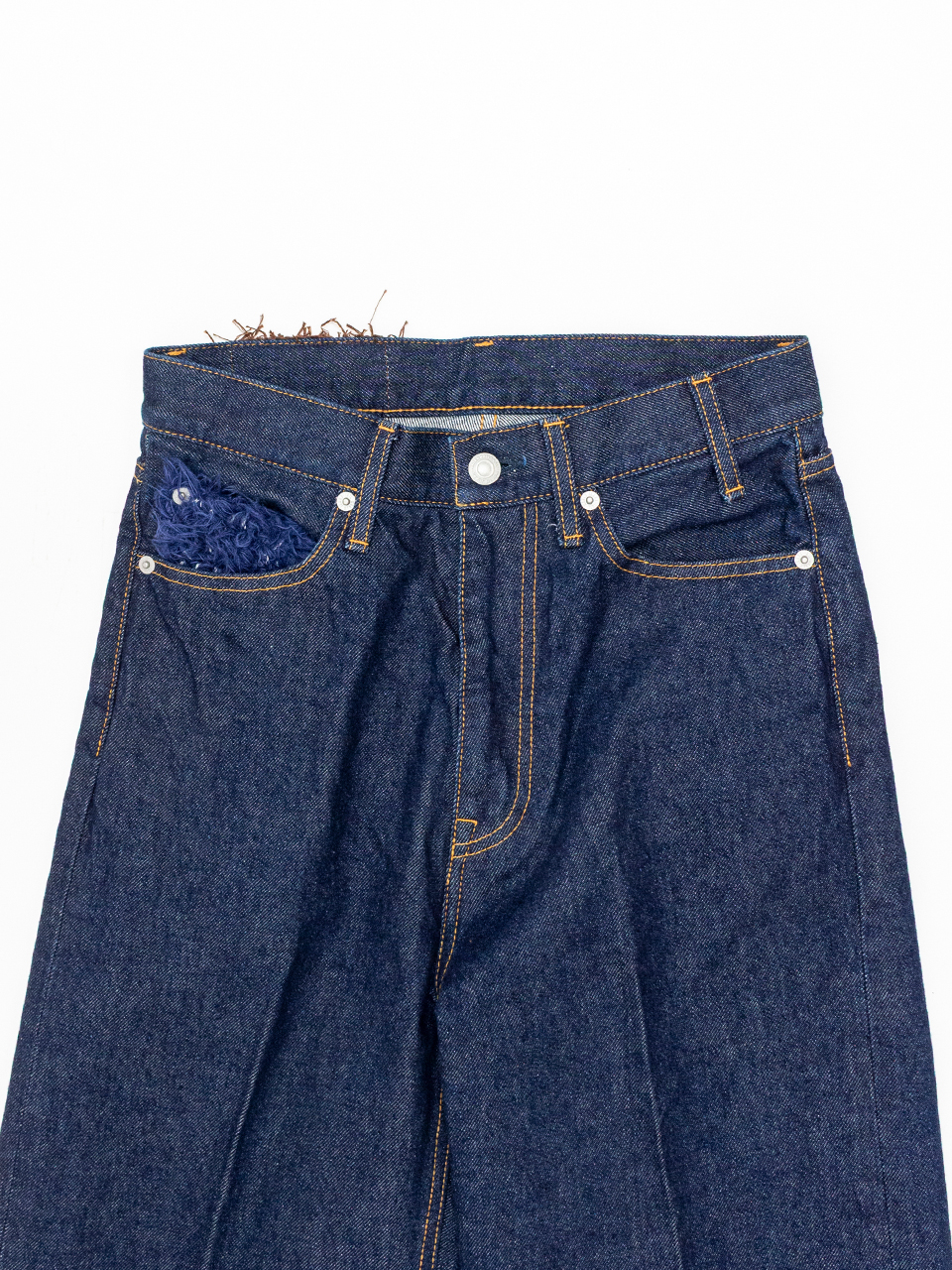 右腰のコインポケット、バックウエストのラベルやセルビッチ部分に至るまでが、クラフト感たっぷりなニット素材で表現されています。