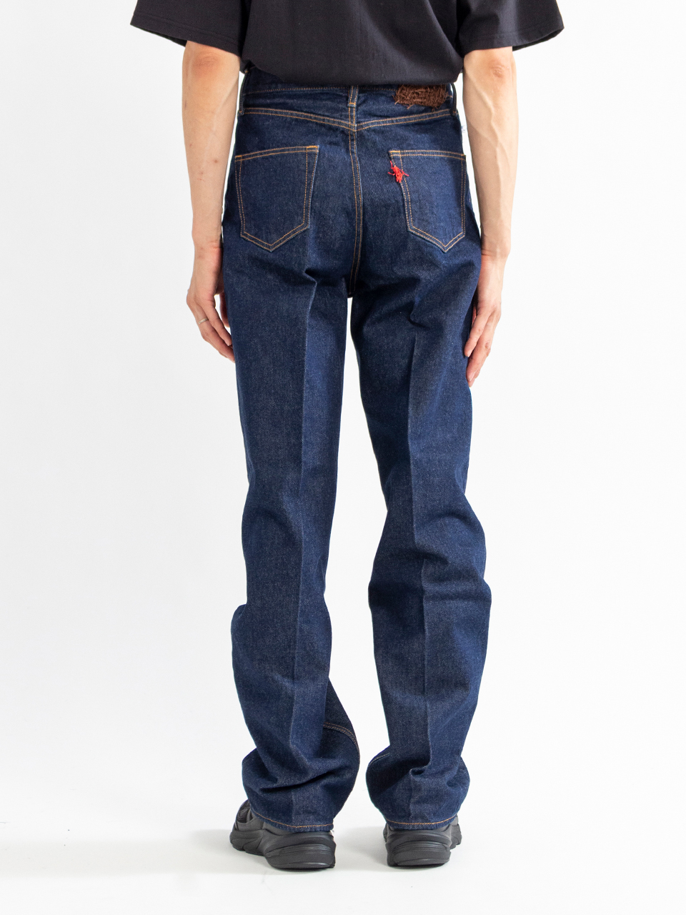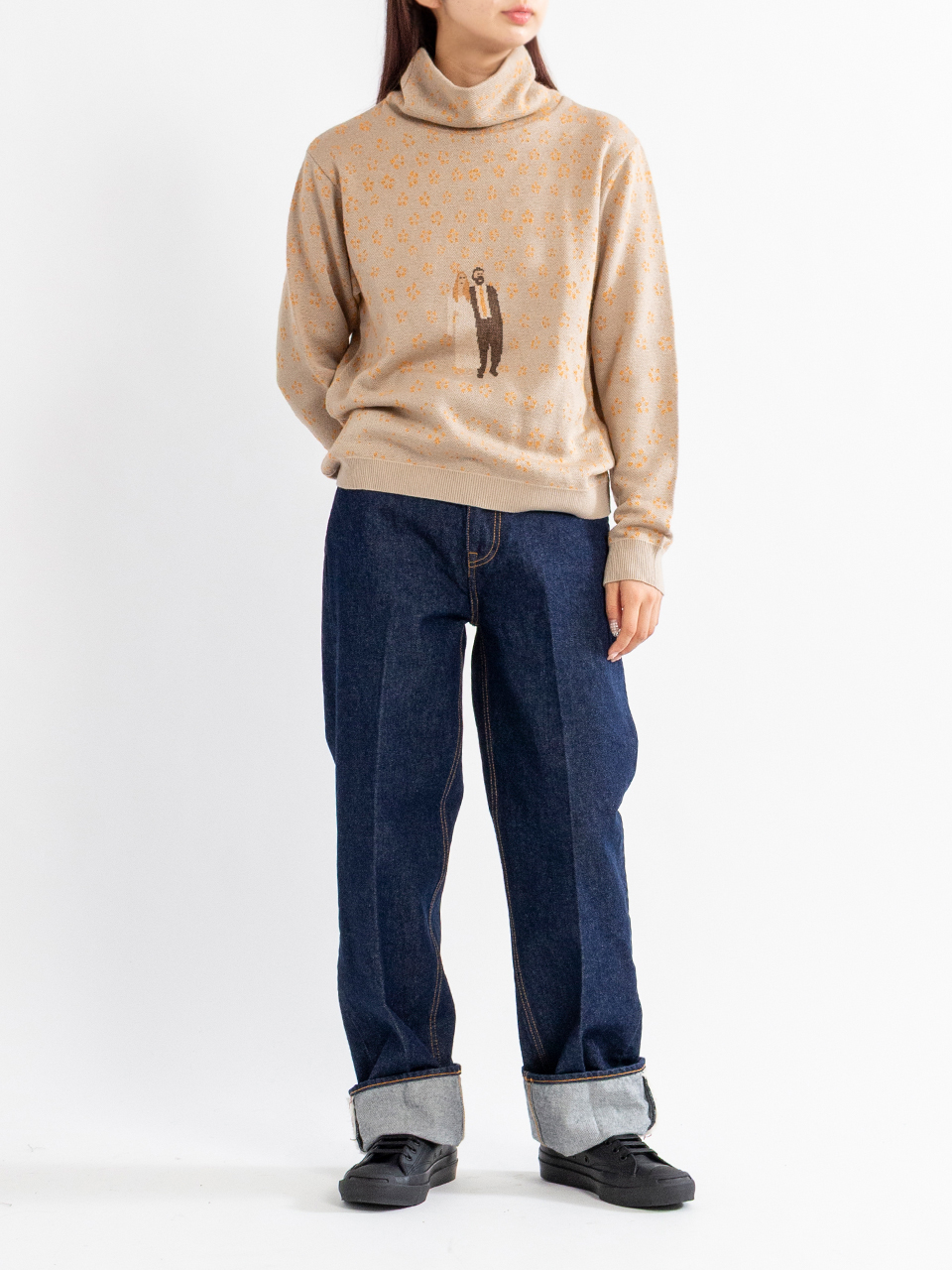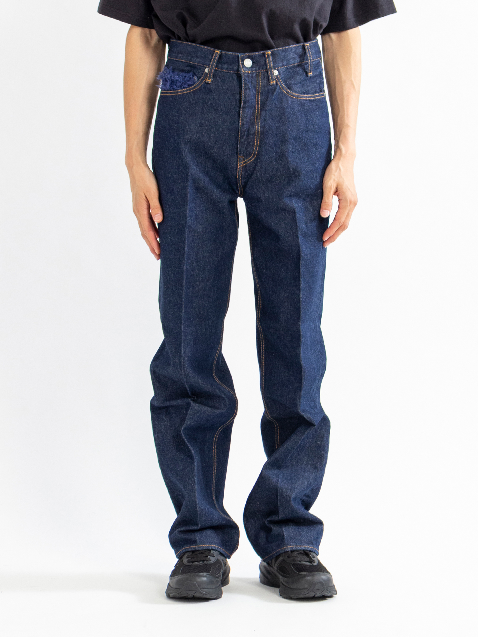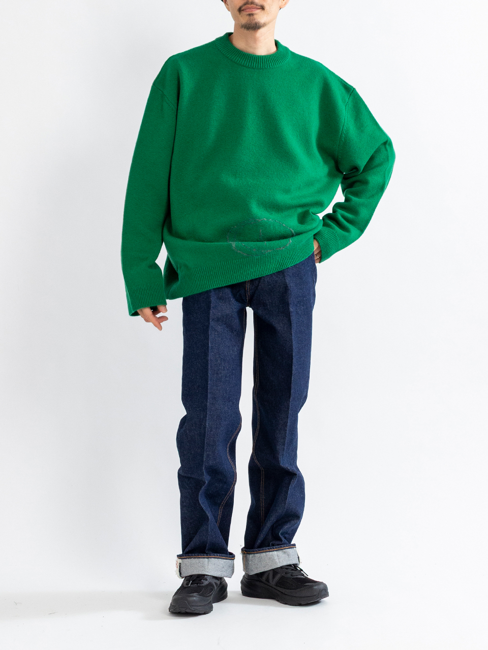右腰のコインポケット、バックウエストのラベルやセルビッチ部分に至るまでが、クラフト感たっぷりなニット素材で表現されています。