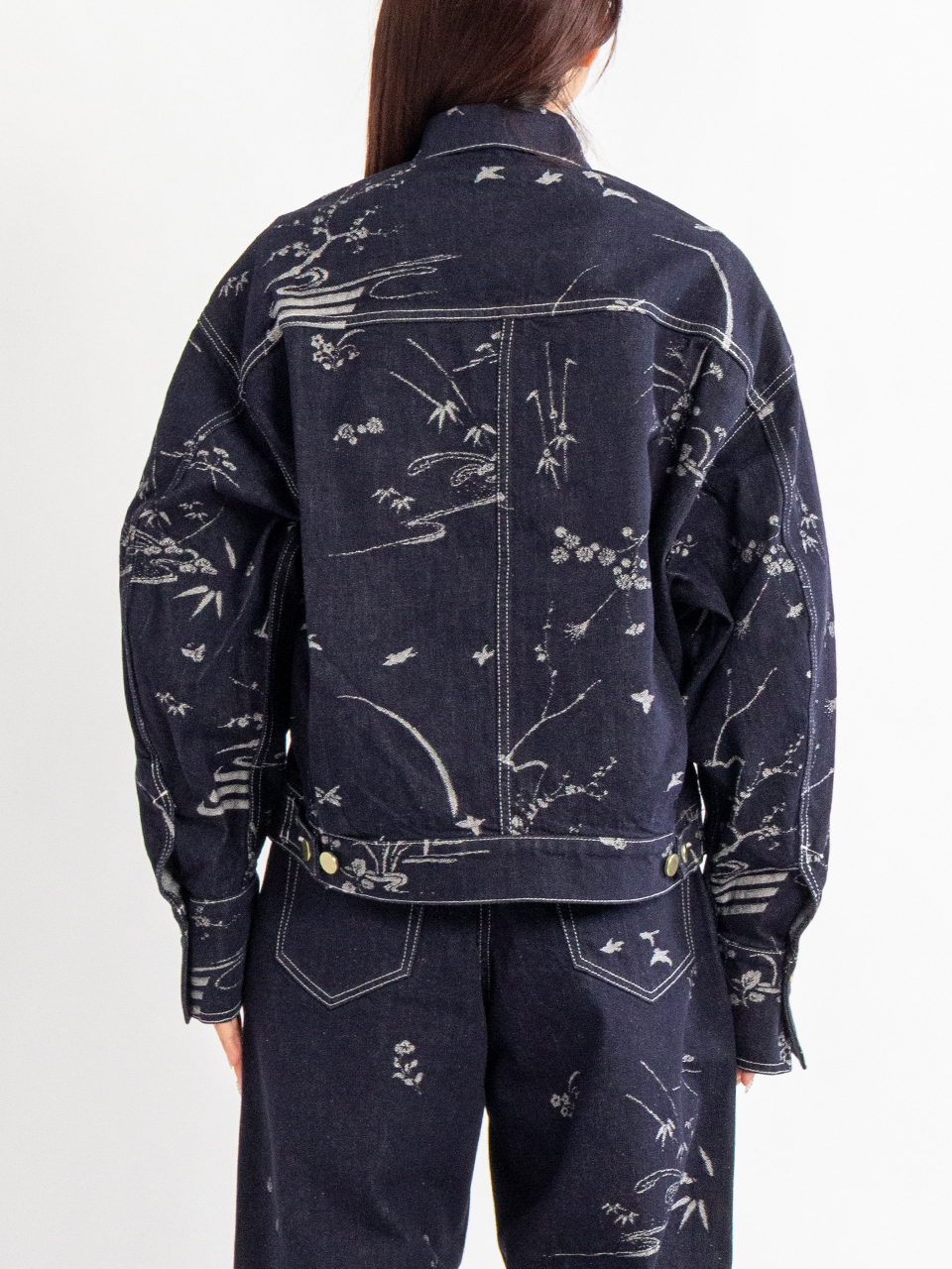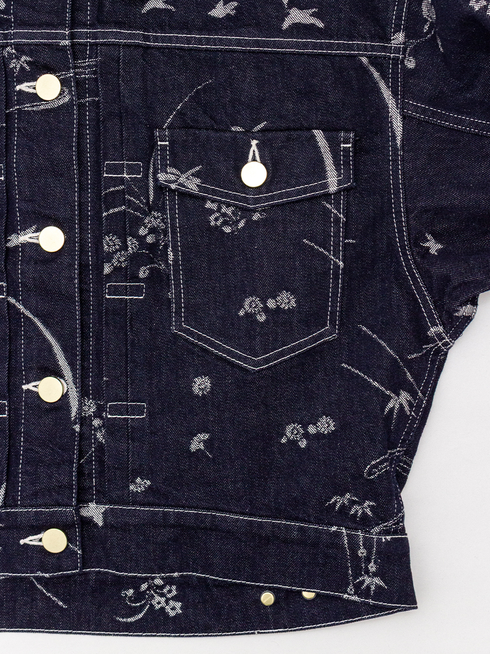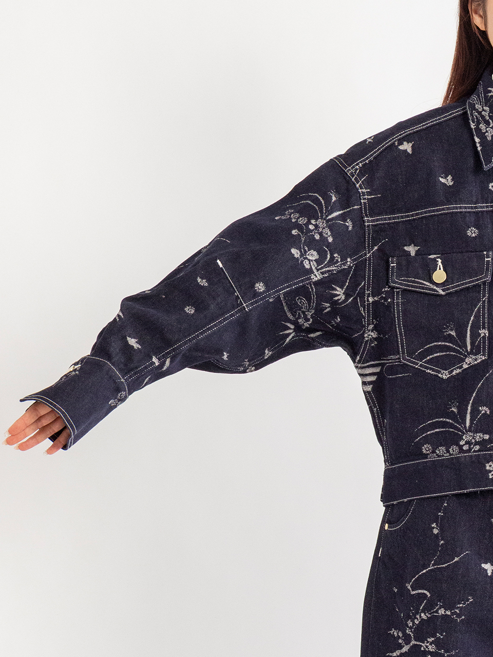 琉球漆器・織物をインスピレーションにした花鳥柄ジャカードのデニムジャケット。