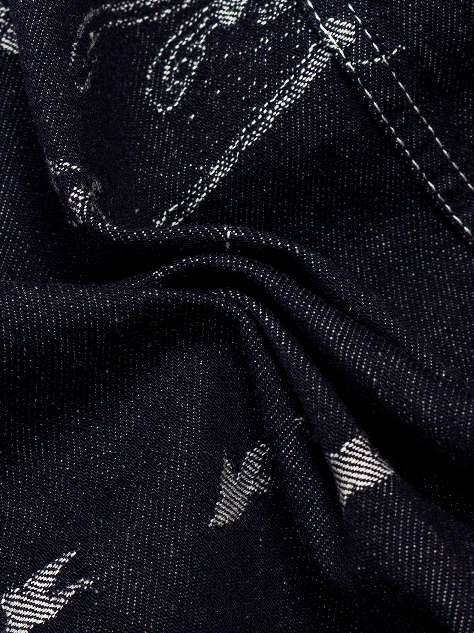 ワンウォッシュ加工でインディゴの深みと柄のコントラストが際立ちます。