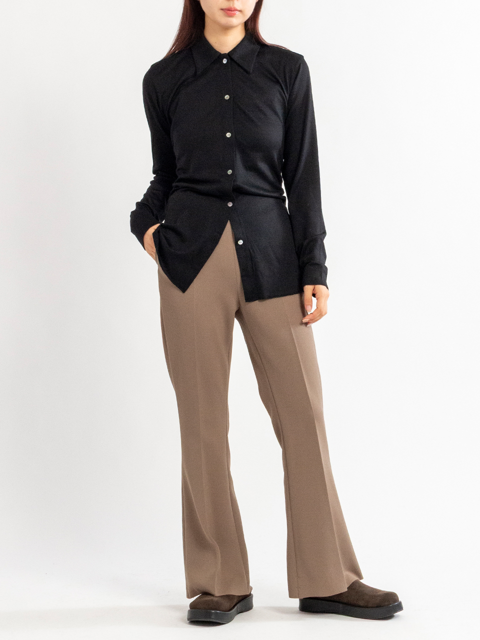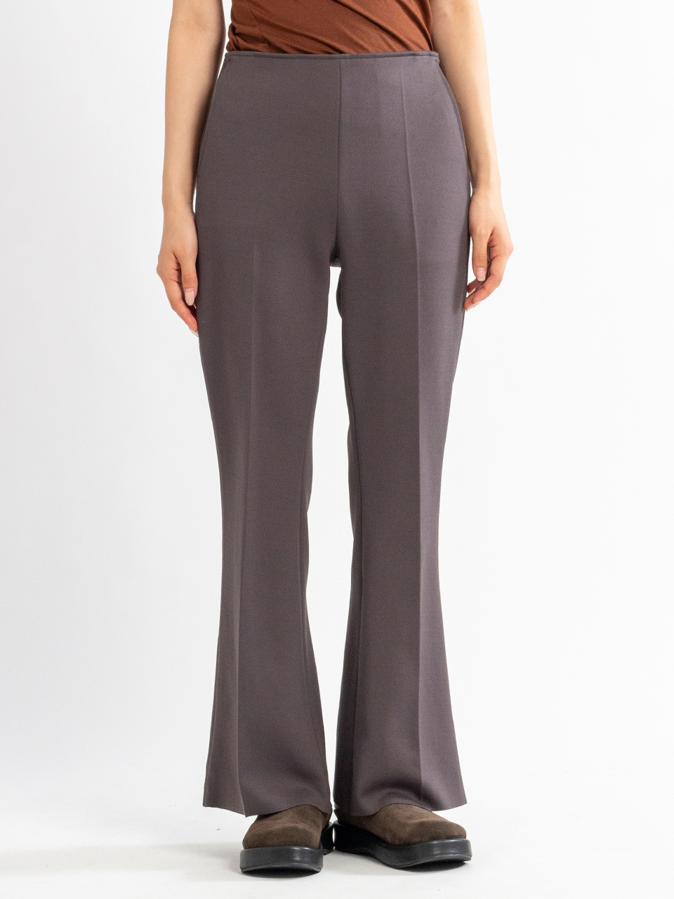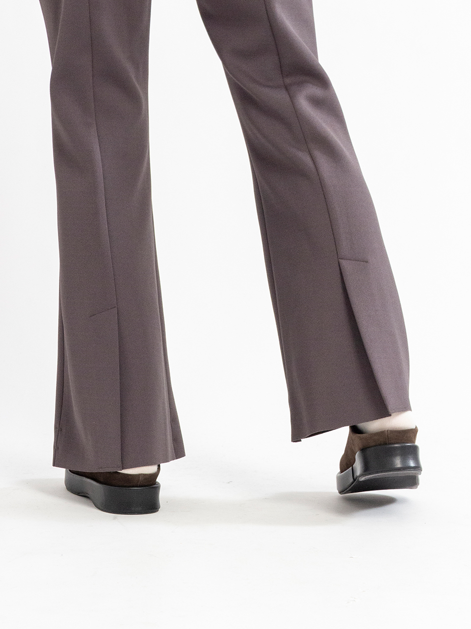 フレアシルエットにセンタークリースを入れ、 縦ラインを強調して足を綺麗に見せてくれます。