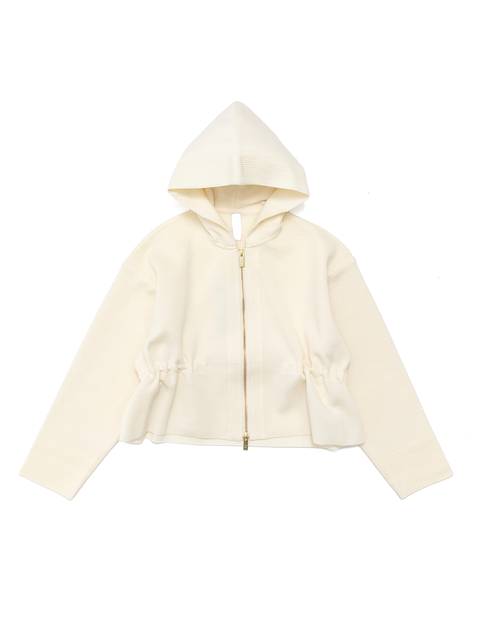 woolを用いた柔らかなミラノリブの編み方が特徴的なフーディ
