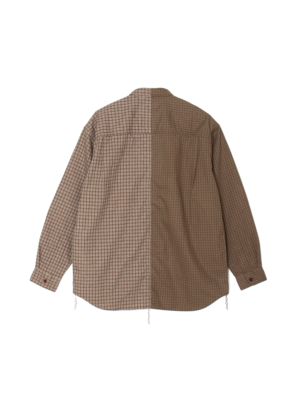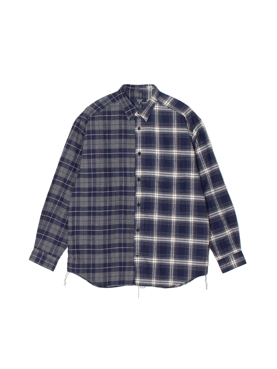 2種類のコットンフランネルチェック生地をドッキングしたレギュラーカラーシャツ。